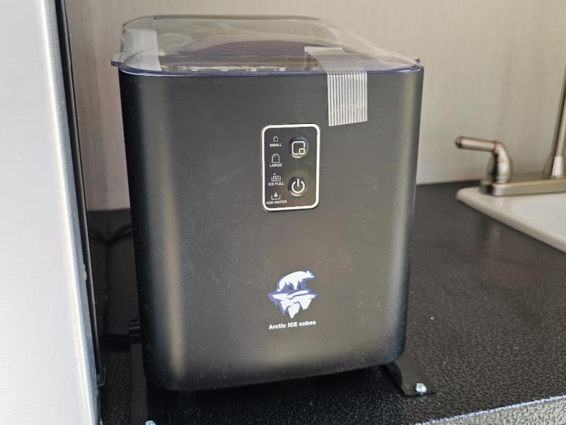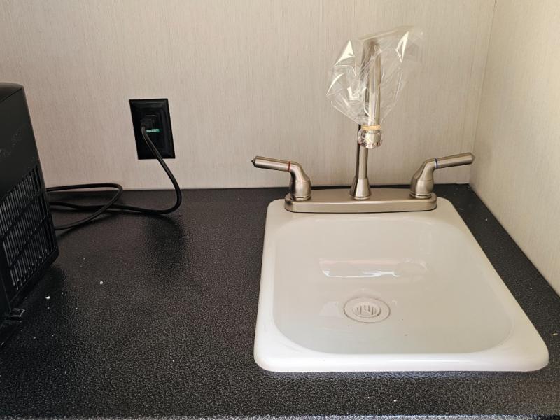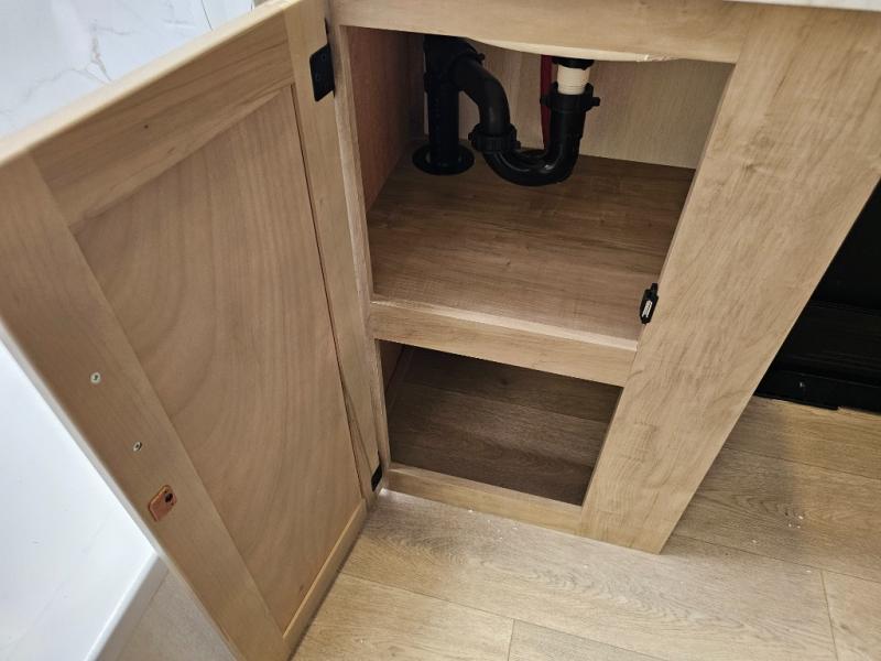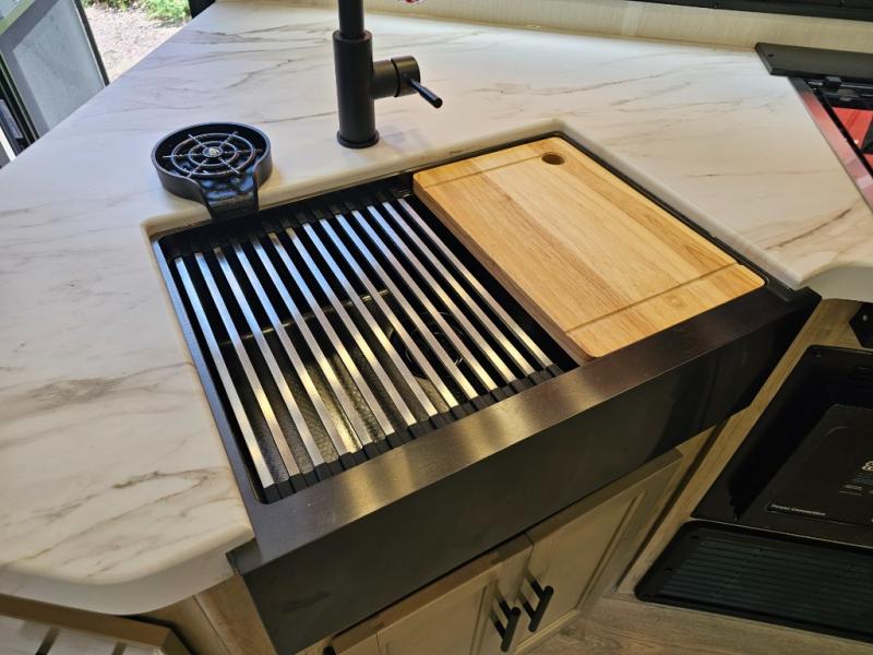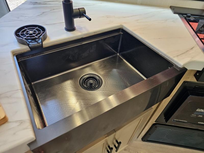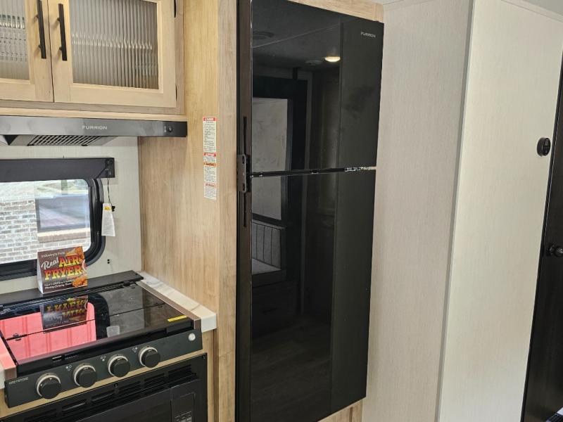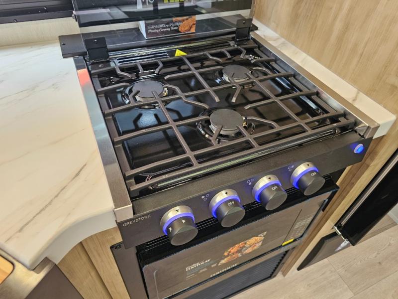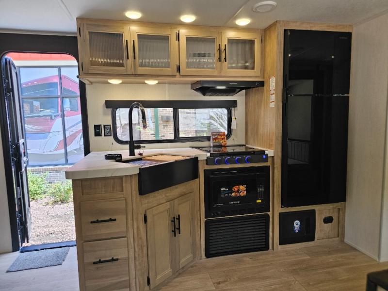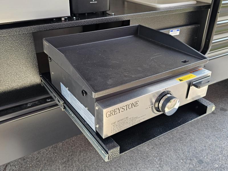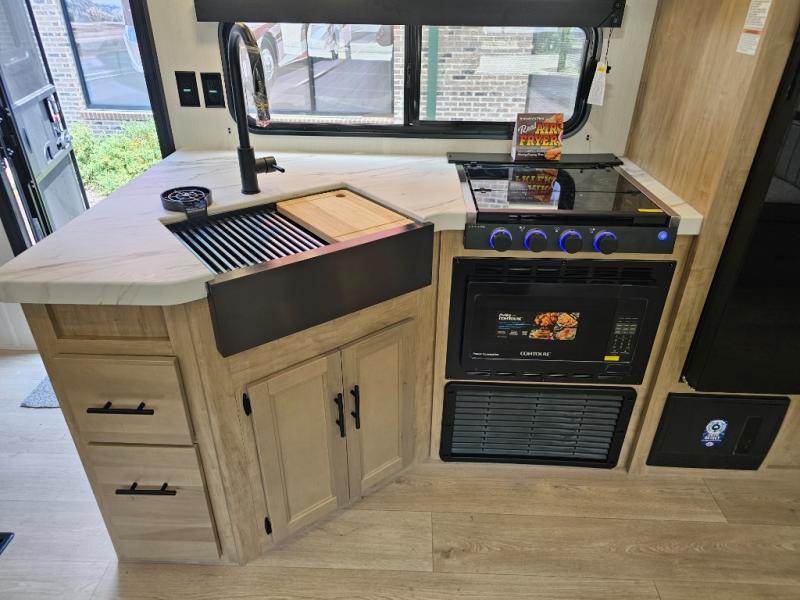 Fully Equipped Indoor Kitchen with three burner cooktop, 12V refrigerator, and air fryer microwave