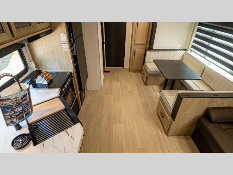 Double slides create spacious living areas in this travel trailer! The chef can prepare their best meals either indoors with the three burner cooktop and air fryer microwave, or at the outdoor kitchen. The kids or guests can sleep in the rear private bunkhouse with a bunk, double bunk, and flip-up bunk above a sofa. The front private bedroom has a walk around RV king bed for a great night's rest plus dual closets to keep your things organized. In the morning, everyone can meet in the combined kitchen and living room around the U-shaped dinette and sofa, and the fireplace here will make it feel more like home.