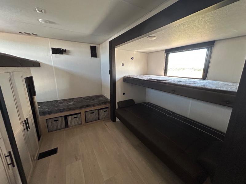 Double slides create spacious living areas in this travel trailer! The chef can prepare their best meals either indoors with the three burner cooktop and air fryer microwave, or at the outdoor kitchen. The kids or guests can sleep in the rear private bunkhouse with a bunk, double bunk, and flip-up bunk above a sofa. The front private bedroom has a walk around RV king bed for a great night's rest plus dual closets to keep your things organized. In the morning, everyone can meet in the combined kitchen and living room around the U-shaped dinette and sofa, and the fireplace here will make it feel more like home.