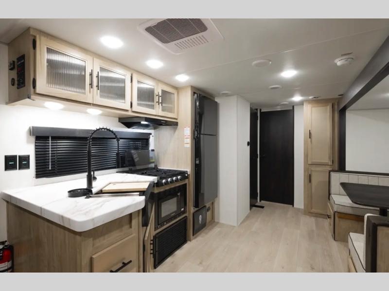 Double slides create spacious living areas in this travel trailer! The chef can prepare their best meals either indoors with the three burner cooktop and air fryer microwave, or at the outdoor kitchen. The kids or guests can sleep in the rear private bunkhouse with a bunk, double bunk, and flip-up bunk above a sofa. The front private bedroom has a walk around RV king bed for a great night's rest plus a wardrobe to keep your things organized. In the morning, everyone can meet in the combined kitchen and living room around the U-shaped dinette and sofa, and the fireplace here will make it feel more like home.