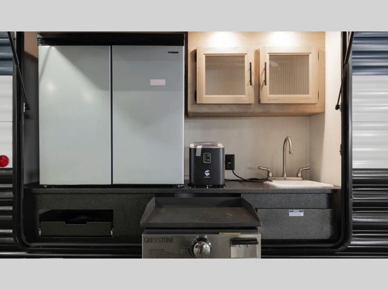 Double slides create spacious living areas in this travel trailer! The chef can prepare their best meals either indoors with the three burner cooktop and air fryer microwave, or at the outdoor kitchen. The kids or guests can sleep in the rear private bunkhouse with a bunk, double bunk, and flip-up bunk above a sofa. The front private bedroom has a walk around RV king bed for a great night's rest plus a wardrobe to keep your things organized. In the morning, everyone can meet in the combined kitchen and living room around the U-shaped dinette and sofa, and the fireplace here will make it feel more like home.