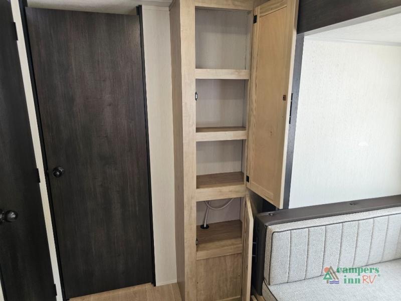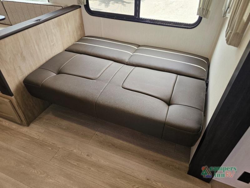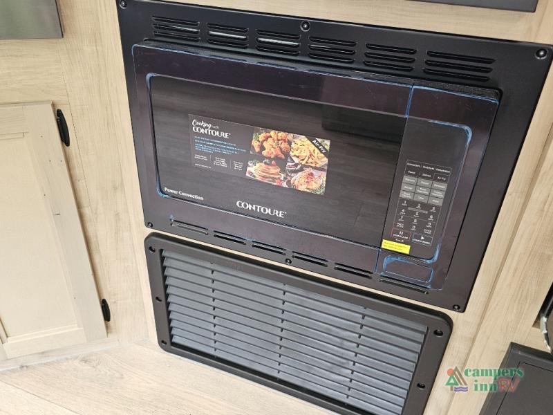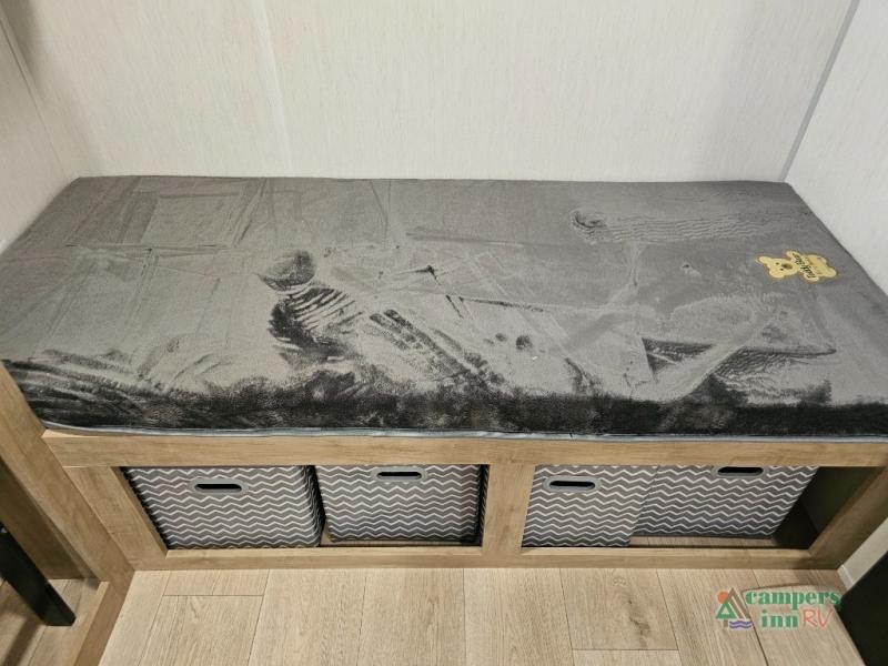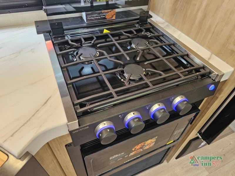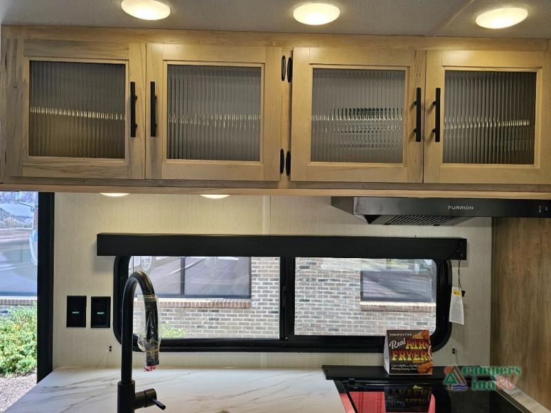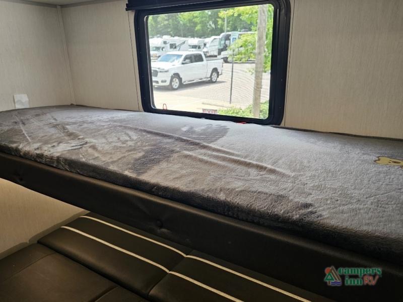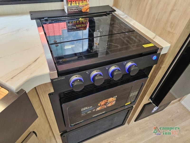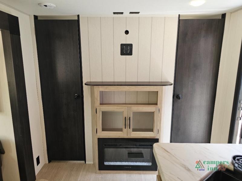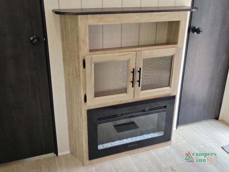 Double slides create spacious living areas in this travel trailer! The chef can prepare their best meals either indoors with the three burner cooktop and air fryer microwave, or at the outdoor kitchen. The kids or guests can sleep in the rear private bunkhouse with a bunk, double bunk, and flip-up bunk above a sofa. The front private bedroom has a walk around RV king bed for a great night's rest plus a wardrobe to keep your things organized. In the morning, everyone can meet in the combined kitchen and living room around the U-shaped dinette and sofa, and the fireplace here will make it feel more like home.