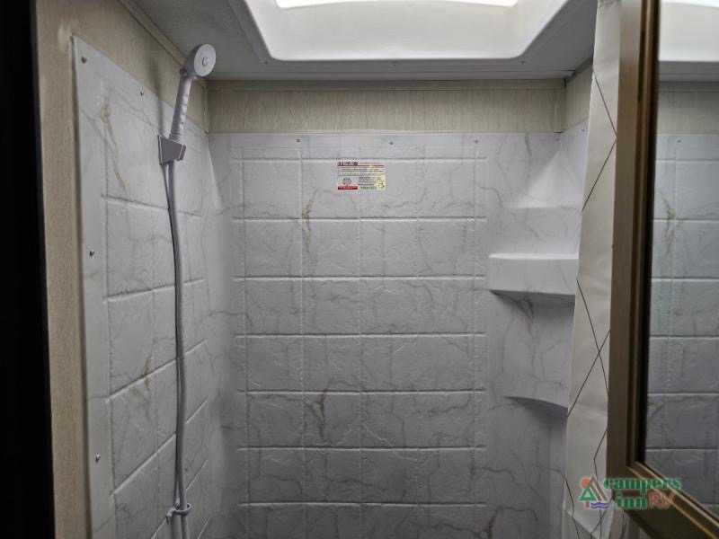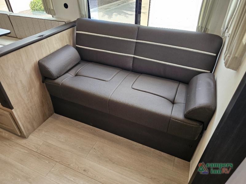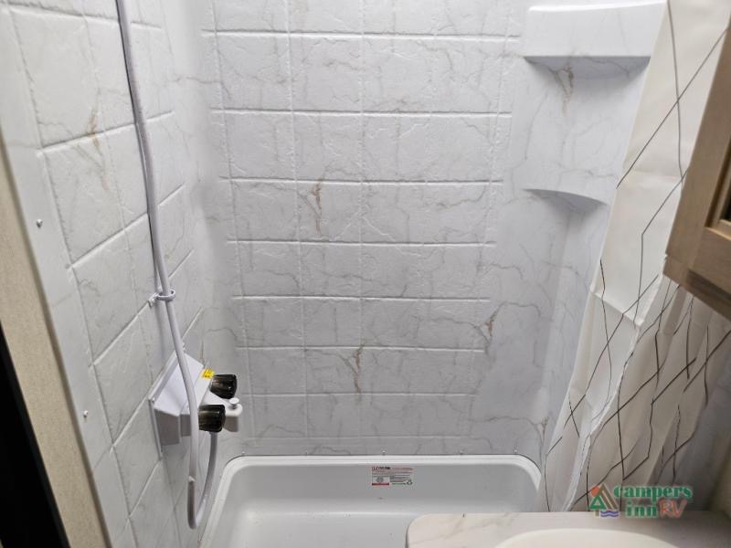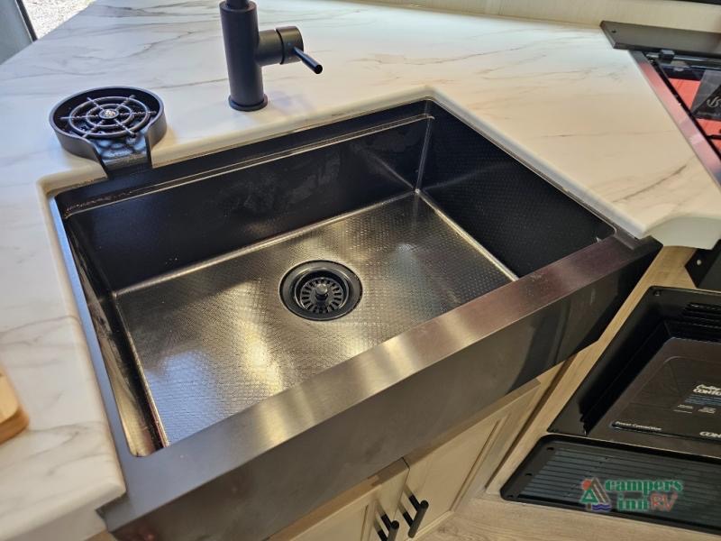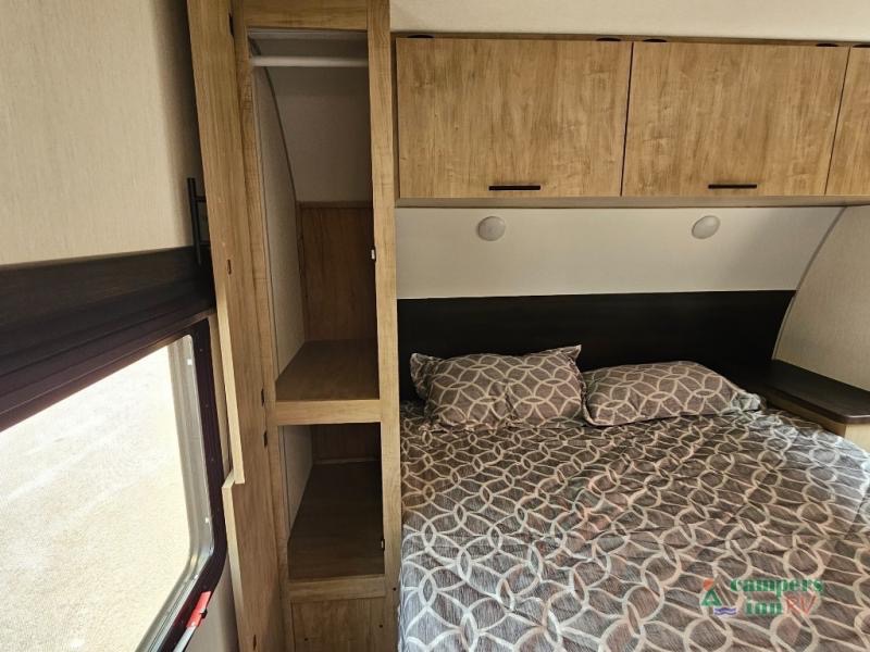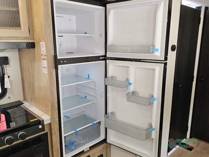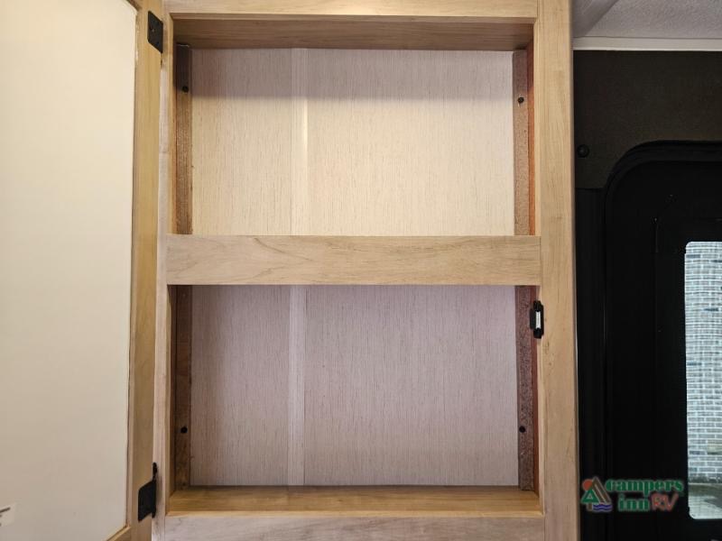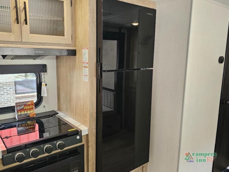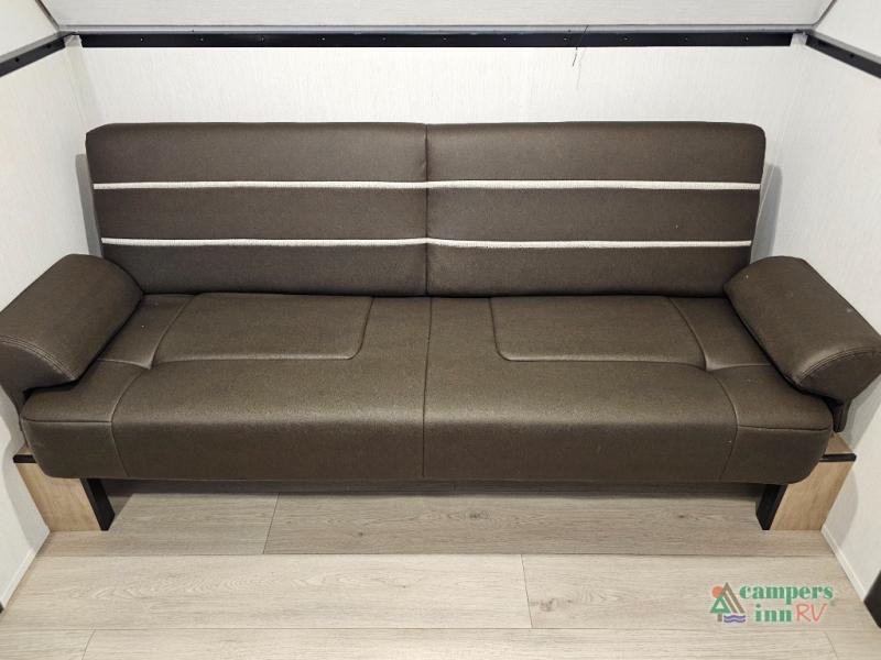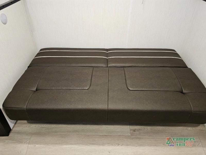 Double slides create spacious living areas in this travel trailer! The chef can prepare their best meals either indoors with the three burner cooktop and air fryer microwave, or at the outdoor kitchen. The kids or guests can sleep in the rear private bunkhouse with a bunk, double bunk, and flip-up bunk above a sofa. The front private bedroom has a walk around RV king bed for a great night's rest plus a wardrobe to keep your things organized. In the morning, everyone can meet in the combined kitchen and living room around the U-shaped dinette and sofa, and the fireplace here will make it feel more like home.