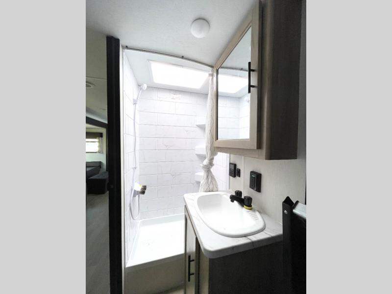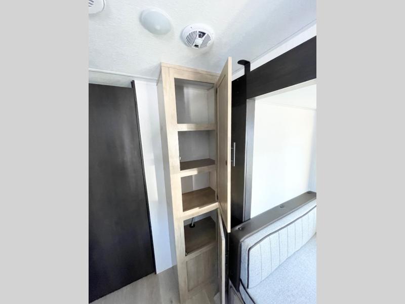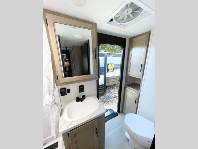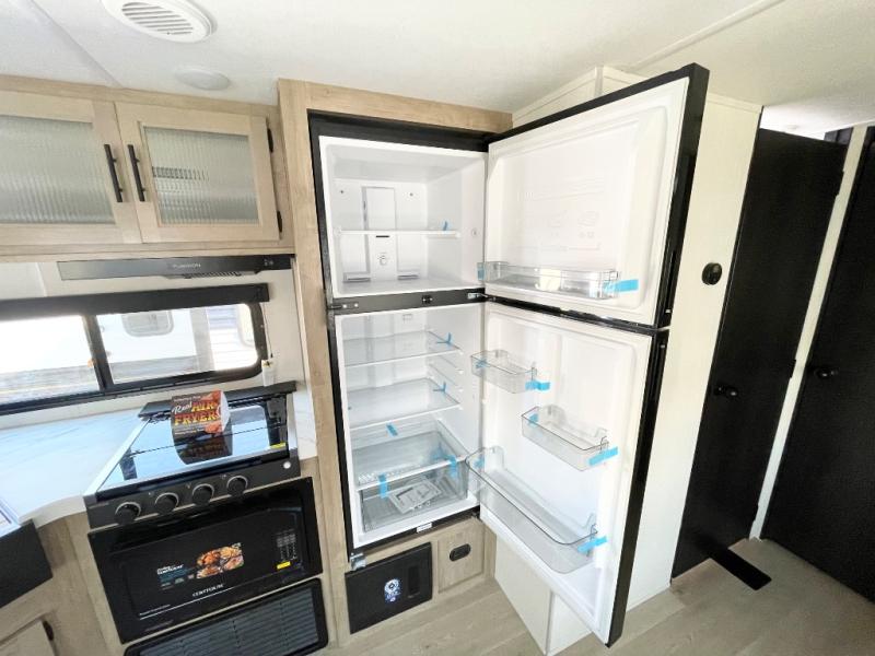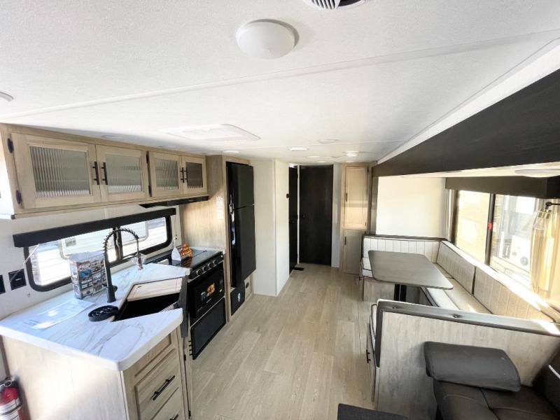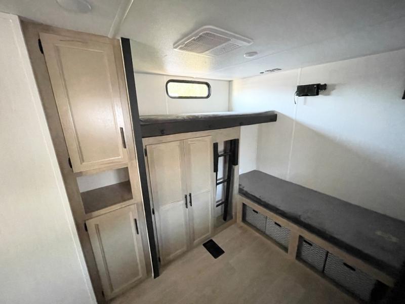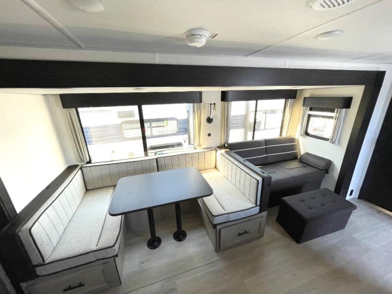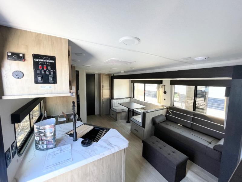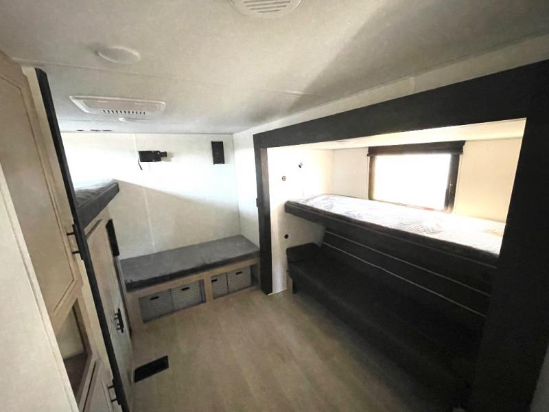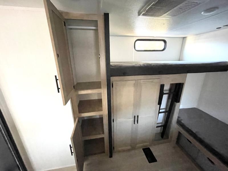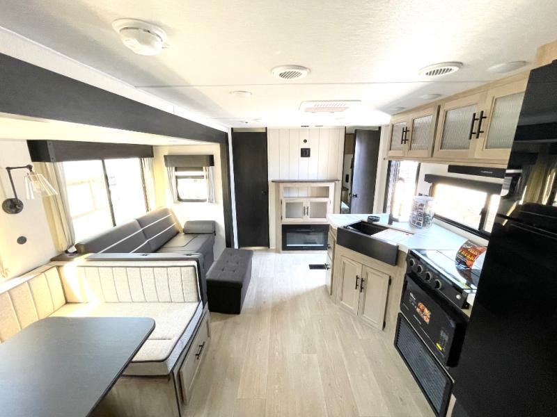 Double slides create spacious living areas in this travel trailer! The chef can prepare their best meals either indoors with the three burner cooktop and air fryer microwave, or at the outdoor kitchen. The kids or guests can sleep in the rear private bunkhouse with a bunk, double bunk, and flip-up bunk above a sofa. The front private bedroom has a walk around RV king bed for a great night's rest plus a wardrobe to keep your things organized. In the morning, everyone can meet in the combined kitchen and living room around the U-shaped dinette and sofa, and the fireplace here will make it feel more like home.