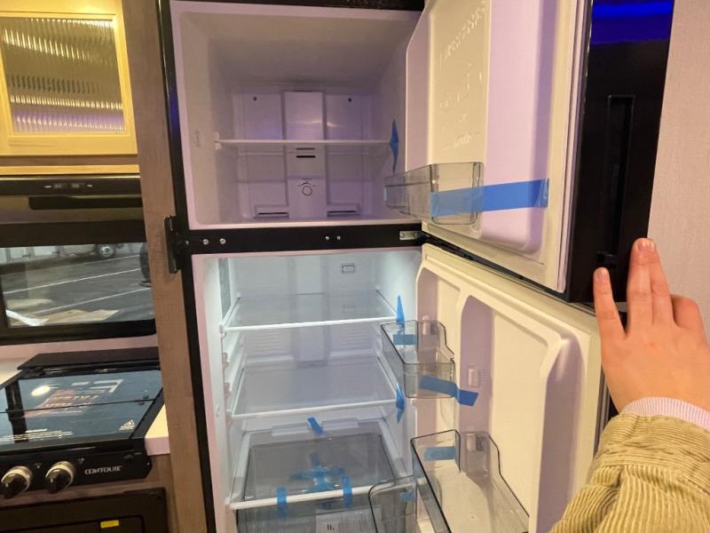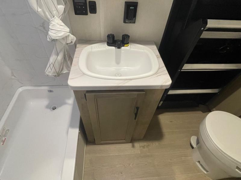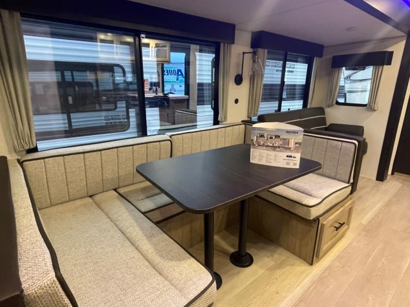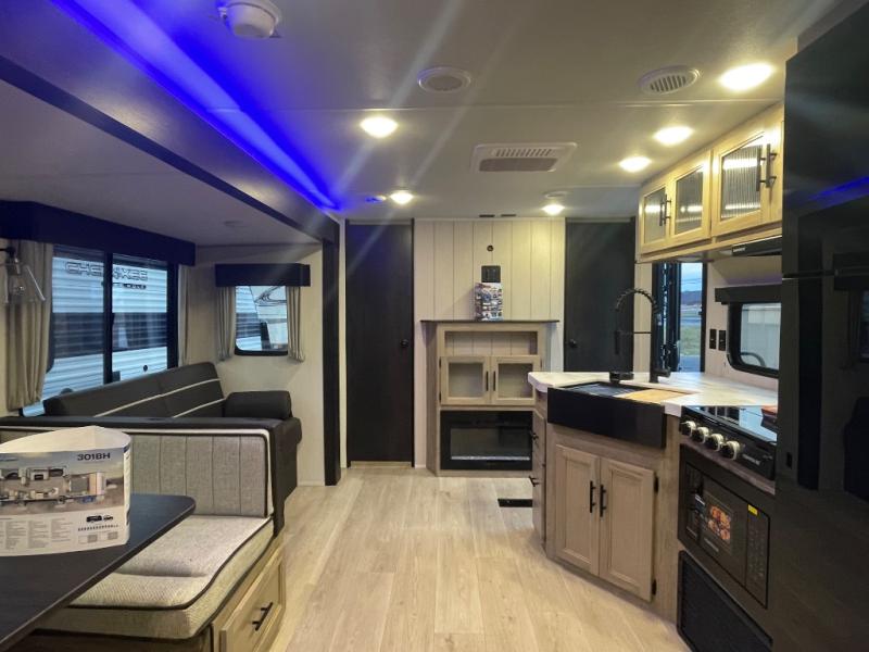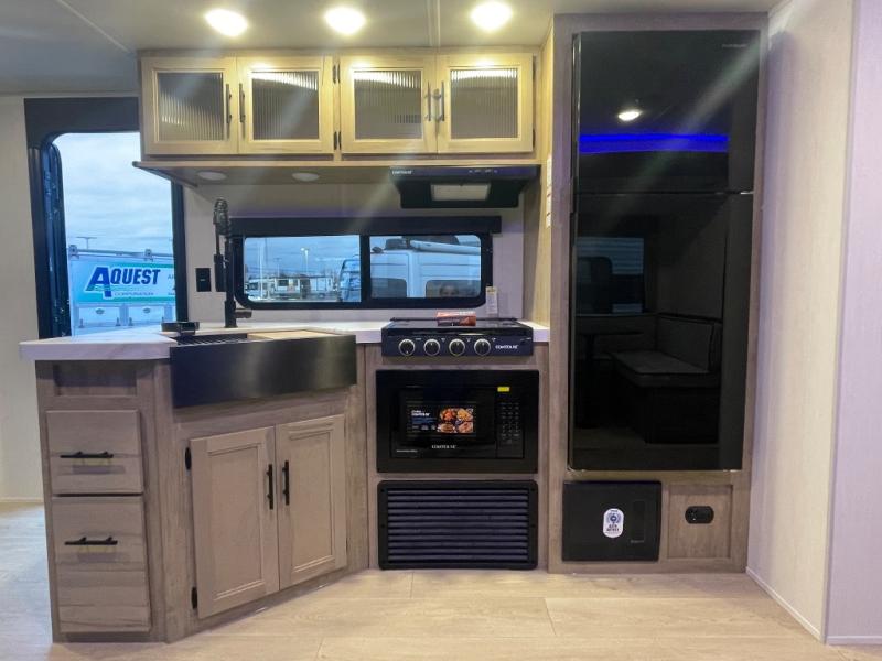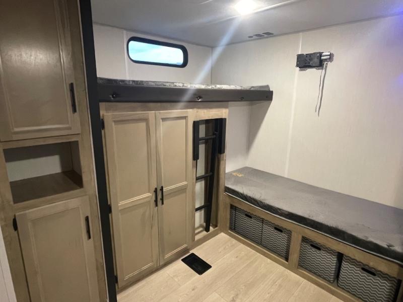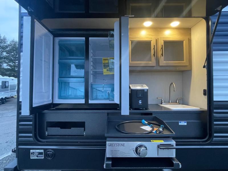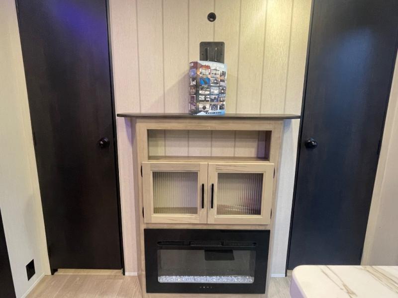 Double slides create spacious living areas in this travel trailer! The chef can prepare their best meals either indoors with the three burner cooktop and air fryer microwave, or at the outdoor kitchen. The kids or guests can sleep in the rear private bunkhouse with a bunk, double bunk, and flip-up bunk above a sofa. The front private bedroom has a walk around RV king bed for a great night's rest plus a wardrobe to keep your things organized. In the morning, everyone can meet in the combined kitchen and living room around the U-shaped dinette and sofa, and the fireplace here will make it feel more like home.