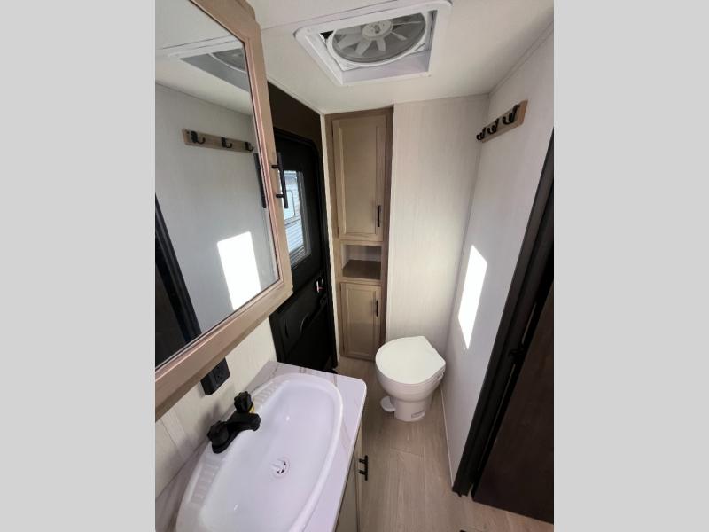 Double slides create spacious living areas in this travel trailer! The chef can prepare their best meals either indoors with the three burner cooktop and air fryer microwave, or at the outdoor kitchen. The kids or guests can sleep in the rear private bunkhouse with a bunk, double bunk, and flip-up bunk above a sofa. The front private bedroom has a walk around RV king bed for a great night's rest plus a wardrobe to keep your things organized. In the morning, everyone can meet in the combined kitchen and living room around the U-shaped dinette and sofa, and the fireplace here will make it feel more like home.