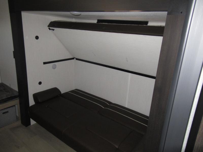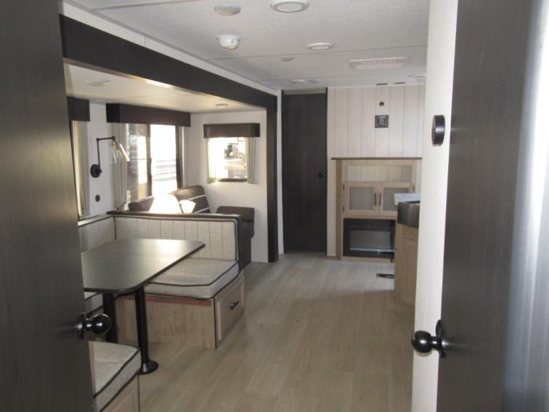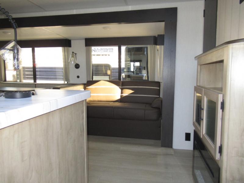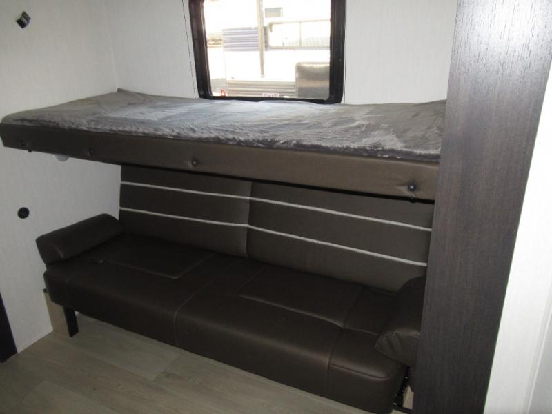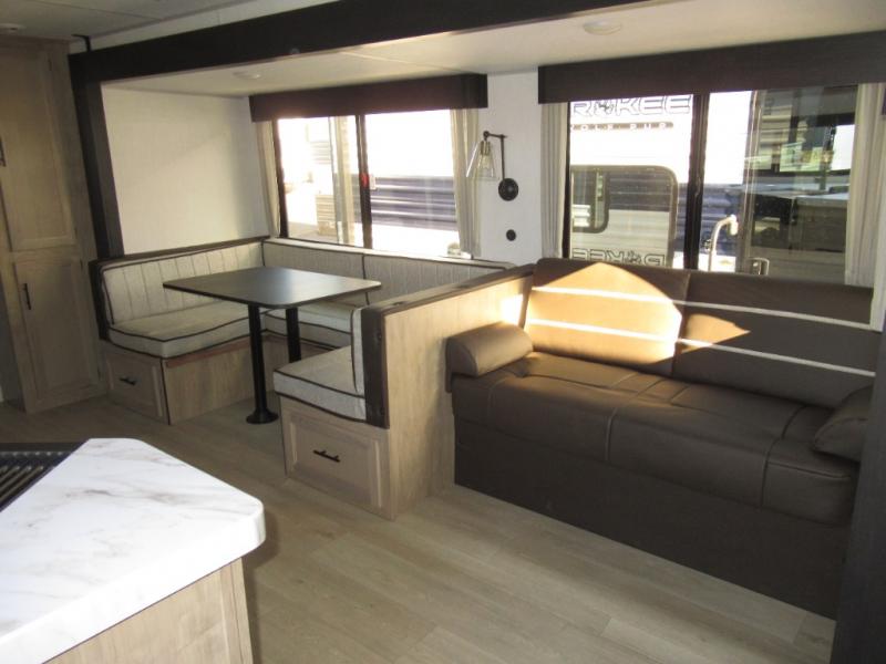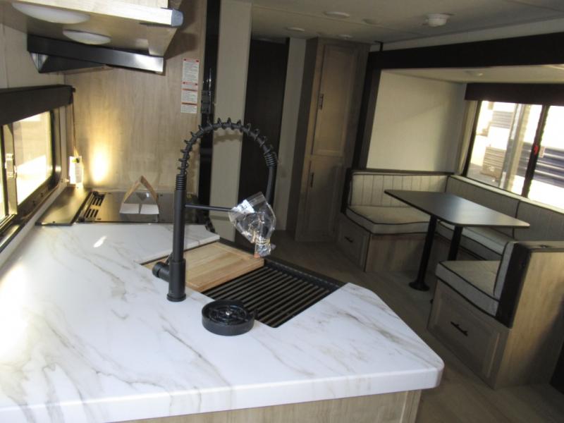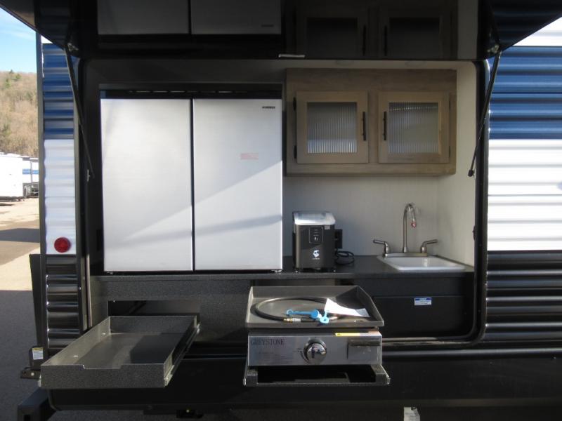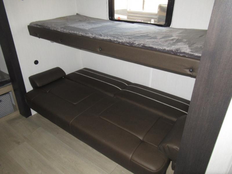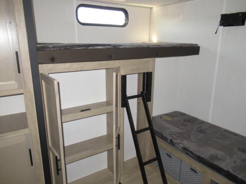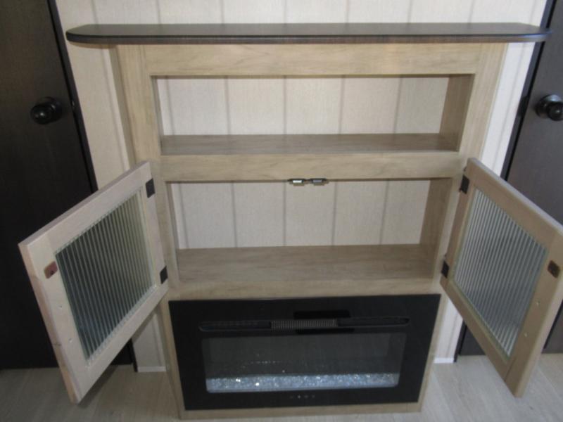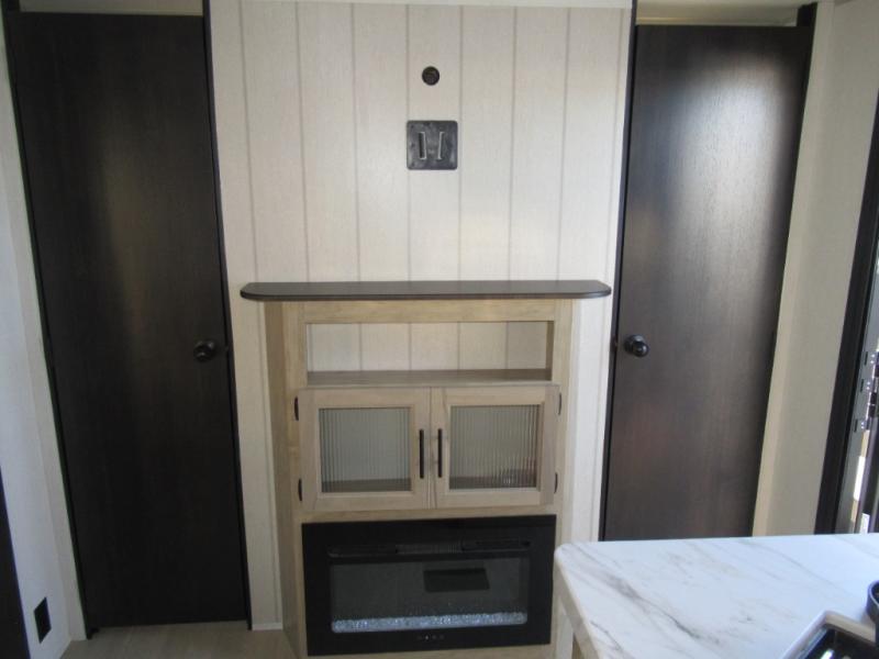Double slides create spacious living areas in this travel trailer! The chef can prepare their best meals either indoors with the three burner cooktop and air fryer microwave, or at the outdoor kitchen. The kids or guests can sleep in the rear private bunkhouse with a bunk, double bunk, and flip-up bunk above a sofa. The front private bedroom has a walk around RV king bed for a great night's rest plus a wardrobe to keep your things organized. In the morning, everyone can meet in the combined kitchen and living room around the U-shaped dinette and sofa, and the fireplace here will make it feel more like home.