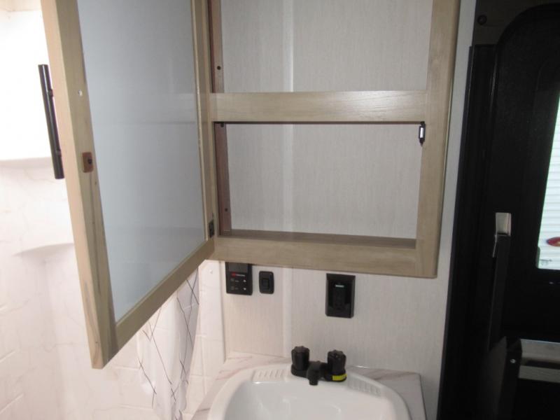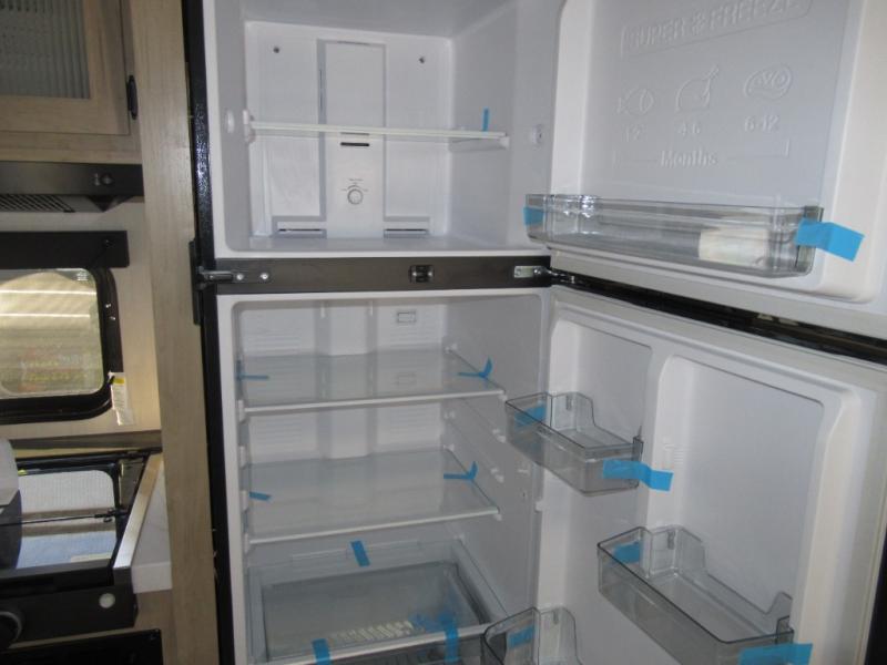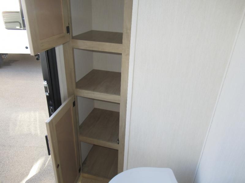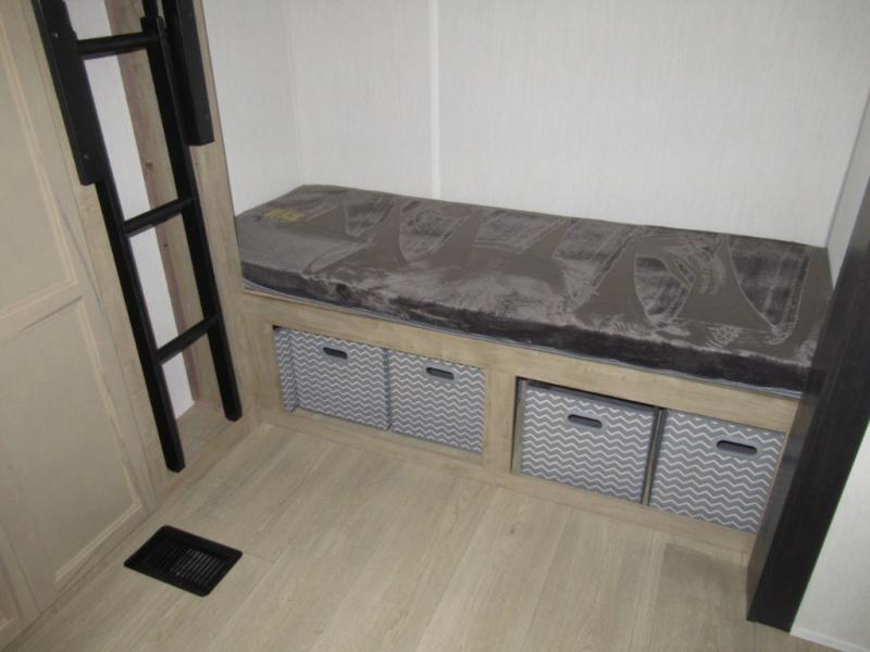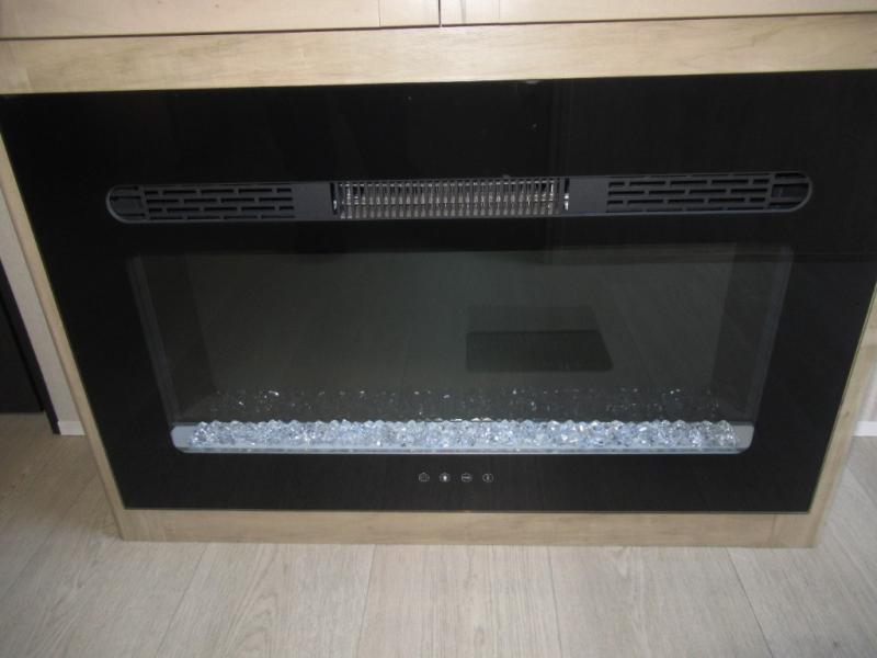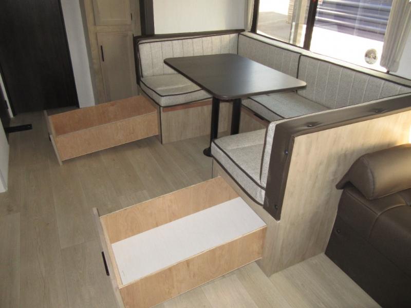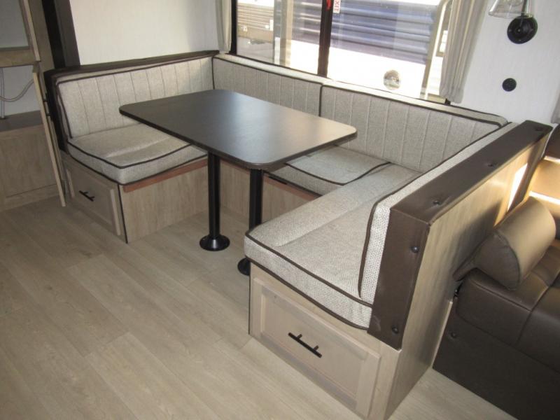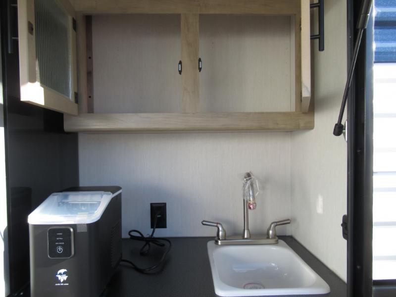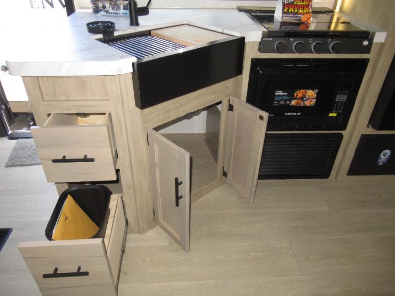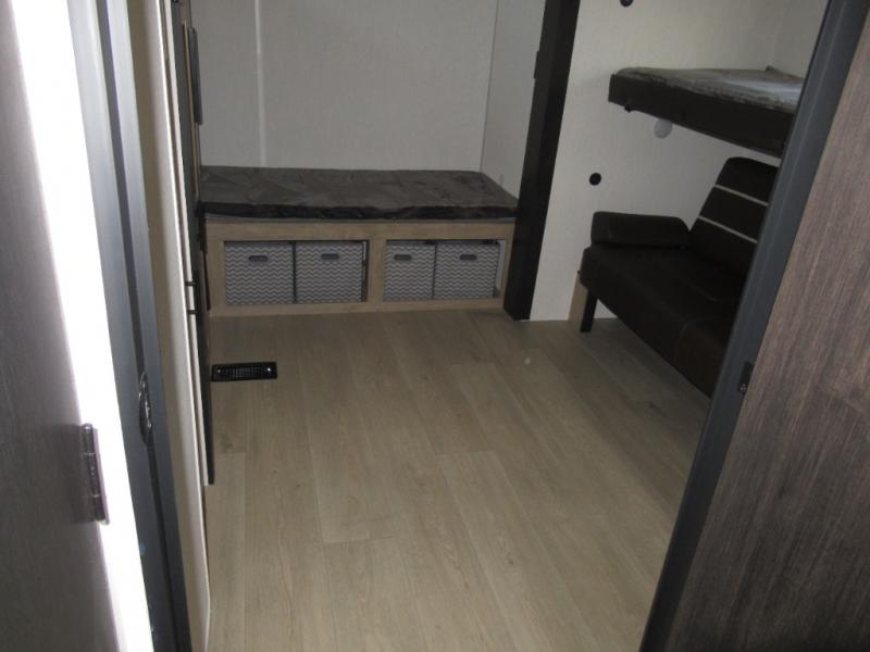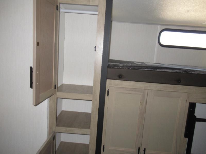 Double slides create spacious living areas in this travel trailer! The chef can prepare their best meals either indoors with the three burner cooktop and air fryer microwave, or at the outdoor kitchen. The kids or guests can sleep in the rear private bunkhouse with a bunk, double bunk, and flip-up bunk above a sofa. The front private bedroom has a walk around RV king bed for a great night's rest plus a wardrobe to keep your things organized. In the morning, everyone can meet in the combined kitchen and living room around the U-shaped dinette and sofa, and the fireplace here will make it feel more like home.