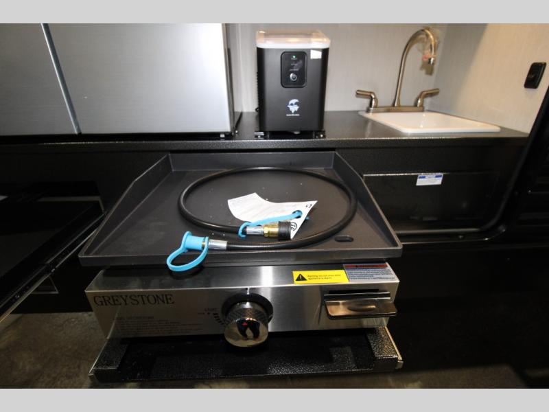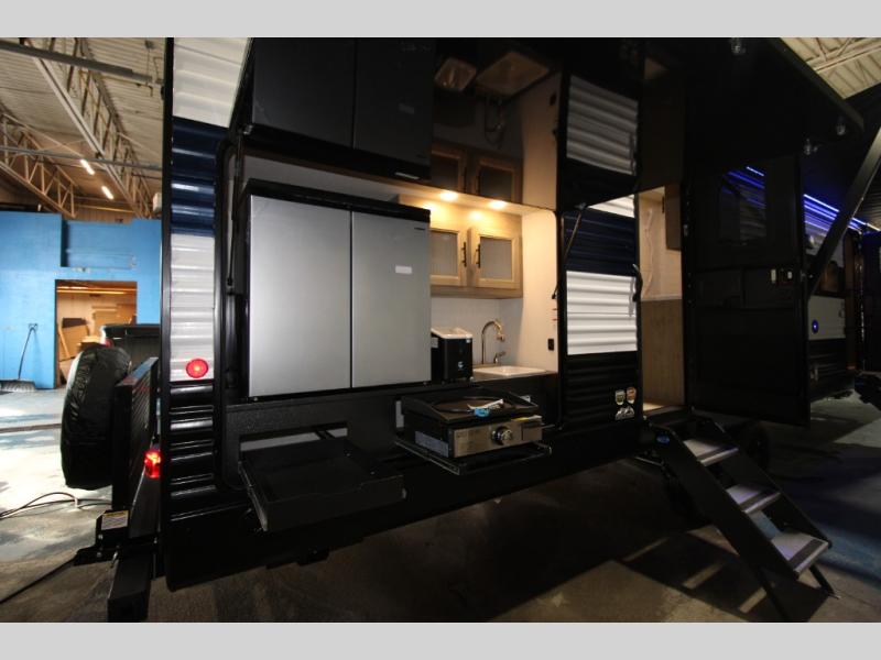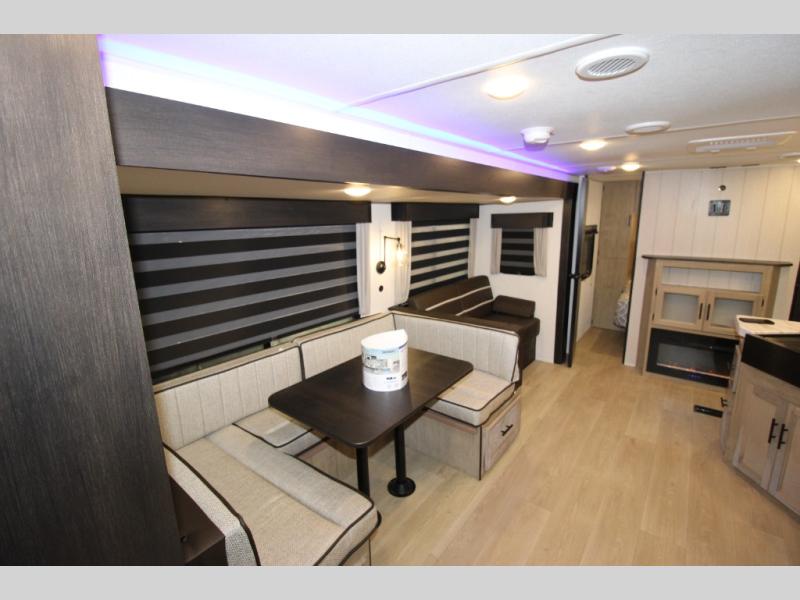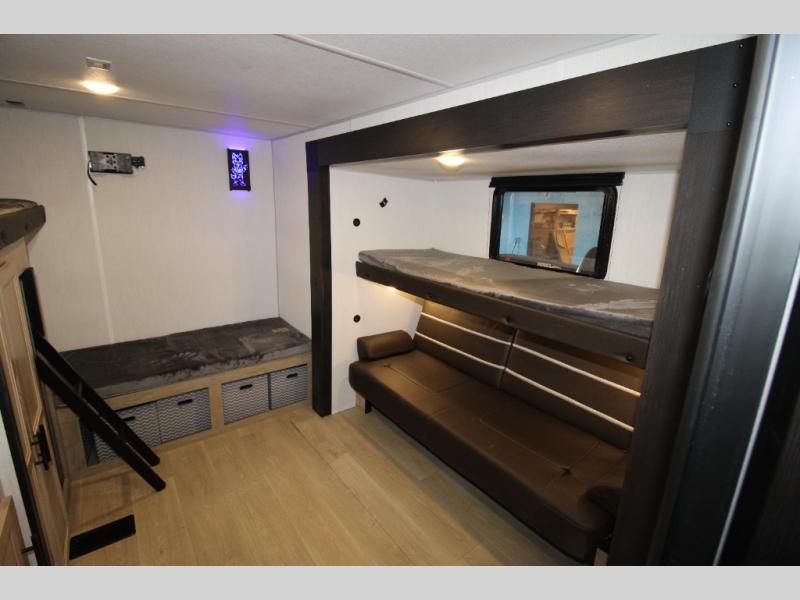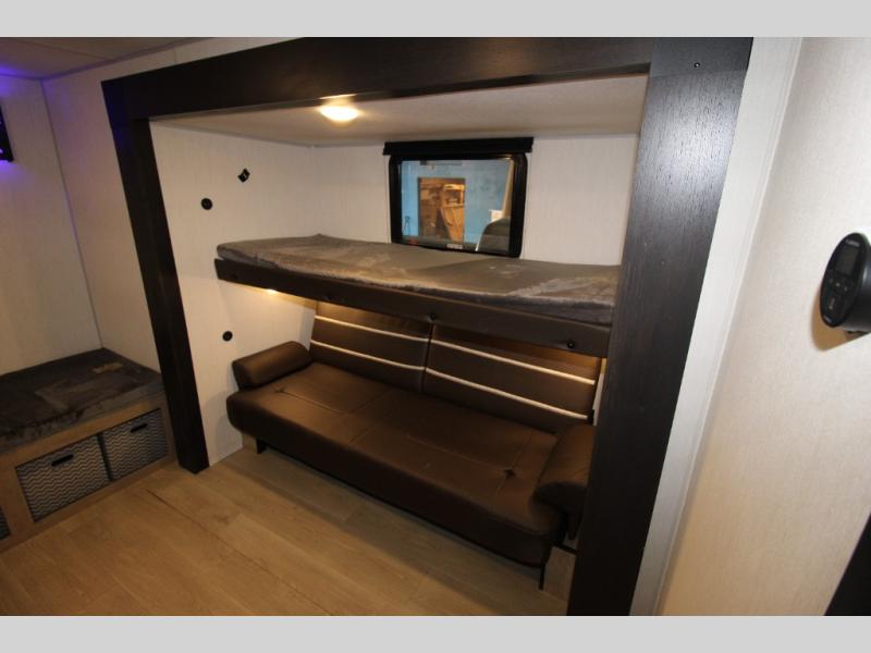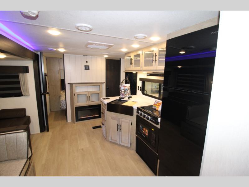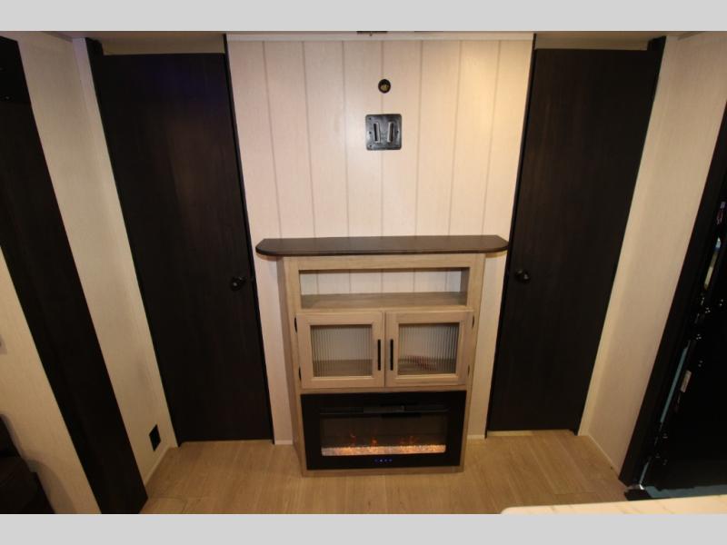 Double slides create spacious living areas in this travel trailer! The chef can prepare their best meals either indoors with the three burner cooktop and air fryer microwave, or at the outdoor kitchen. The kids or guests can sleep in the rear private bunkhouse with a bunk, double bunk, and flip-up bunk above a sofa. The front private bedroom has a walk around RV king bed for a great night's rest plus a wardrobe to keep your things organized. In the morning, everyone can meet in the combined kitchen and living room around the U-shaped dinette and sofa, and the fireplace here will make it feel more like home.