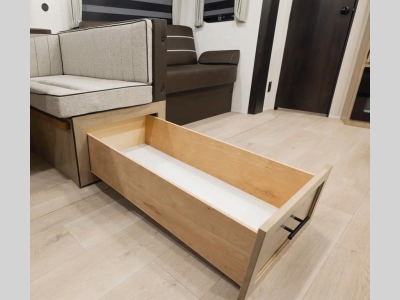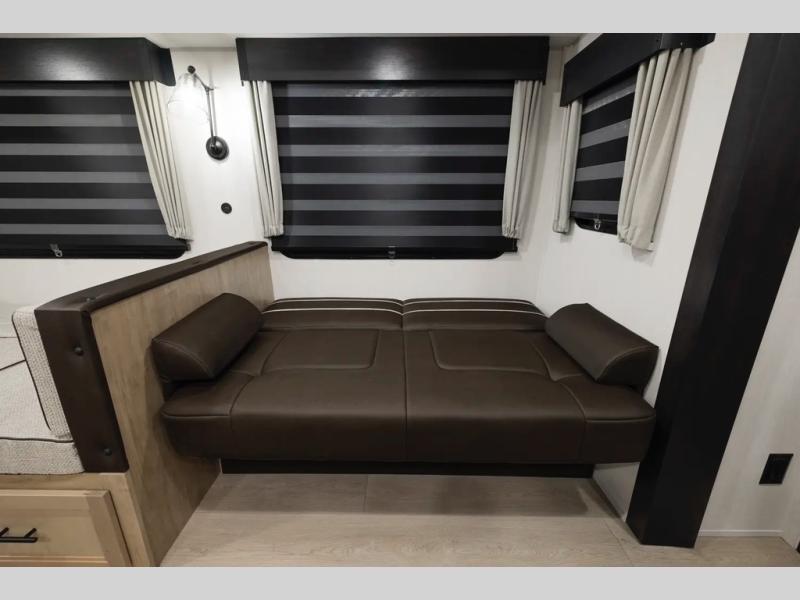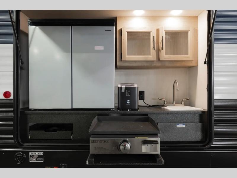 Double slides create spacious living areas in this travel trailer! The chef can prepare their best meals either indoors with the three burner cooktop and air fryer microwave, or at the outdoor kitchen. The kids or guests can sleep in the rear private bunkhouse with a bunk, double bunk, and flip-up bunk above a sofa. The front private bedroom has a walk around RV king bed for a great night's rest plus a wardrobe to keep your things organized. In the morning, everyone can meet in the combined kitchen and living room around the U-shaped dinette and sofa, and the fireplace here will make it feel more like home.