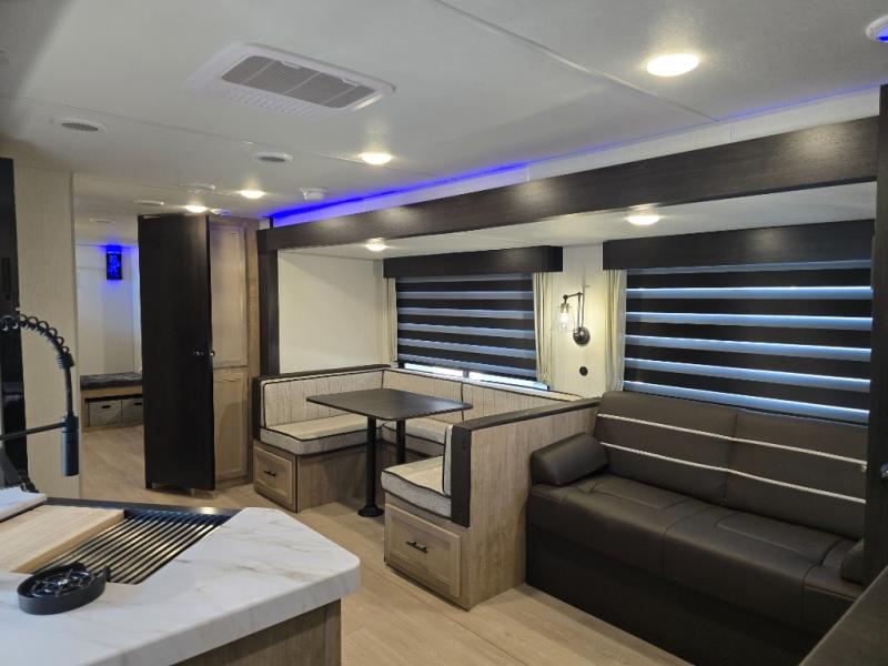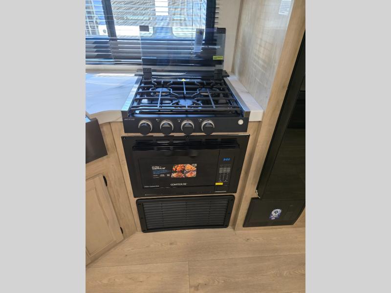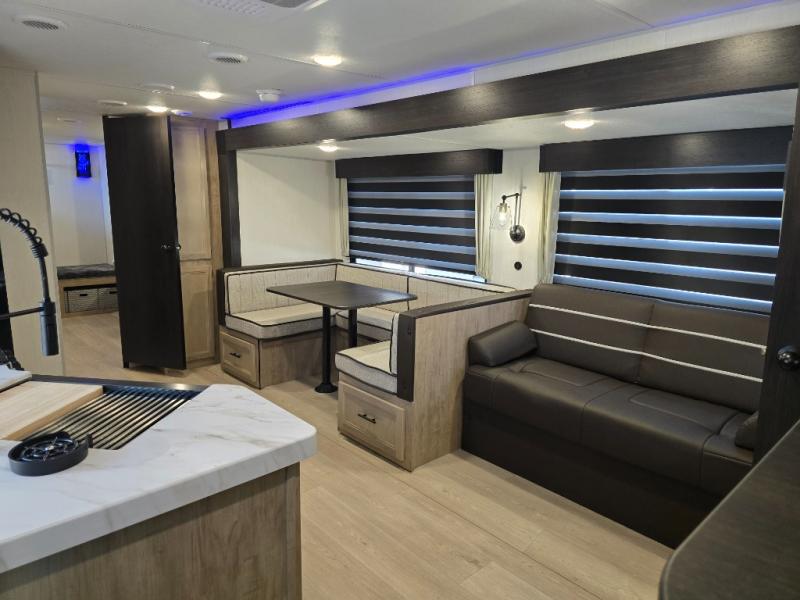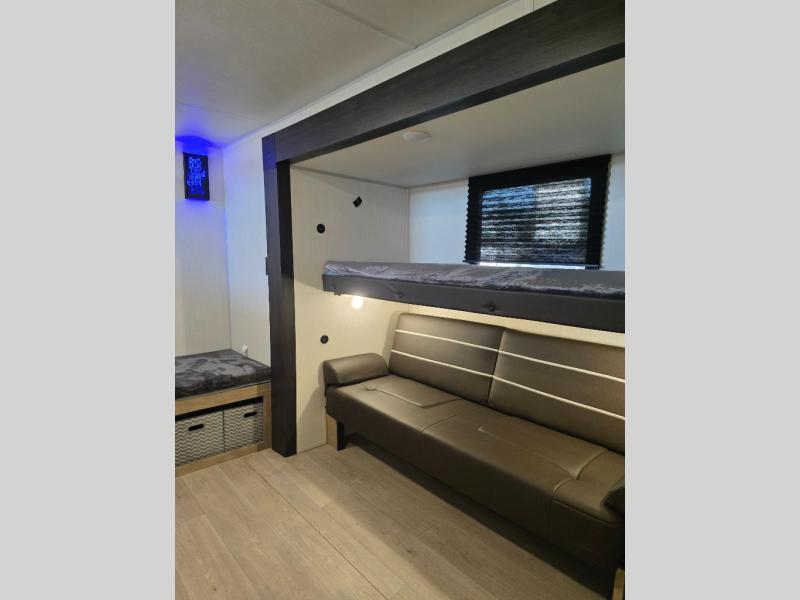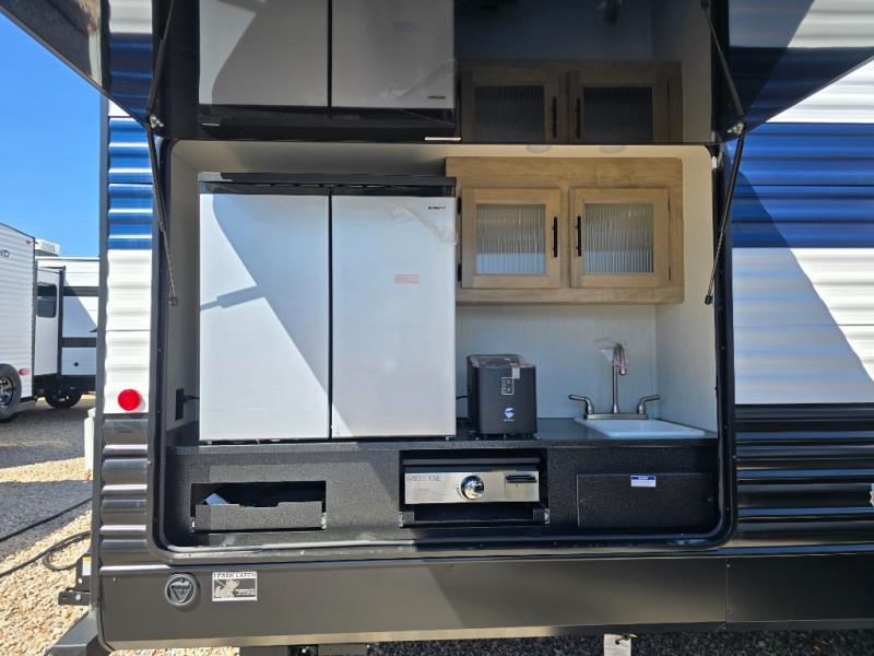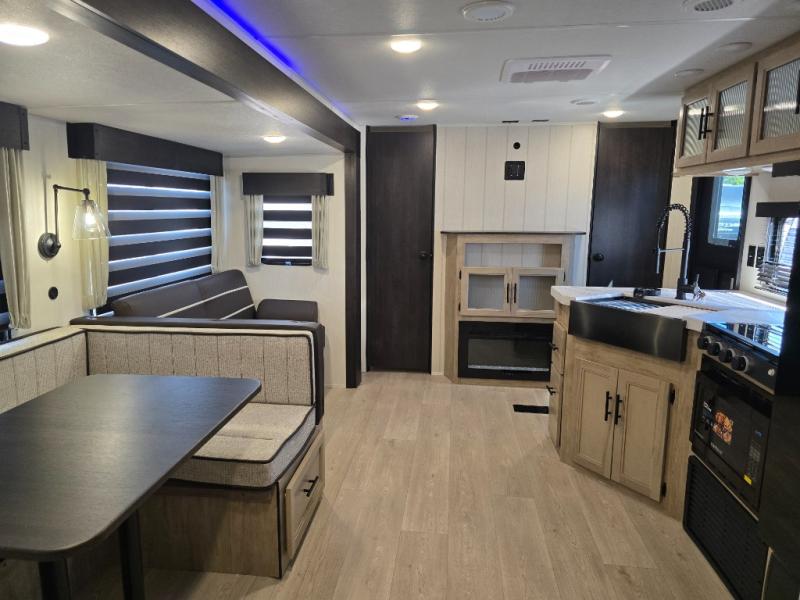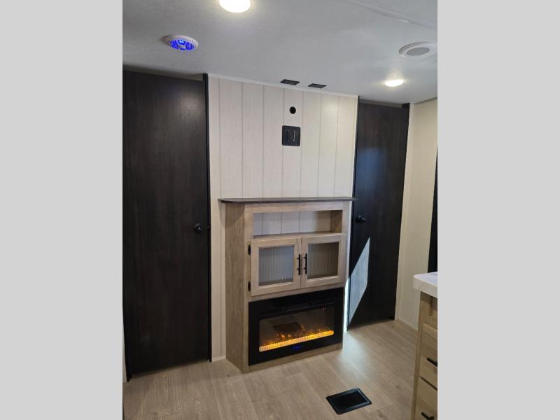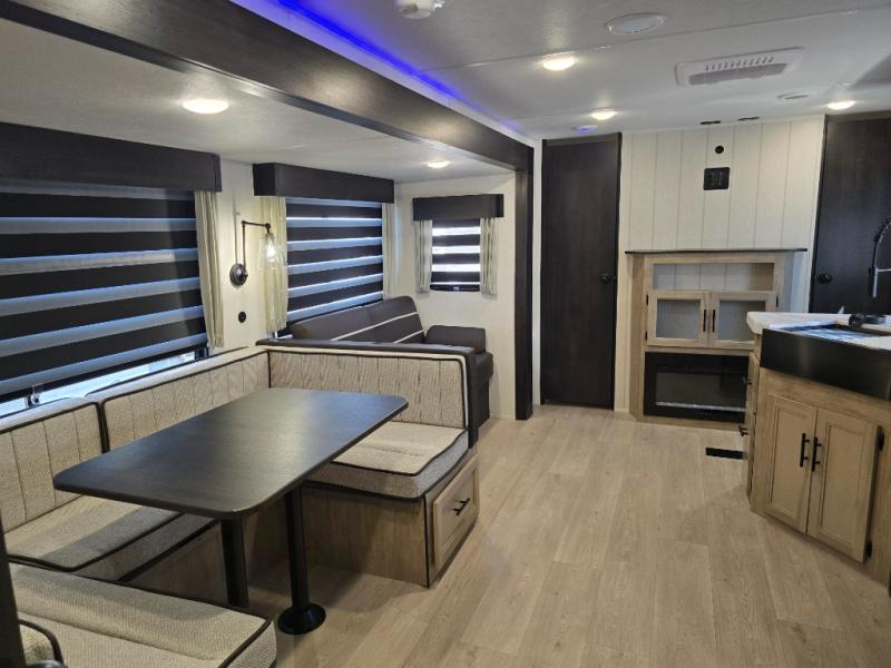 Double slides create spacious living areas in this travel trailer! The chef can prepare their best meals either indoors with the three burner cooktop and air fryer microwave, or at the outdoor kitchen. The kids or guests can sleep in the rear private bunkhouse with a bunk, double bunk, and flip-up bunk above a sofa. The front private bedroom has a walk around RV king bed for a great night's rest plus a wardrobe to keep your things organized. In the morning, everyone can meet in the combined kitchen and living room around the U-shaped dinette and sofa, and the fireplace here will make it feel more like home.