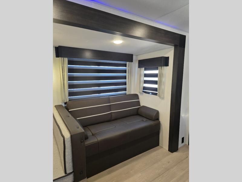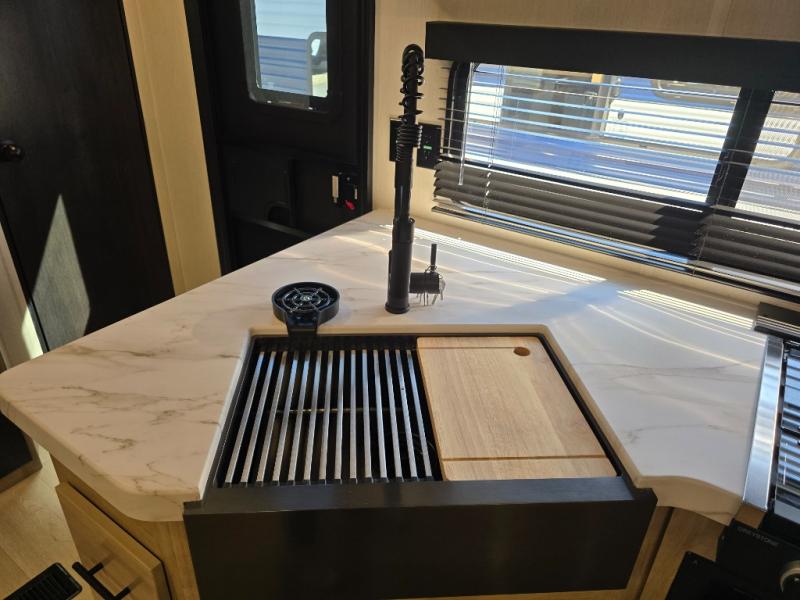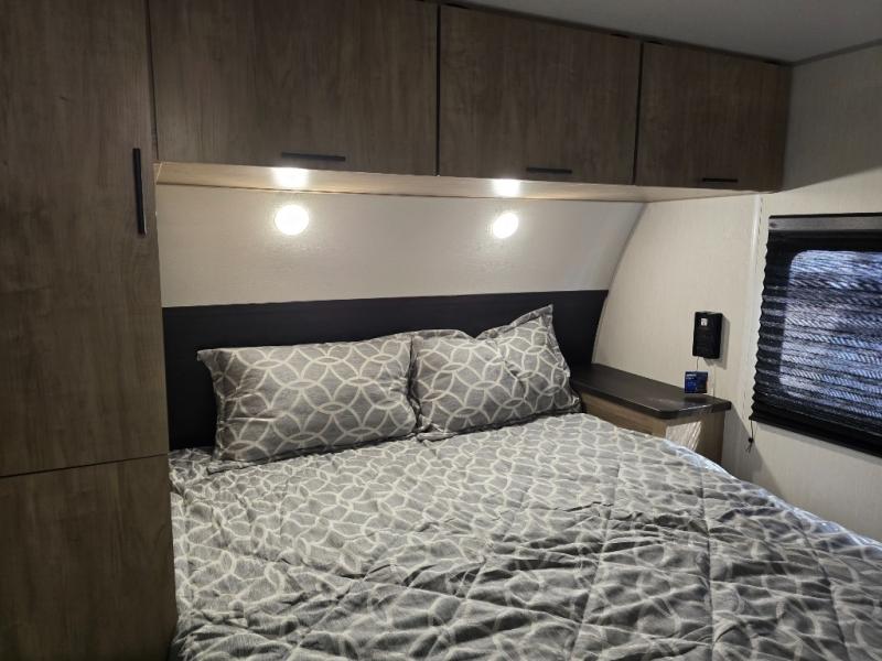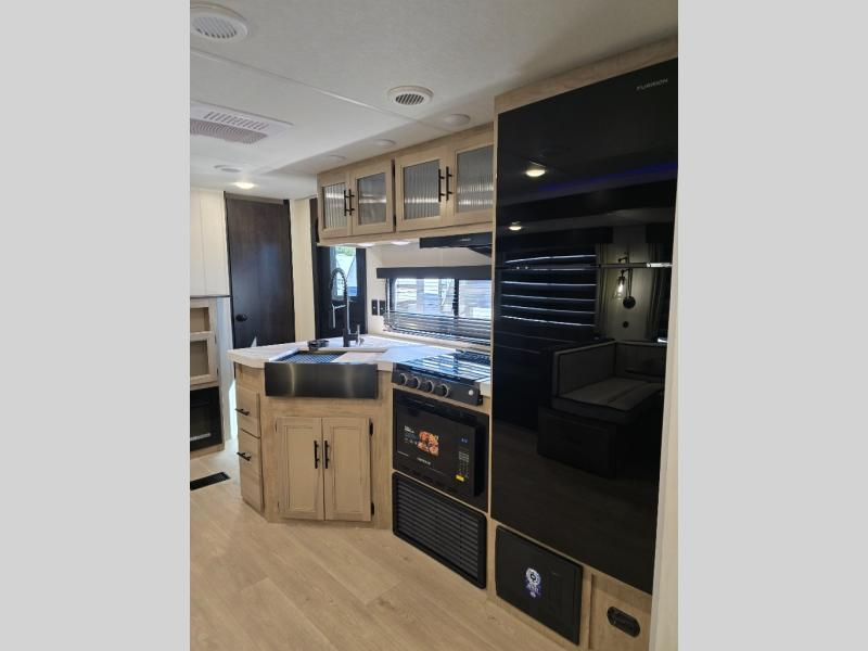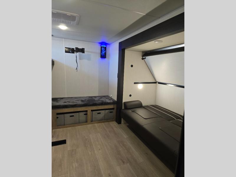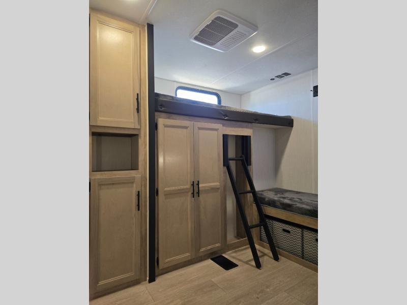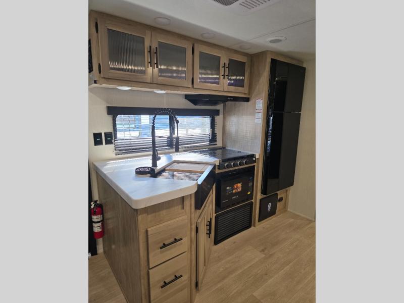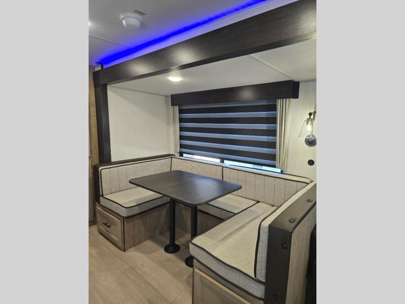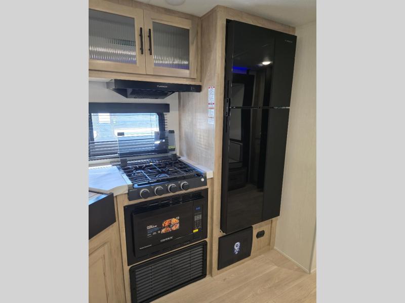 Double slides create spacious living areas in this travel trailer! The chef can prepare their best meals either indoors with the three burner cooktop and air fryer microwave, or at the outdoor kitchen. The kids or guests can sleep in the rear private bunkhouse with a bunk, double bunk, and flip-up bunk above a sofa. The front private bedroom has a walk around RV king bed for a great night's rest plus a wardrobe to keep your things organized. In the morning, everyone can meet in the combined kitchen and living room around the U-shaped dinette and sofa, and the fireplace here will make it feel more like home.