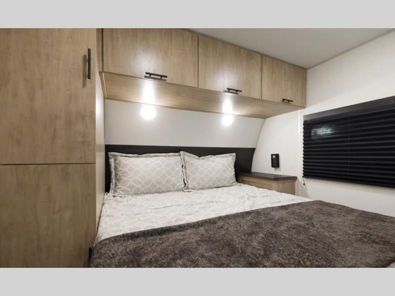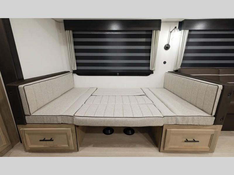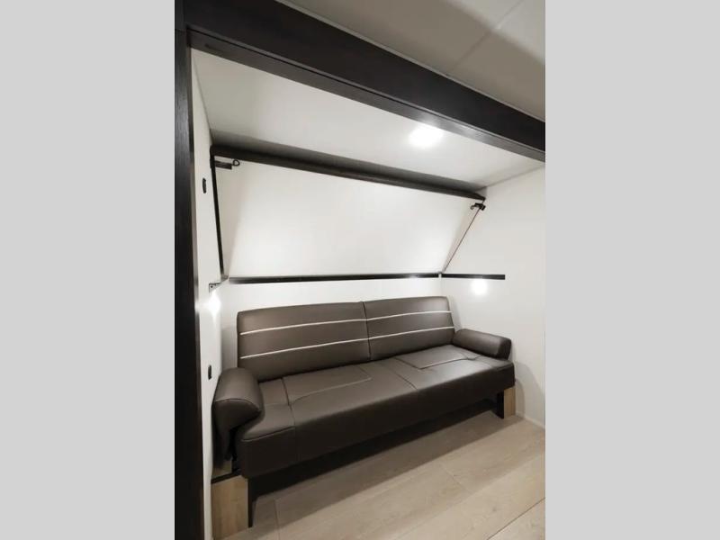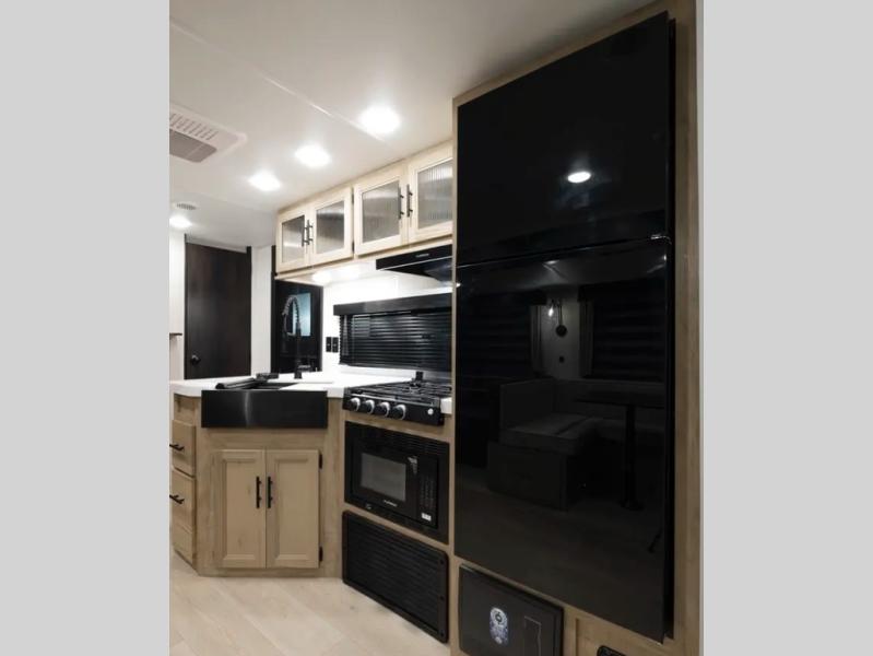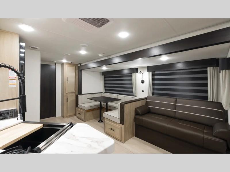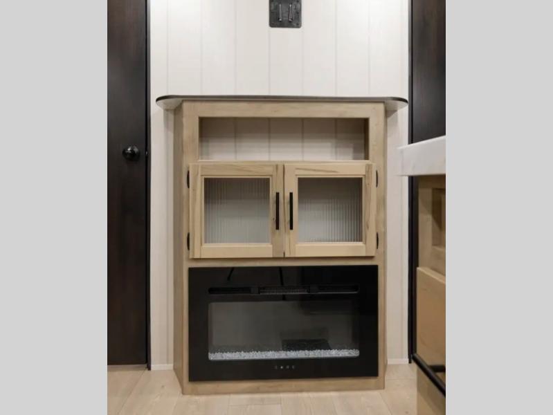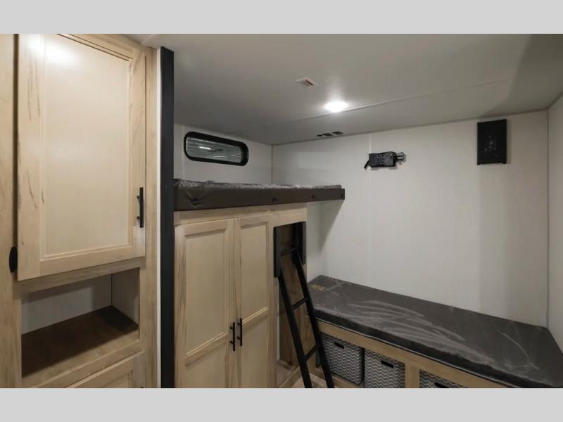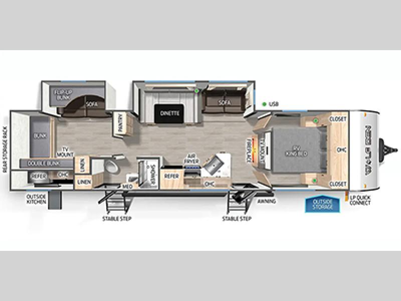 Double slides create spacious living areas in this travel trailer! The chef can prepare their best meals either indoors with the three burner cooktop and air fryer microwave, or at the outdoor kitchen. The kids or guests can sleep in the rear private bunkhouse with a bunk, double bunk, and flip-up bunk above a sofa. The front private bedroom has a walk around RV king bed for a great night's rest plus a wardrobe to keep your things organized. In the morning, everyone can meet in the combined kitchen and living room around the U-shaped dinette and sofa, and the fireplace here will make it feel more like home.