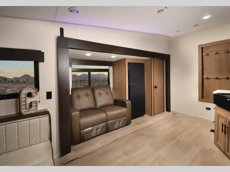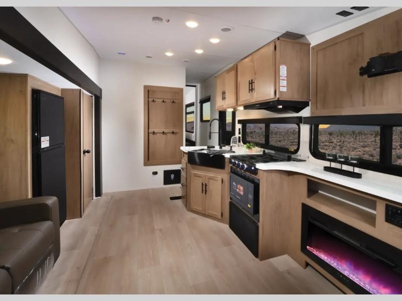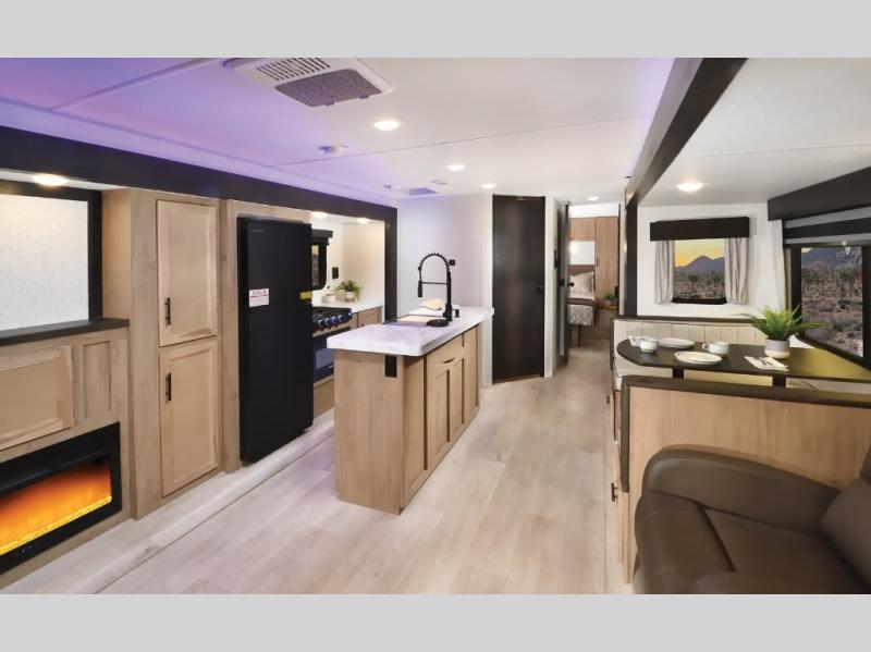 The whole gang will love this travel trailer with triple slides for more space. Your guests or the kids are sure to claim the rear private bunkhouse with a double bunk plus a flip-up bunk above a sofa and a TV mount if you want to add a television here. You'll have the front private bedroom with an RV king bed all to yourselves, and the full bath is close by for easy nighttime use. The middle combined kitchen and living area features dual opposing slides, a kitchen island, plus a U-shaped dinette and sofa. There is also an entertainment center with a fireplace and a hidden pantry behind for movies, snacks and more. Outside, two power awnings, exterior storage, and an outside kitchen makes it easier to spend more time outdoors!