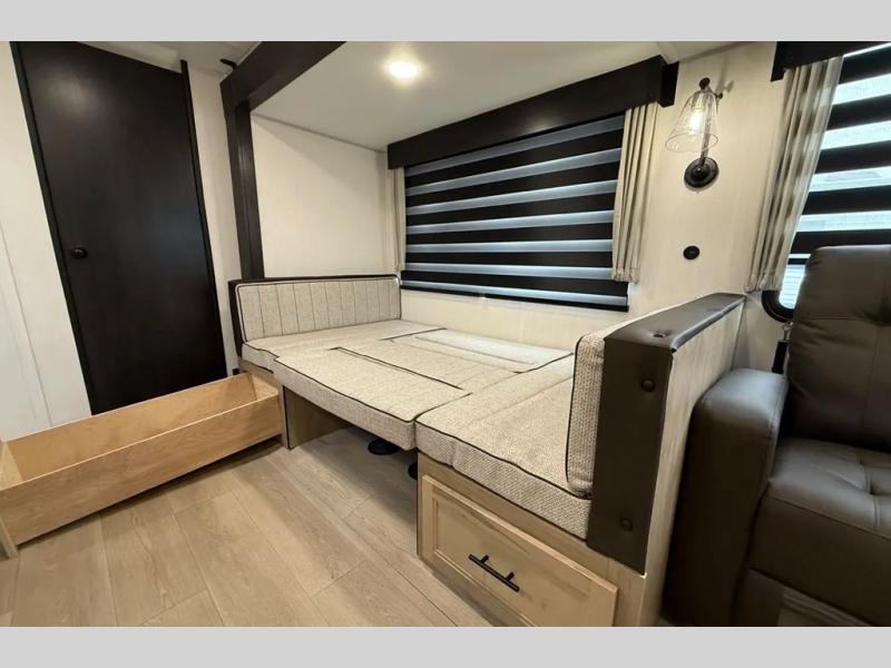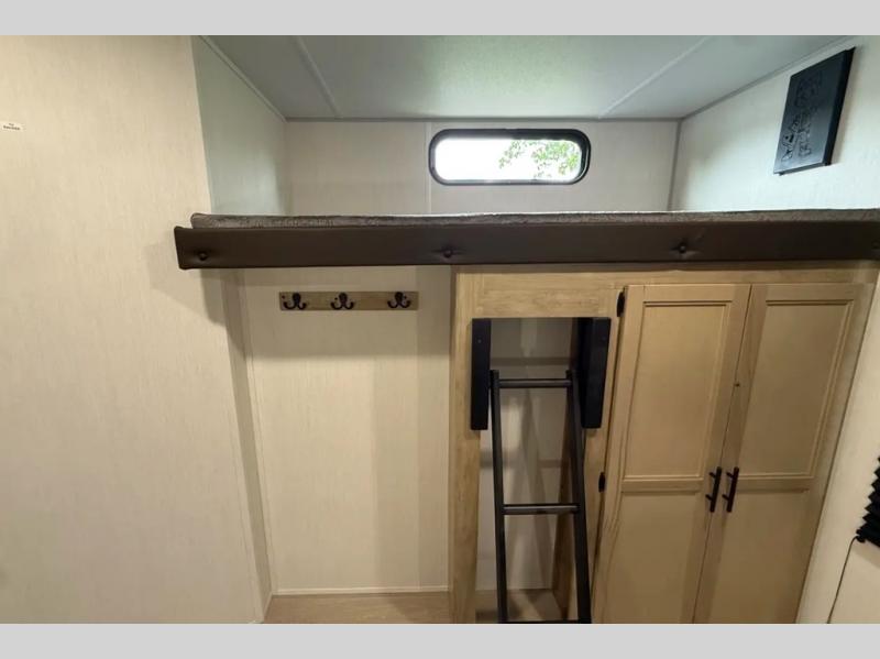 The whole gang will love this travel trailer with triple slides for more space. Your guests or the kids are sure to claim the rear private bunkhouse with a double bunk plus a flip-up bunk above a sofa and a TV mount if you want to add a television here. You'll have the front private bedroom with an RV king bed all to yourselves, and the full bath is close by for easy nighttime use. The middle combined kitchen and living area features dual opposing slides, a kitchen island, plus a U-shaped dinette and sofa. There is also an entertainment center with a fireplace and a hidden pantry behind for movies, snacks and more. Outside, two power awnings, exterior storage, and an outside kitchen makes it easier to spend more time outdoors!