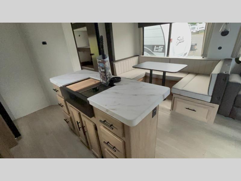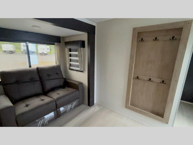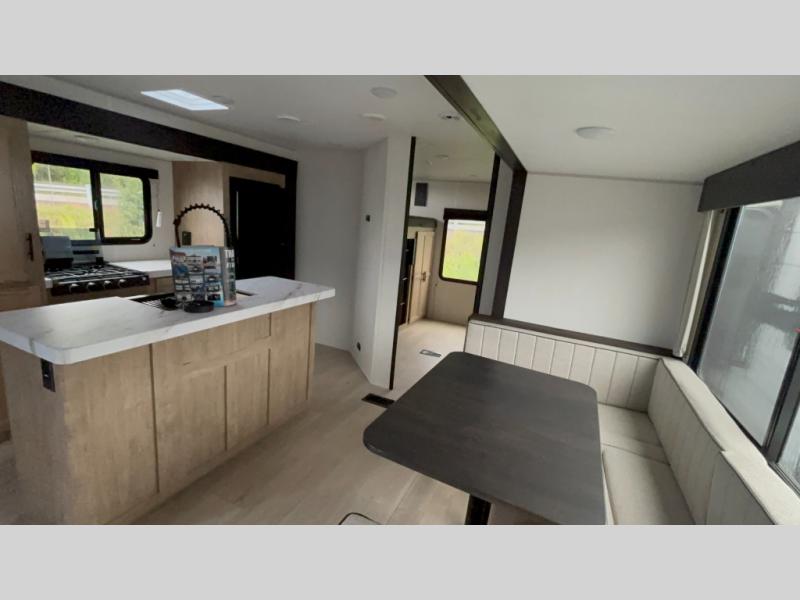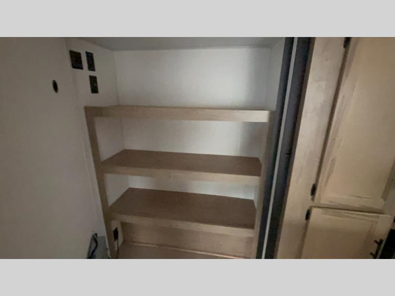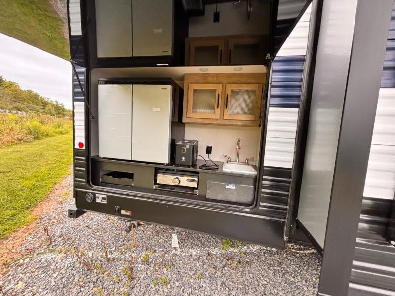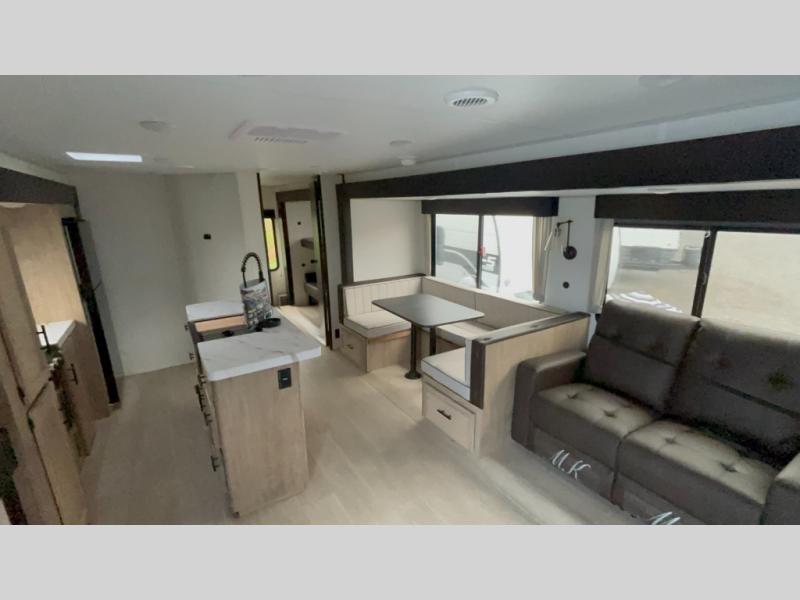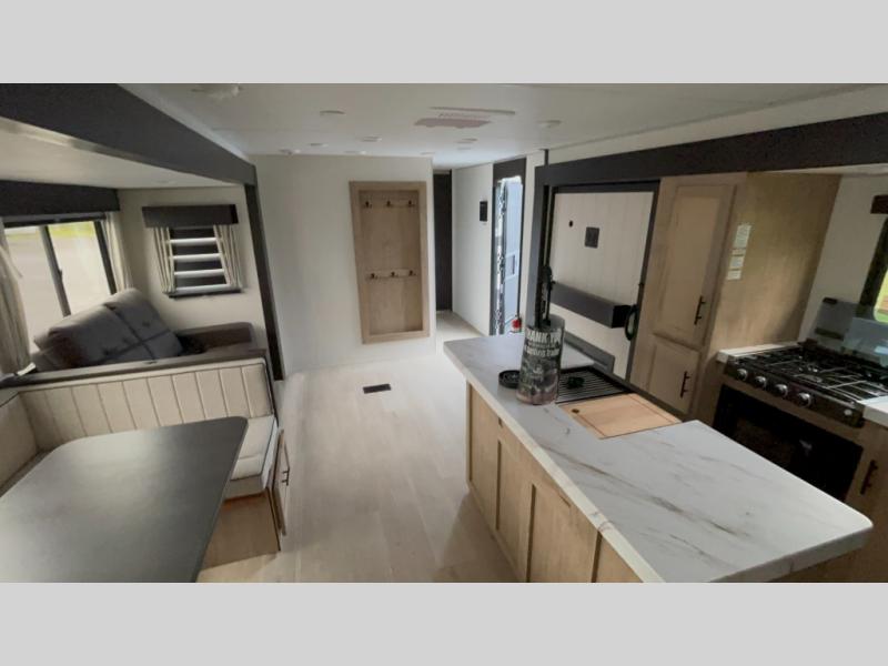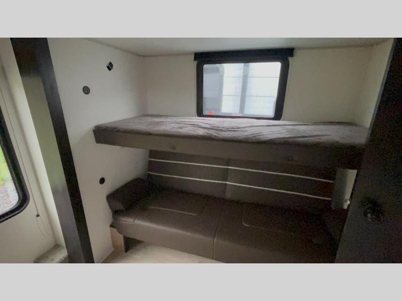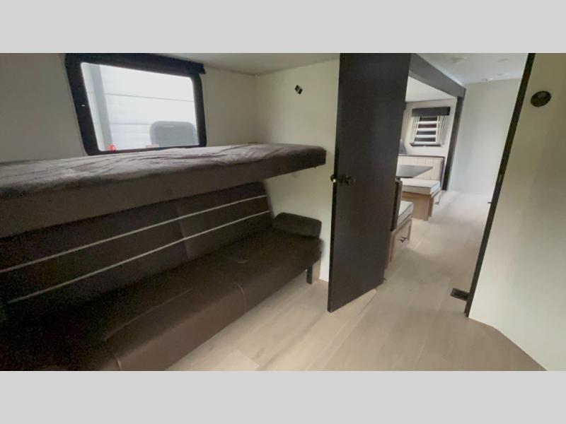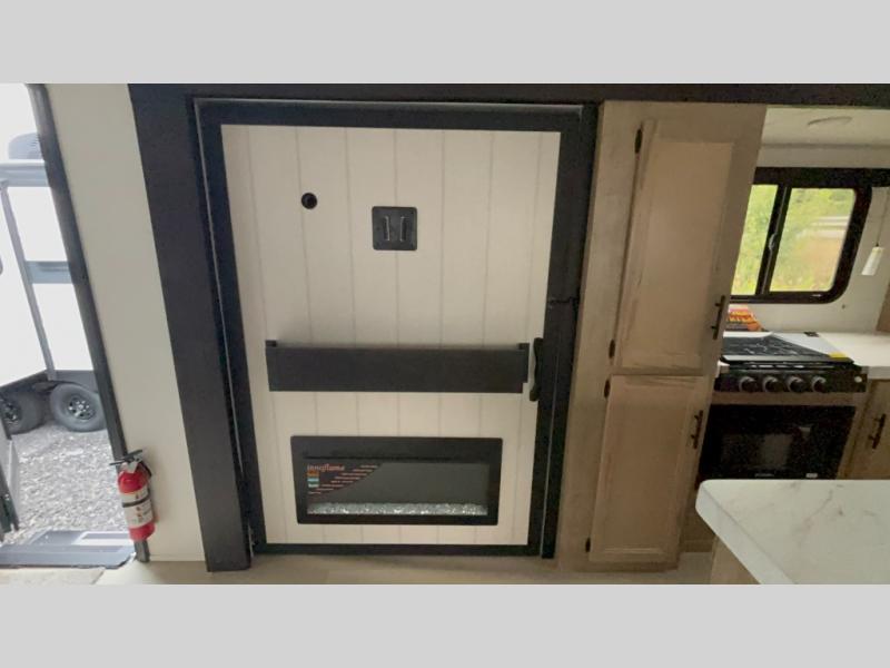 The whole gang will love this travel trailer with triple slides for more space. Your guests or the kids are sure to claim the rear private bunkhouse with a double bunk plus a flip-up bunk above a sofa and a TV mount if you want to add a television here. You'll have the front private bedroom with an RV king bed all to yourselves, and the full bath is close by for easy nighttime use. The middle combined kitchen and living area features dual opposing slides, a kitchen island, plus a U-shaped dinette and sofa. There is also an entertainment center with a fireplace and a hidden pantry behind for movies, snacks and more. Outside, two power awnings, exterior storage, and an outside kitchen makes it easier to spend more time outdoors!