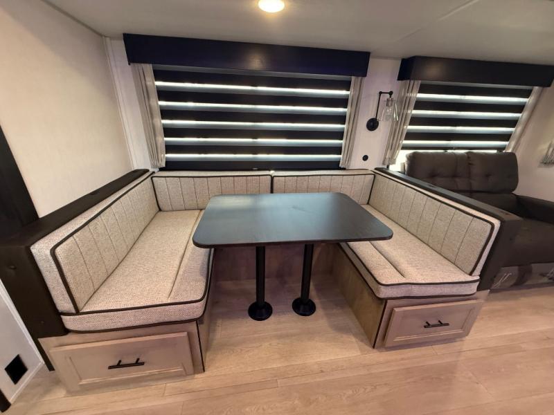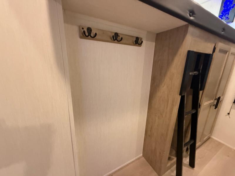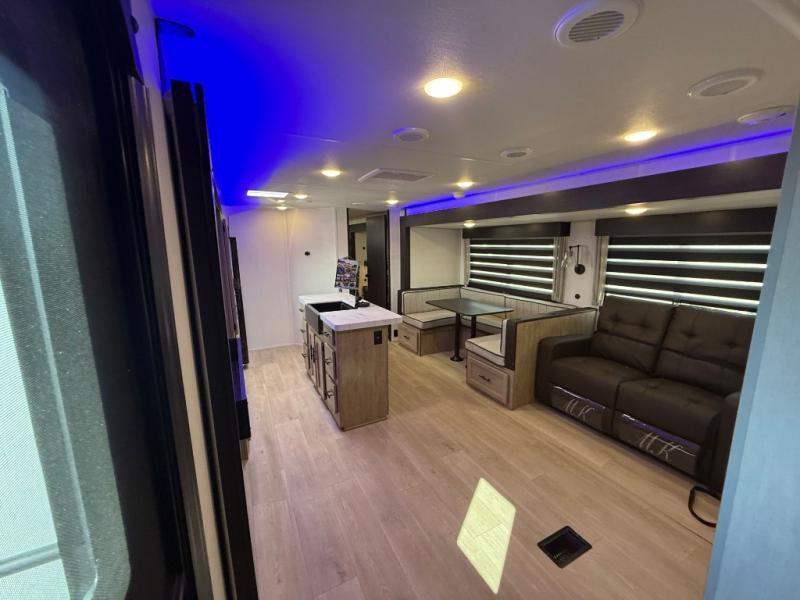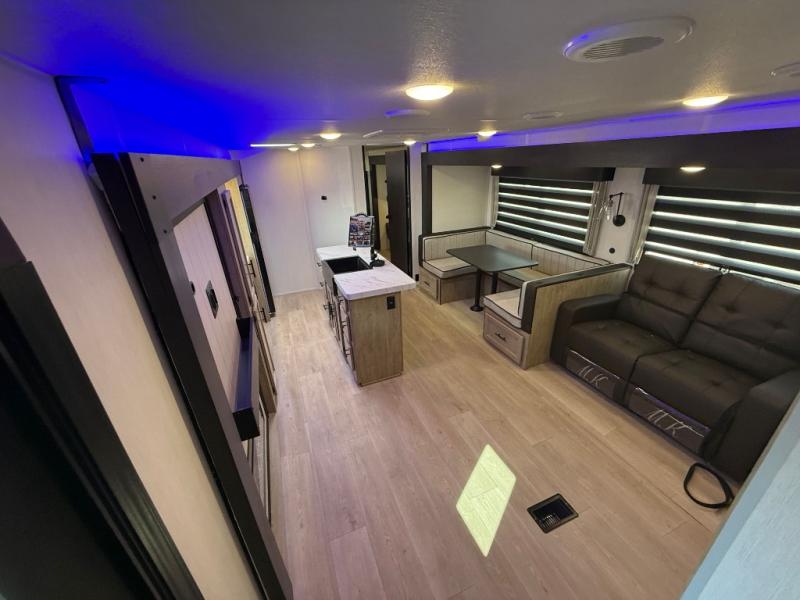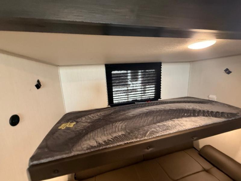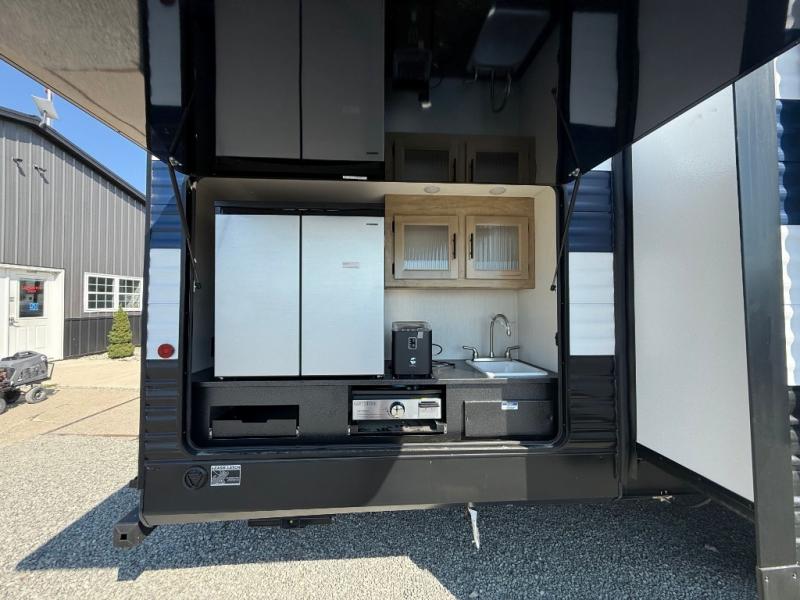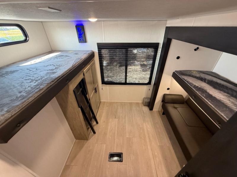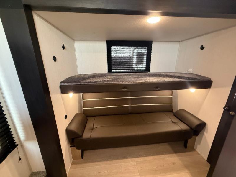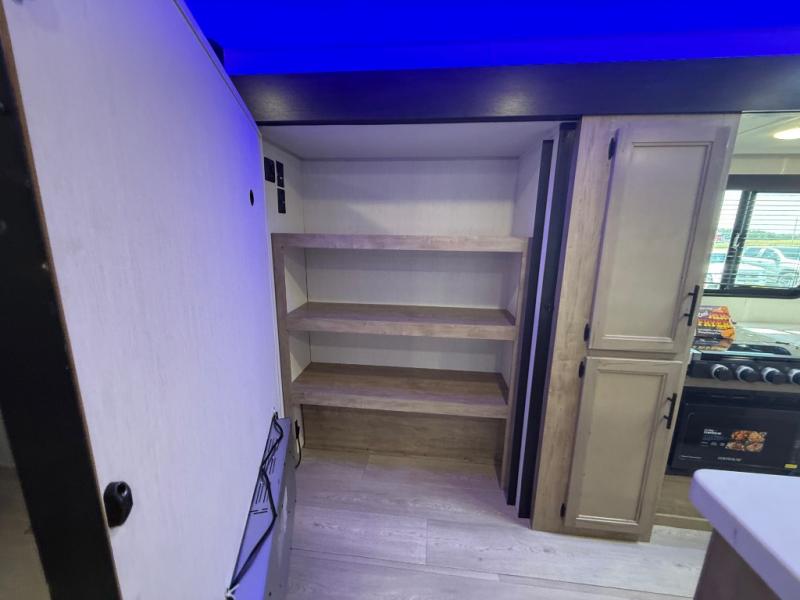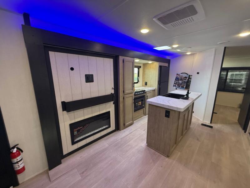 The whole gang will love this travel trailer with triple slides for more space. Your guests or the kids are sure to claim the rear private bunkhouse with a double bunk plus a flip-up bunk above a sofa and a TV mount if you want to add a television here. You'll have the front private bedroom with an RV king bed all to yourselves, and the full bath is close by for easy nighttime use. The middle combined kitchen and living area features dual opposing slides, a kitchen island, plus a U-shaped dinette and sofa. There is also an entertainment center with a fireplace and a hidden pantry behind for movies, snacks and more. Outside, two power awnings, exterior storage, and an outside kitchen makes it easier to spend more time outdoors!