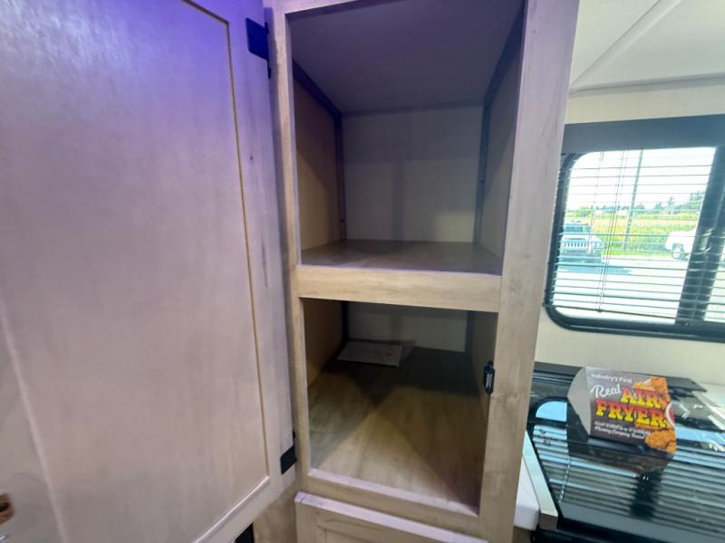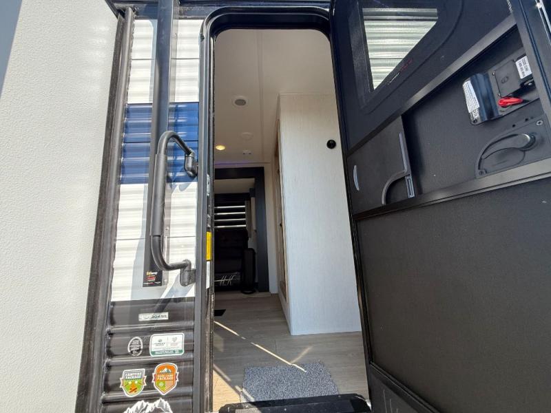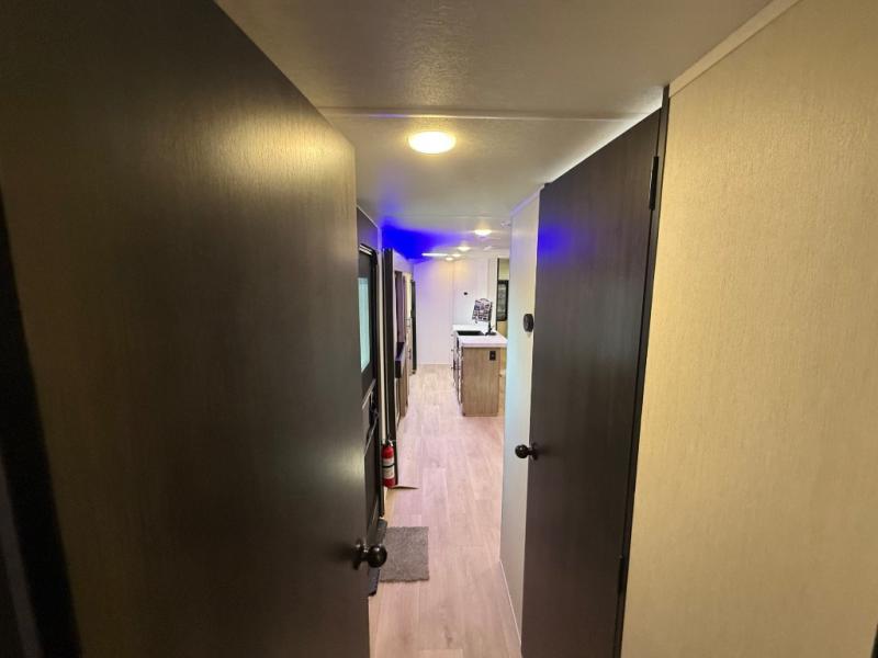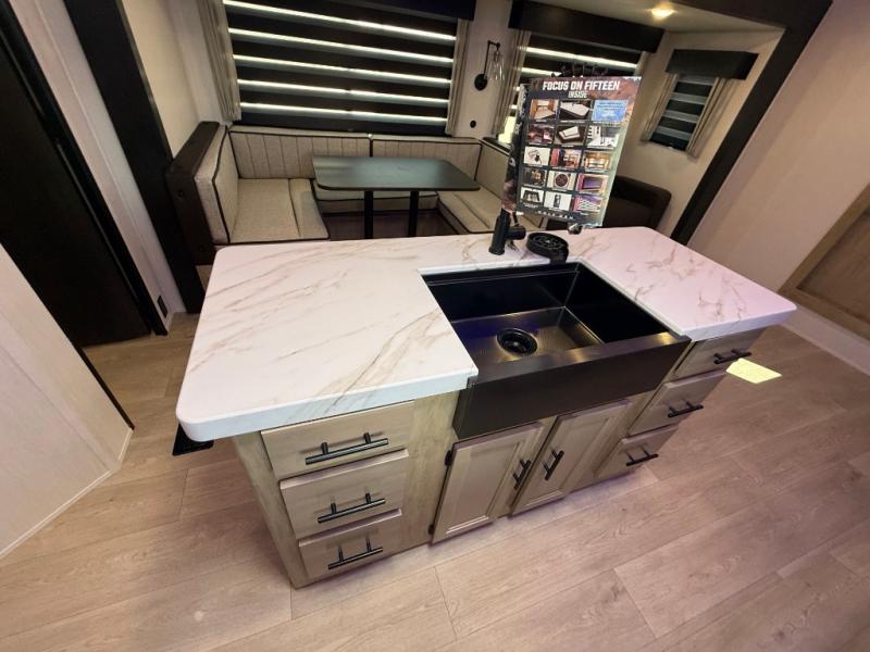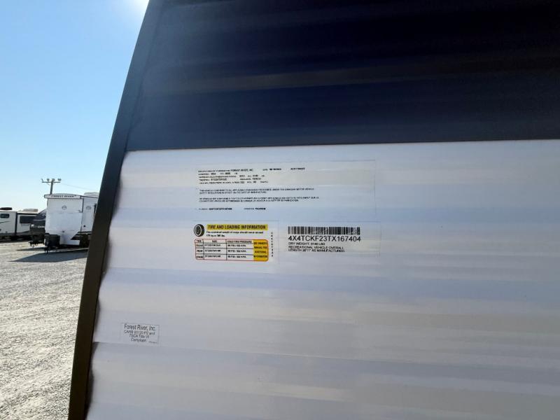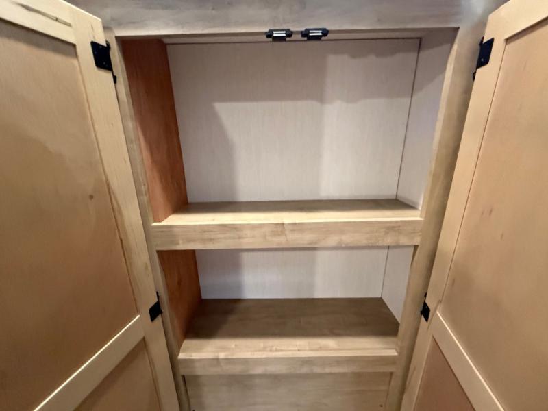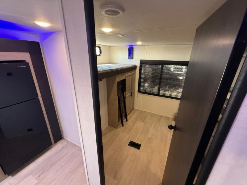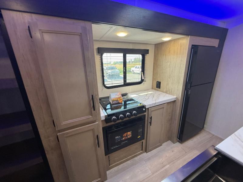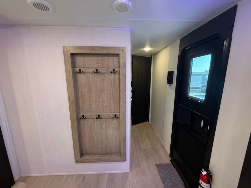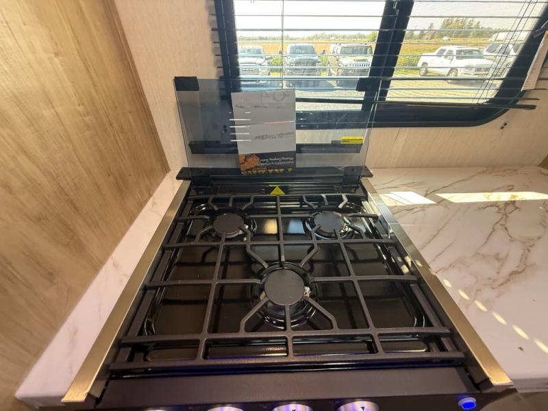 The whole gang will love this travel trailer with triple slides for more space. Your guests or the kids are sure to claim the rear private bunkhouse with a double bunk plus a flip-up bunk above a sofa and a TV mount if you want to add a television here. You'll have the front private bedroom with an RV king bed all to yourselves, and the full bath is close by for easy nighttime use. The middle combined kitchen and living area features dual opposing slides, a kitchen island, plus a U-shaped dinette and sofa. There is also an entertainment center with a fireplace and a hidden pantry behind for movies, snacks and more. Outside, two power awnings, exterior storage, and an outside kitchen makes it easier to spend more time outdoors!
