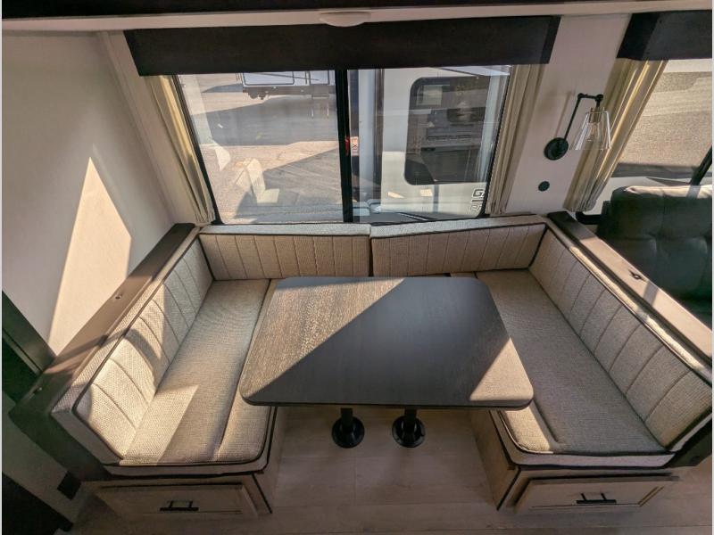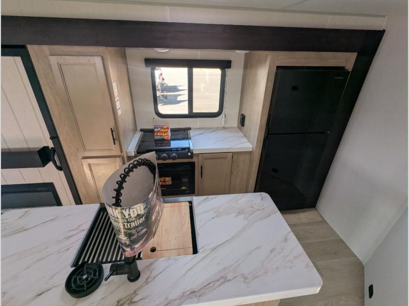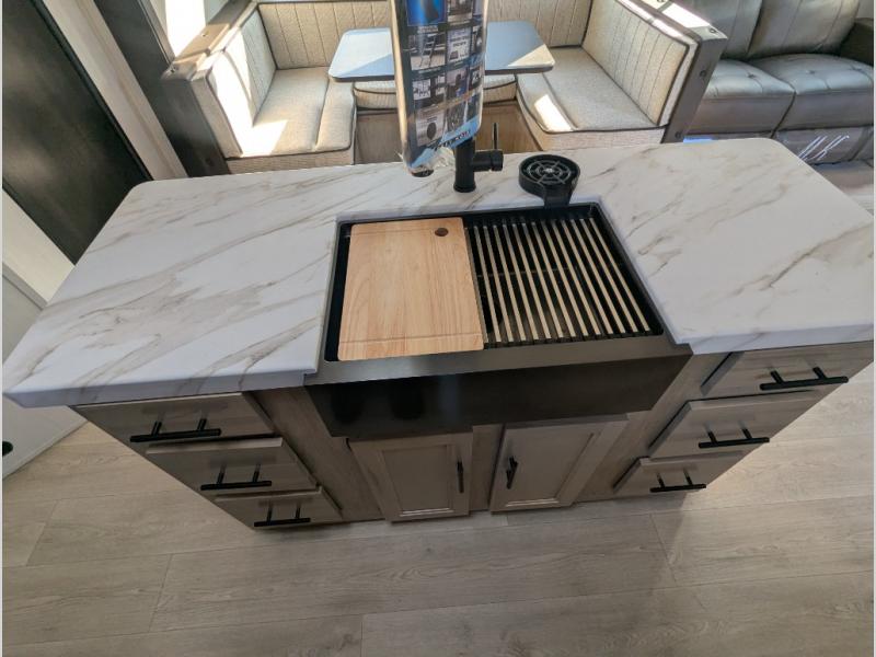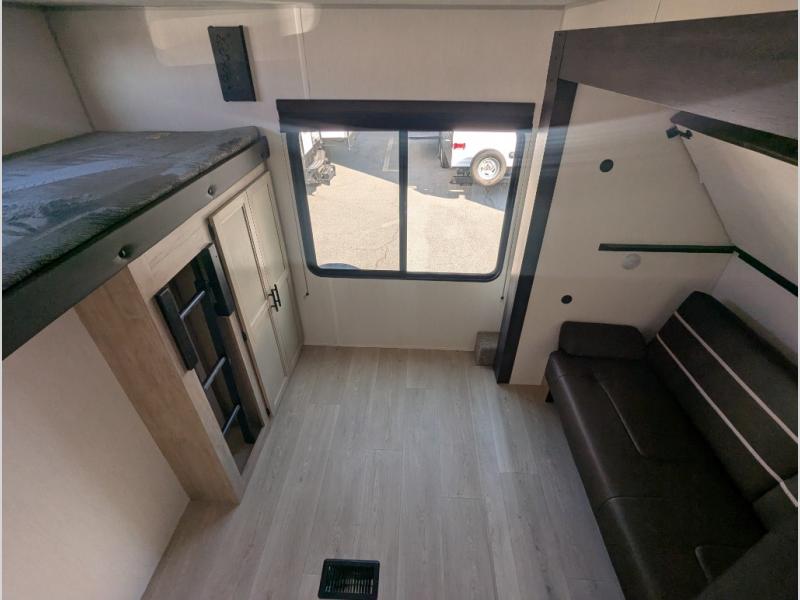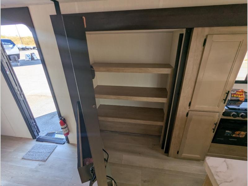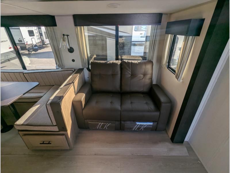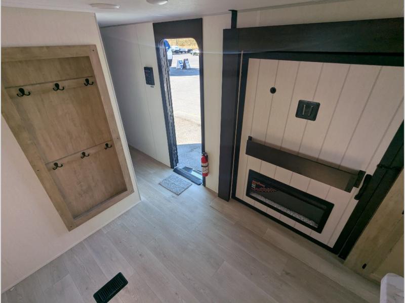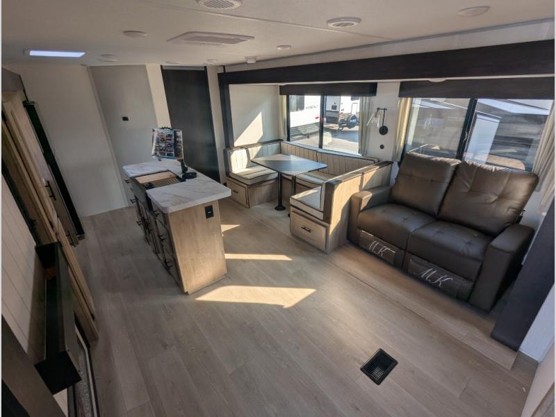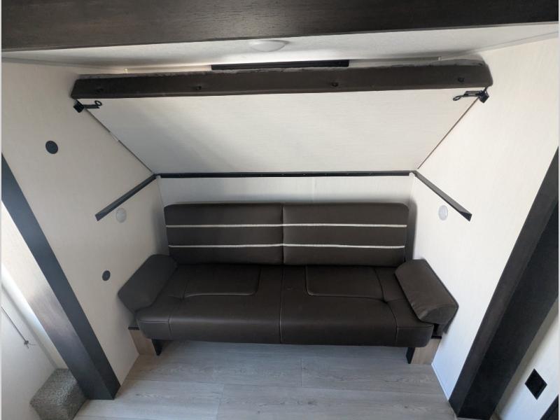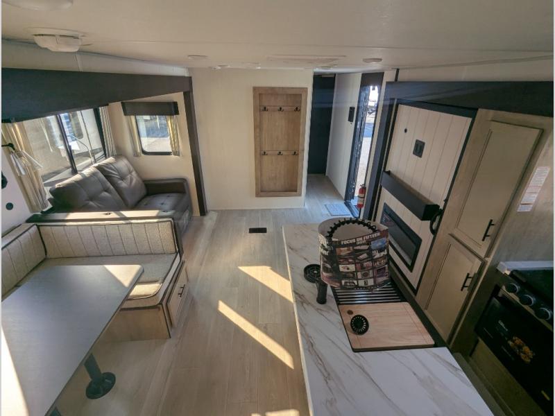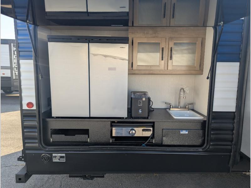 The whole gang will love this travel trailer with triple slides for more space. Your guests or the kids are sure to claim the rear private bunkhouse with a double bunk plus a flip-up bunk above a sofa and a TV mount if you want to add a television here. You'll have the front private bedroom with an RV king bed all to yourselves, and the full bath is close by for easy nighttime use. The middle combined kitchen and living area features dual opposing slides, a kitchen island, plus a U-shaped dinette and sofa. There is also an entertainment center with a fireplace and a hidden pantry behind for movies, snacks and more. Outside, two power awnings, exterior storage, and an outside kitchen makes it easier to spend more time outdoors!