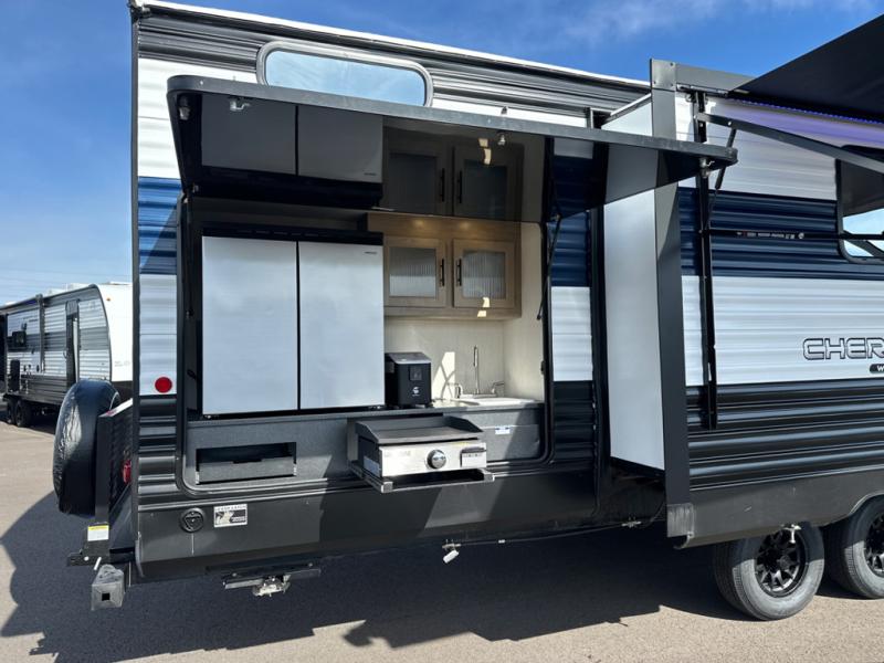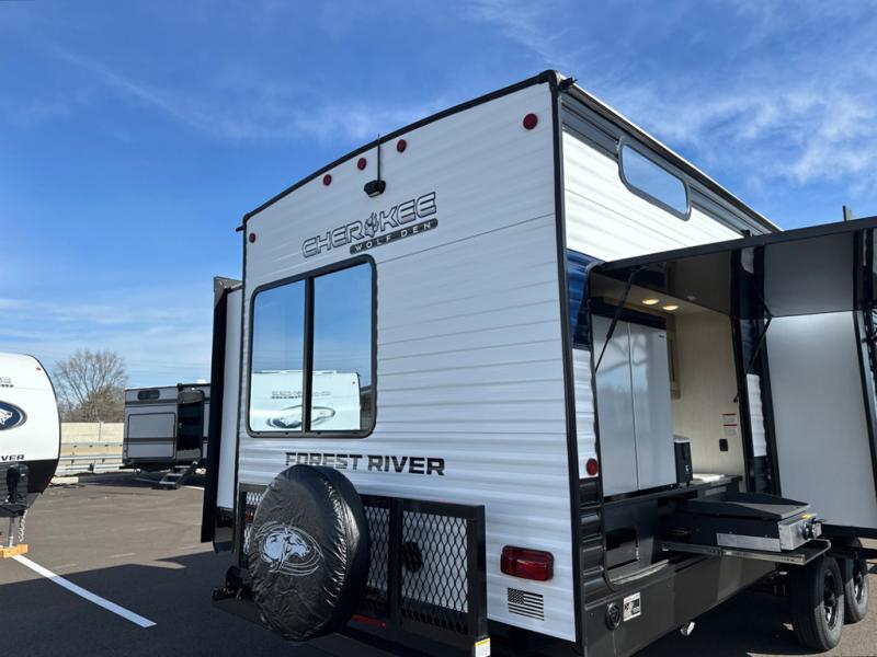 If the open road is calling your name, then answer it with one of these Forest River Cherokee Wolf Den travel trailers! You'll find better comfort, style and value in these trailers, giving you more freedom to enjoy the camping lifestyle. Like with all Forest River products, the Wolf Den features durable construction materials and convenient amenities, such as outdoor storage and battery disconnect. With at least one slide in each model, you'll enjoy open living spaces, along with full bath and kitchen amenities, and comfortable sleeping arrangements.