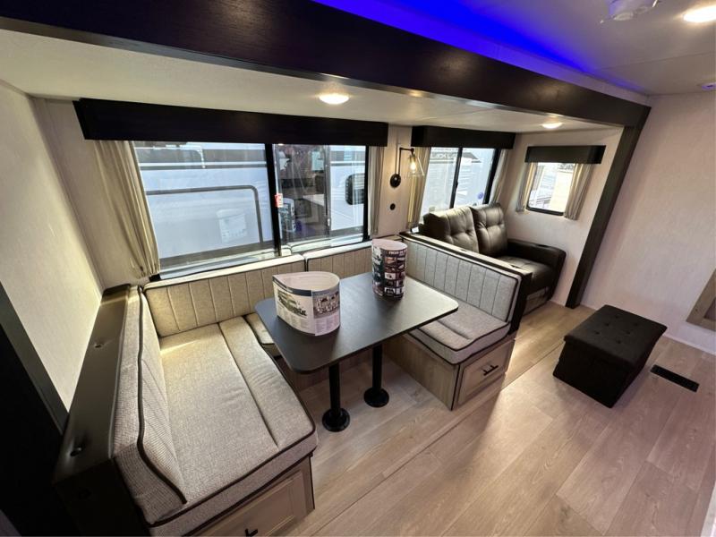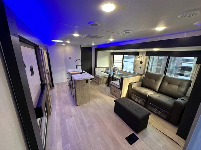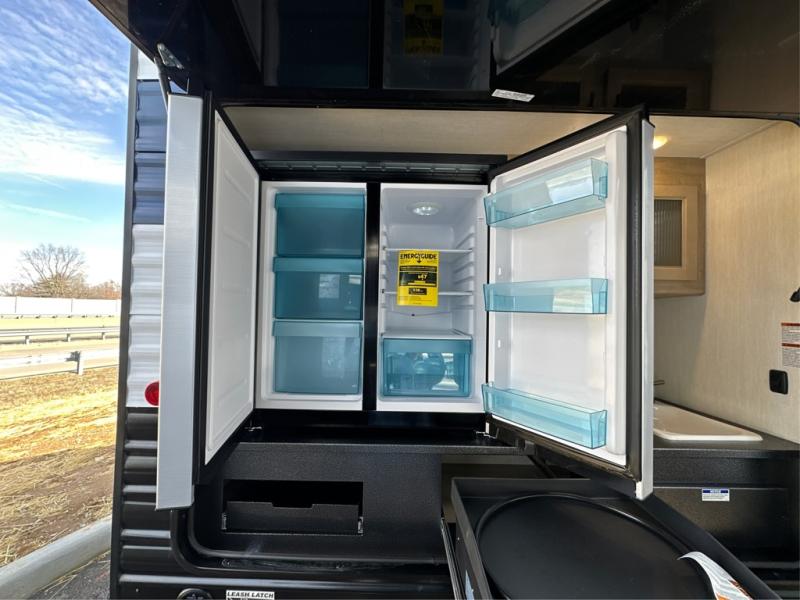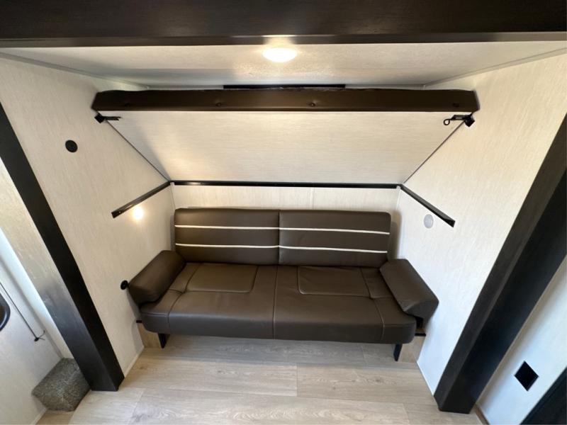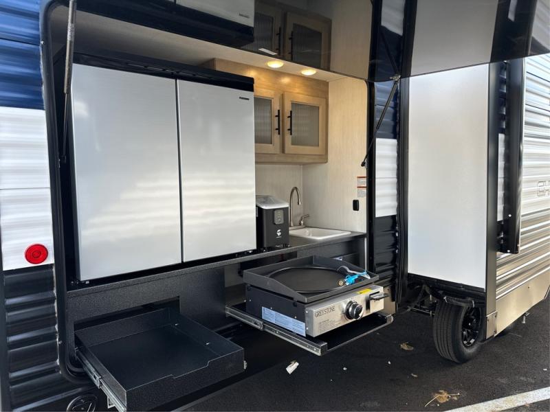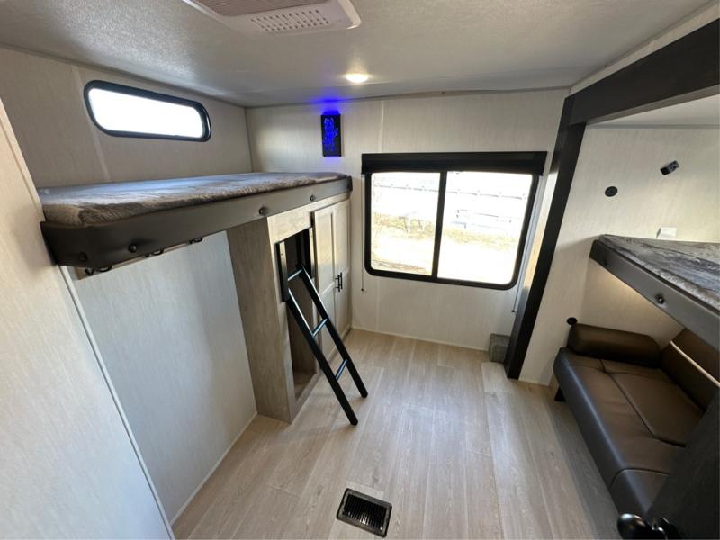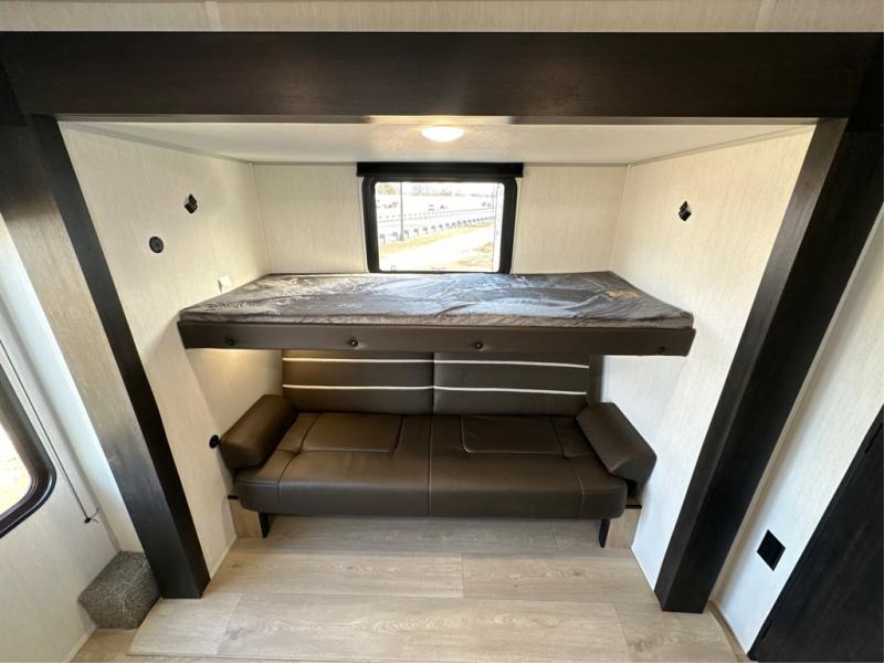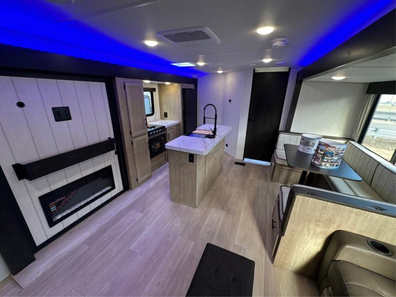 The whole gang will love this travel trailer with triple slides for more space. Your guests or the kids are sure to claim the rear private bunkhouse with a double bunk plus a flip-up bunk above a sofa and a TV mount if you want to add a television here. You'll have the front private bedroom with an RV king bed all to yourselves, and the full bath is close by for easy nighttime use. The middle combined kitchen and living area features dual opposing slides, a kitchen island, plus a U-shaped dinette and sofa. There is also an entertainment center with a fireplace and a hidden pantry behind for movies, snacks and more. Outside, two power awnings, exterior storage, and an outside kitchen makes it easier to spend more time outdoors!