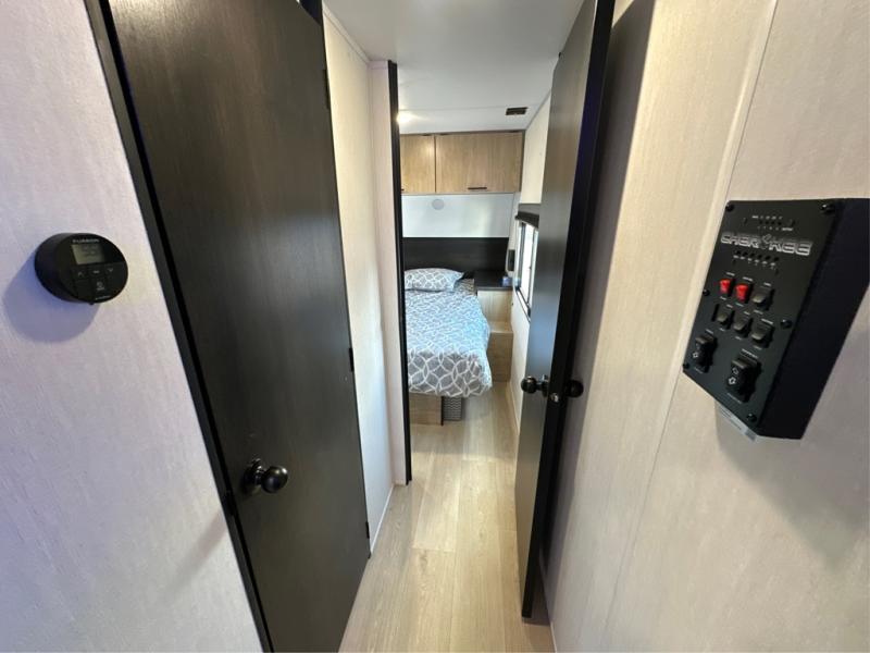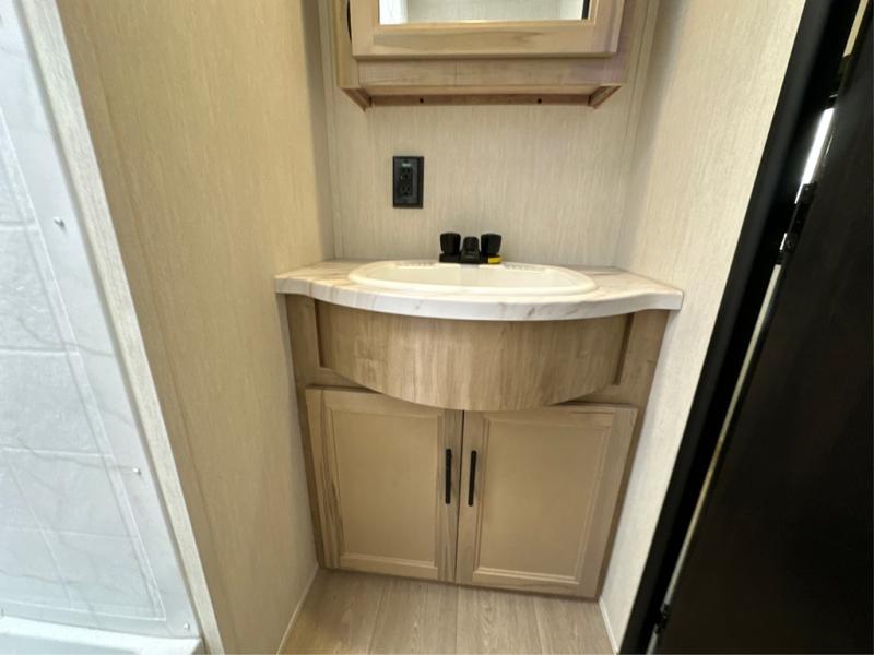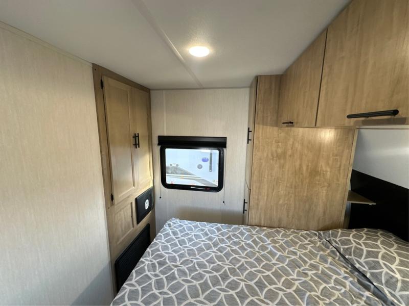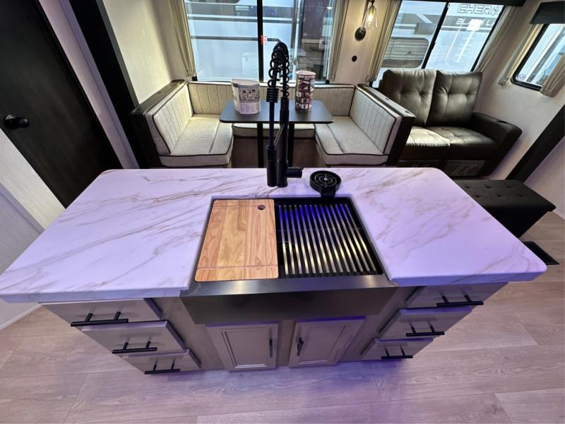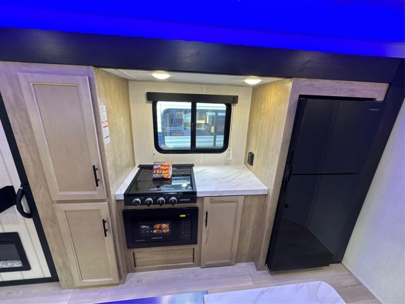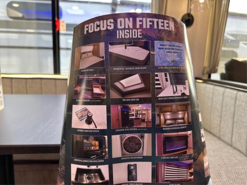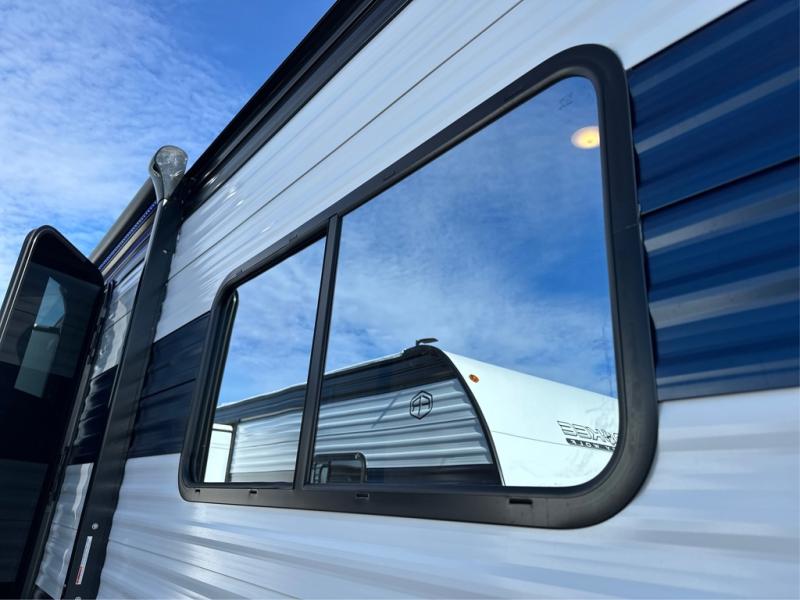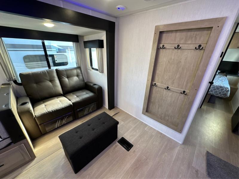 The whole gang will love this travel trailer with triple slides for more space. Your guests or the kids are sure to claim the rear private bunkhouse with a double bunk plus a flip-up bunk above a sofa and a TV mount if you want to add a television here. You'll have the front private bedroom with an RV king bed all to yourselves, and the full bath is close by for easy nighttime use. The middle combined kitchen and living area features dual opposing slides, a kitchen island, plus a U-shaped dinette and sofa. There is also an entertainment center with a fireplace and a hidden pantry behind for movies, snacks and more. Outside, two power awnings, exterior storage, and an outside kitchen makes it easier to spend more time outdoors!