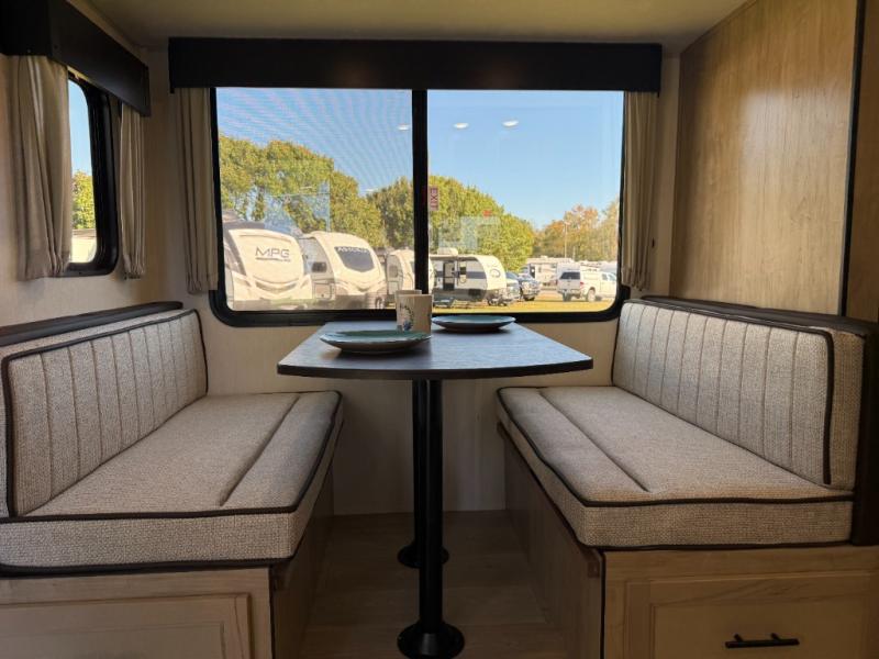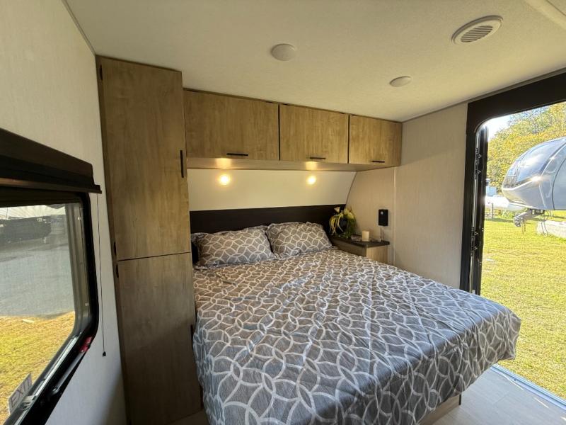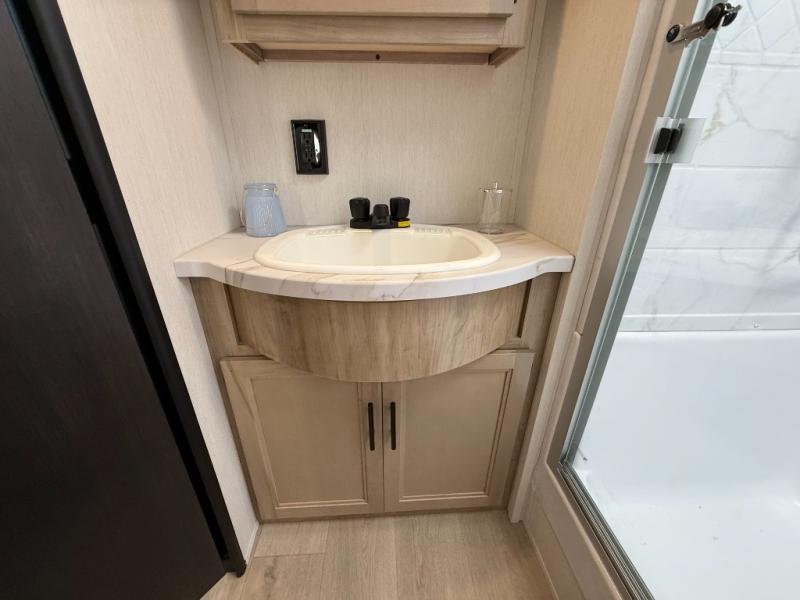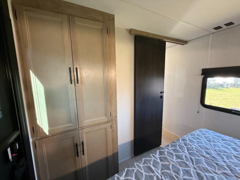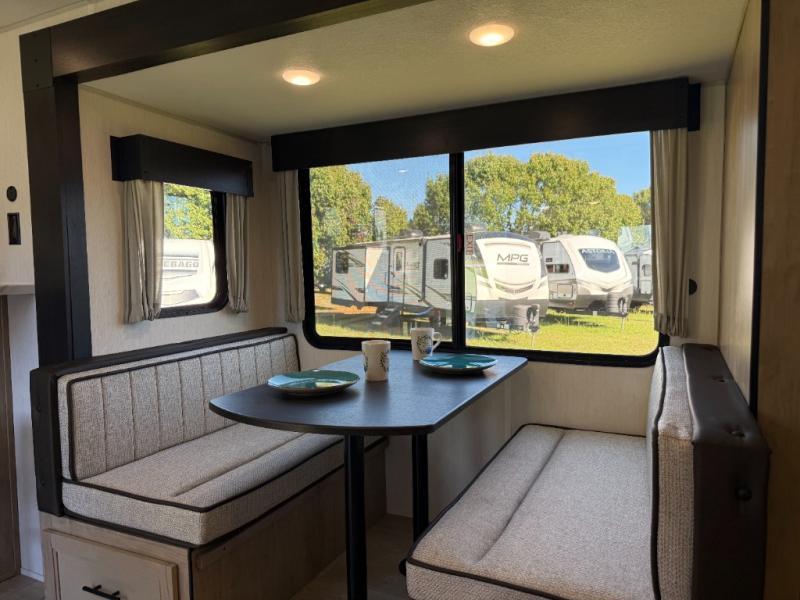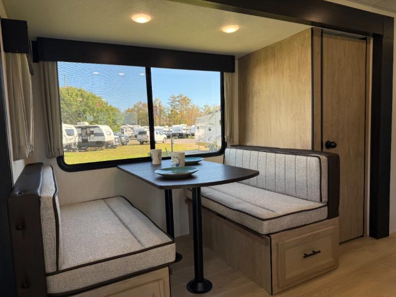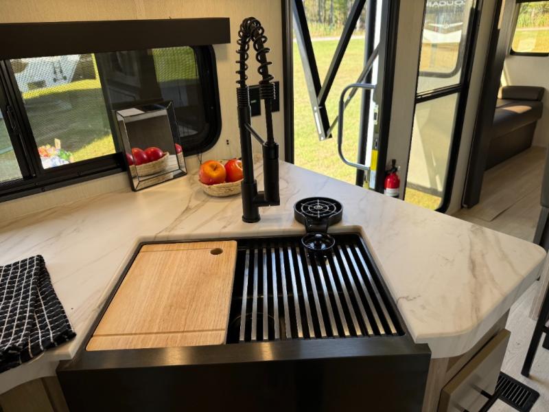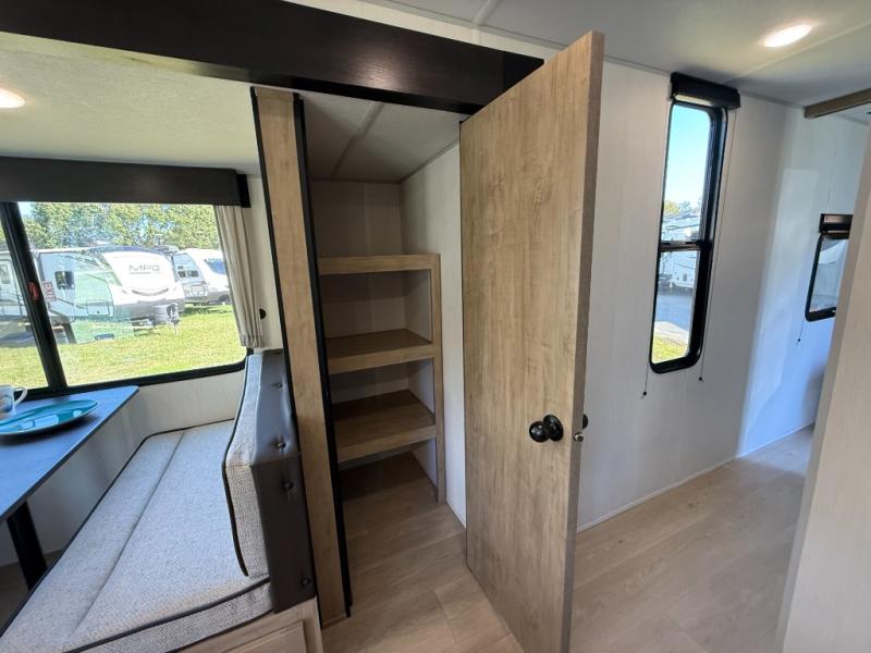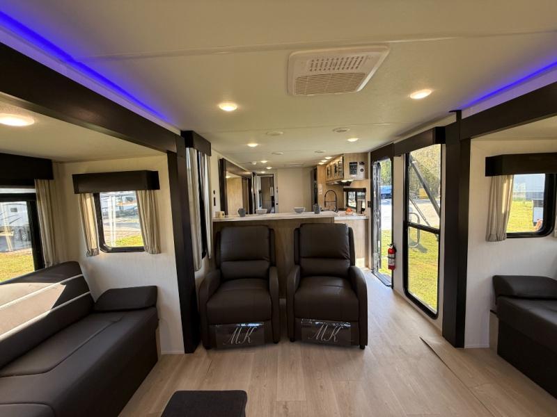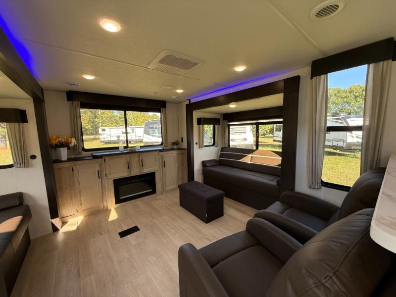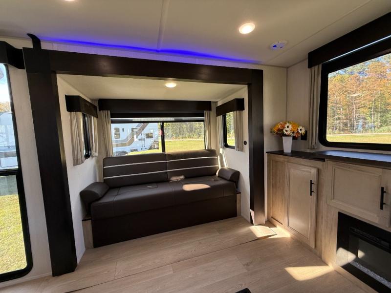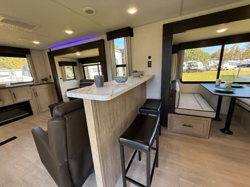Affordable luxury and livability is what you will find in this travel trailer! The rear living area has opposing sofa slides, two recliners, a rear entertainment center with a fireplace, and a panoramic window for added natural lighting. There is even a bar top with two bar stools overlooking the living area so you can enjoy a meal and a movie. The booth dinette slide has a full door pantry next to it so you can quickly grab a snack during game night. Freshen up each morning in the full bathroom with the shower with a seat. The front private bedroom has a walk around RV king bed for a good night's rest and a linen closet with optional washer and dryer prep. You even have an outside kitchen, a rear storage rack, outside storage areas, and an outside TV mount!
