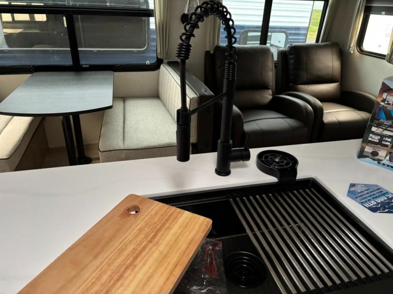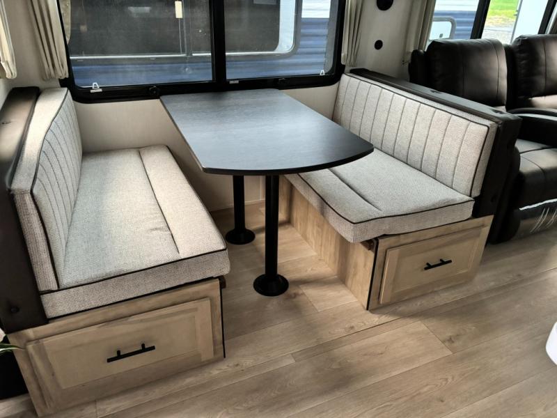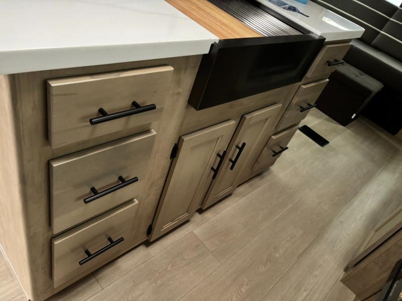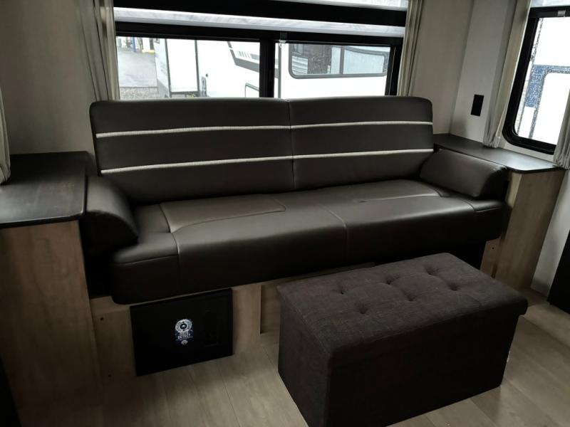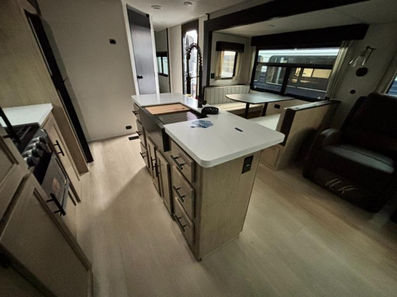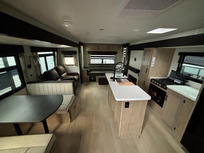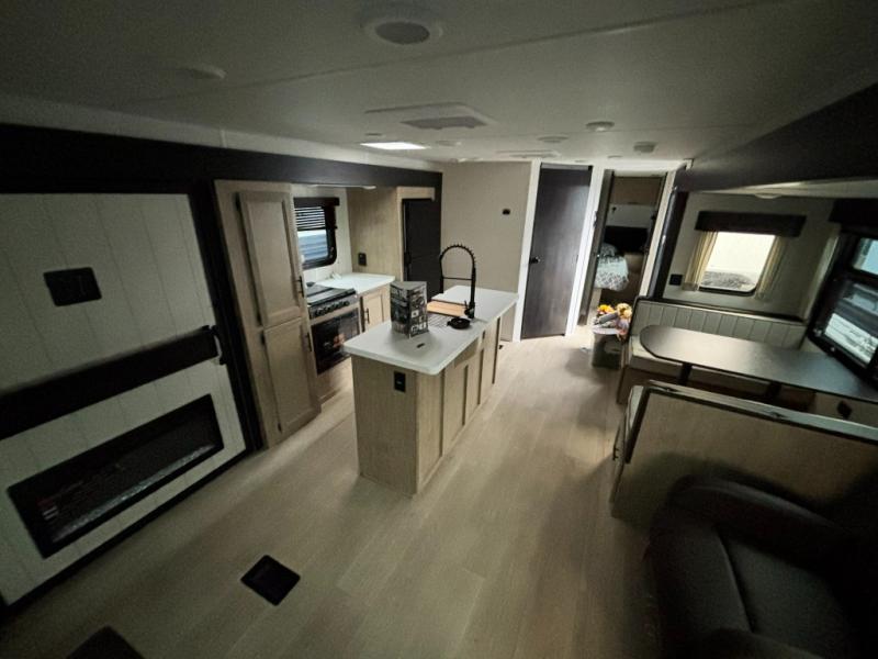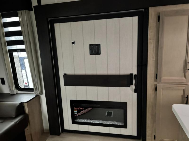 You'll love every minute spent in this double slide out travel trailer. You can relax on the rear sofa or dual lounge chairs, play a game at the booth dinette, and enjoy the glow of the fireplace. The chef of your group will appreciate the kitchen island, air fryer, plus refrigerator and pantry for food storage. A dual entry bath will create a front master bedroom, complete with an RV king bed and a bedside wardrobe to keep your space tidy.