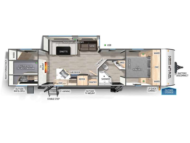 How does having a master bedroom for yourself, a bunkhouse for your oldest kiddo and a loft area for two more kids sound in your next travel trailer? This innovated design gives everyone their own space at night with a full queen loft bed, a 36" bunk bed and a walk-around queen bed, plus the U-shaped dinette and sofa provide more sleeping space. Everyone will enjoy the fireplace on chilly nights and the cook will love all the kitchen appliances including the large pantry and farm sink. The outdoor bar and grill with a side-by-side refrigerator and freezer, an ice maker, a pull-out cooktop, a sink and large storage areas are a must have when you love to be outside.