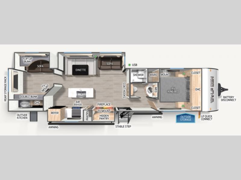 The whole gang will love this travel trailer with triple slides for more space. Your guests or the kids are sure to claim the rear private bunkhouse with a double bunk plus a flip-up bunk above a sofa and a TV mount if you want to add a television here. You'll have the front private bedroom with an RV king bed all to yourselves, and the full bath is close by for easy nighttime use. The middle combined kitchen and living area features dual opposing slides, a kitchen island, plus a U-shaped dinette and sofa. There is also an entertainment center with a fireplace and a hidden pantry behind for movies, snacks and more. Outside, two power awnings, exterior storage, and an outside kitchen makes it easier to spend more time outdoors!