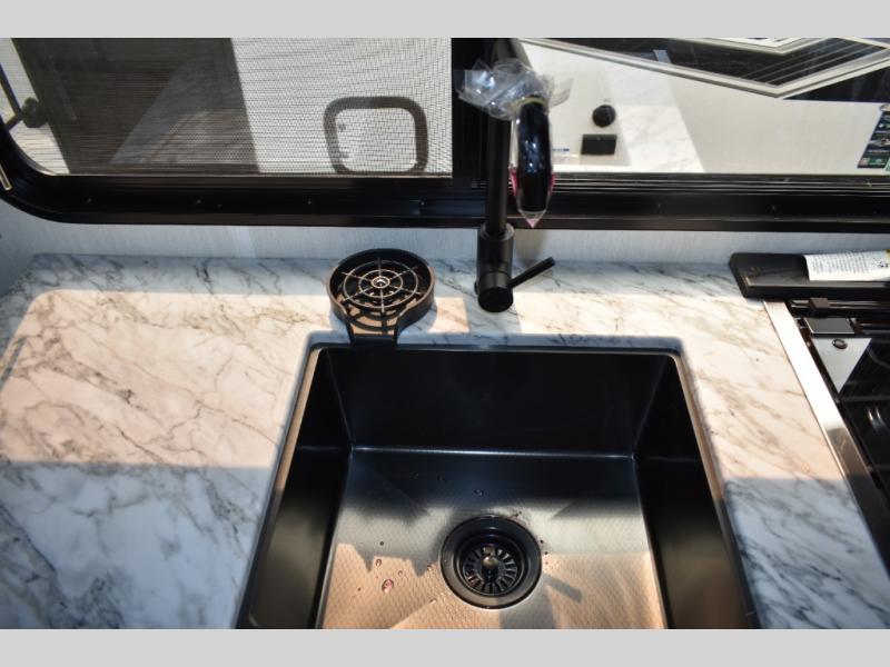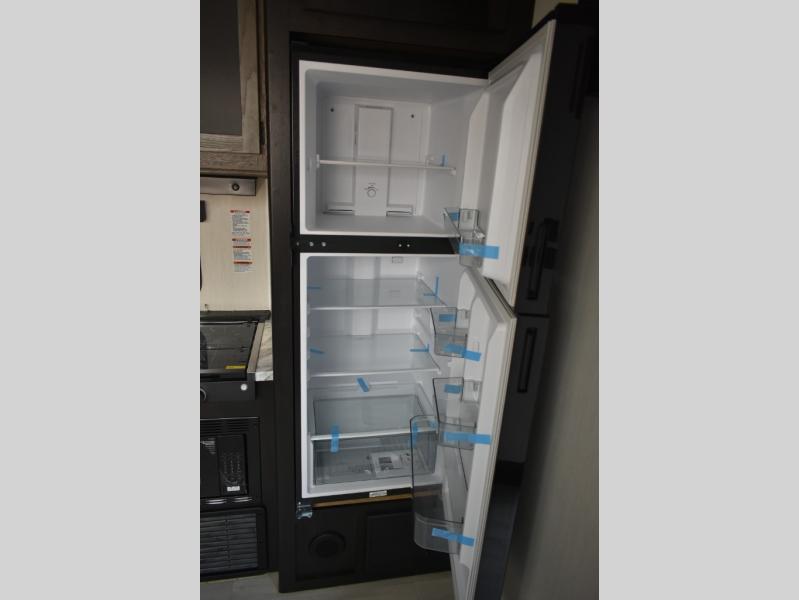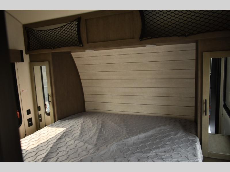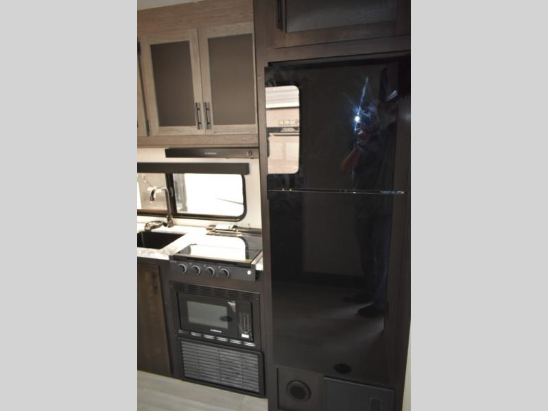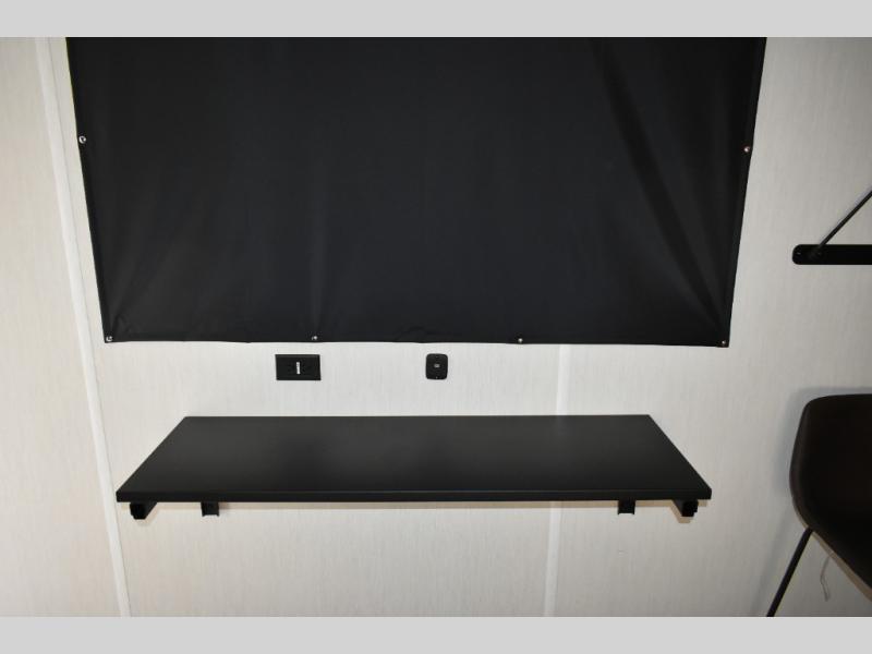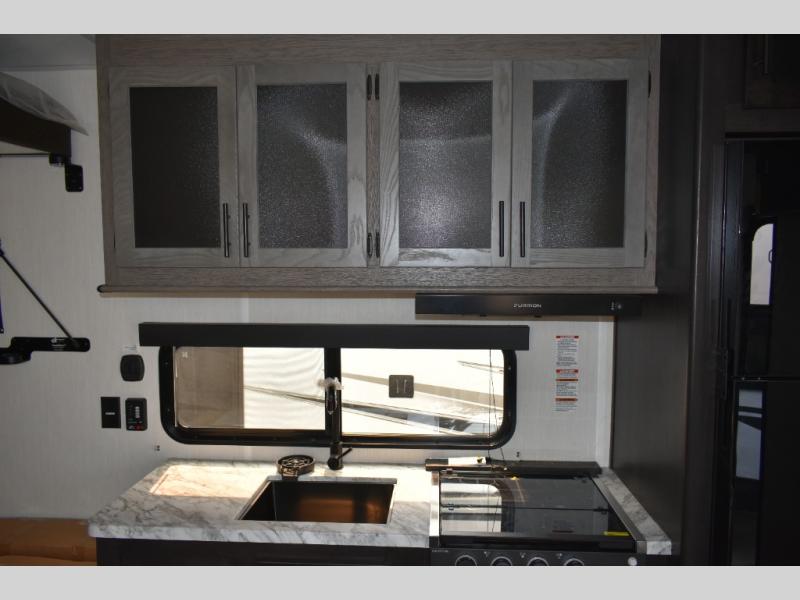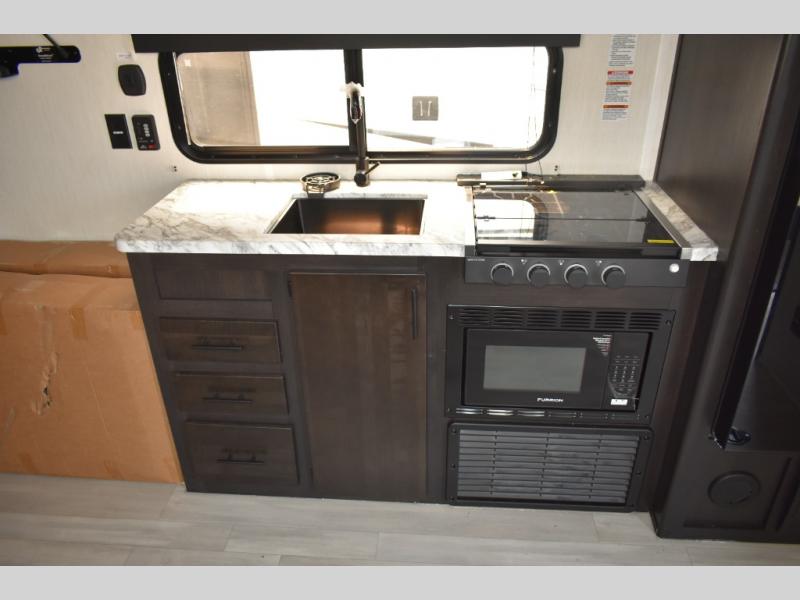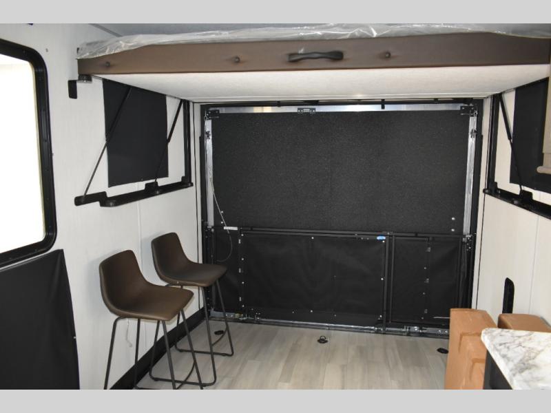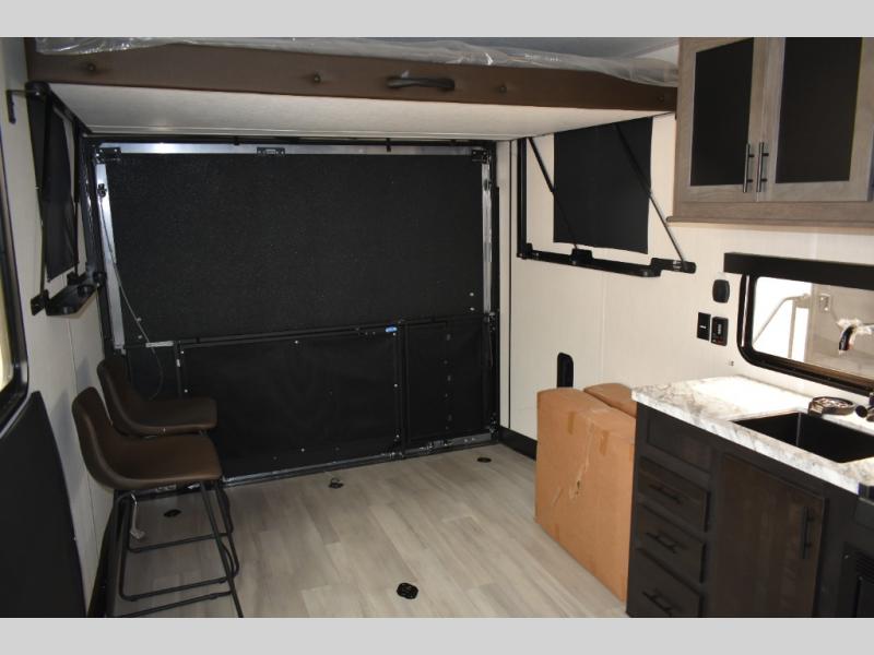 You can't go wrong when you have this toy hauler in tow! There is 14' 6" of cargo space for your toys, and an optional ramp door patio deck railing can be added if you want to turn the door into a patio. The three burner cooktop will allow you to make meals each day, and the flip-up counter with stools provides a place to dine at. You could also take your plate outdoors to eat under the 18' power awning with LED accent lighting. You'll sleep great each night on the RV king bed in the front bedroom, while your guests take the quick set bed system in the garage!