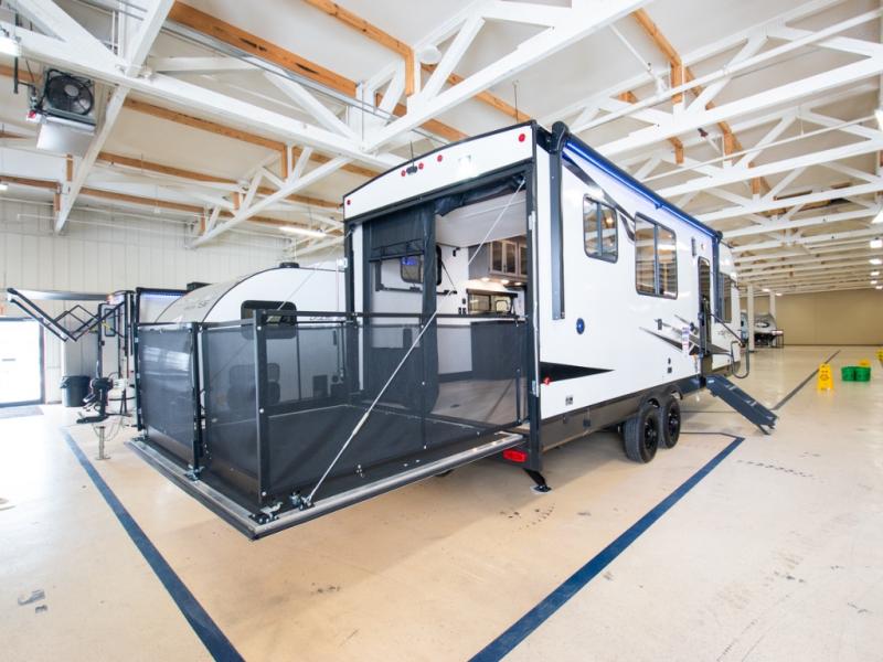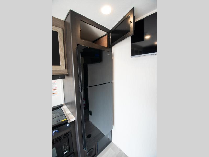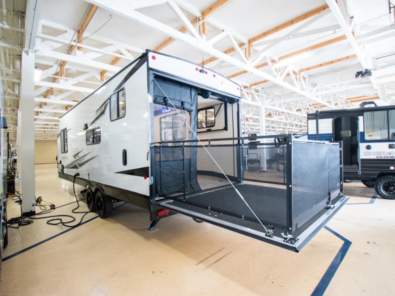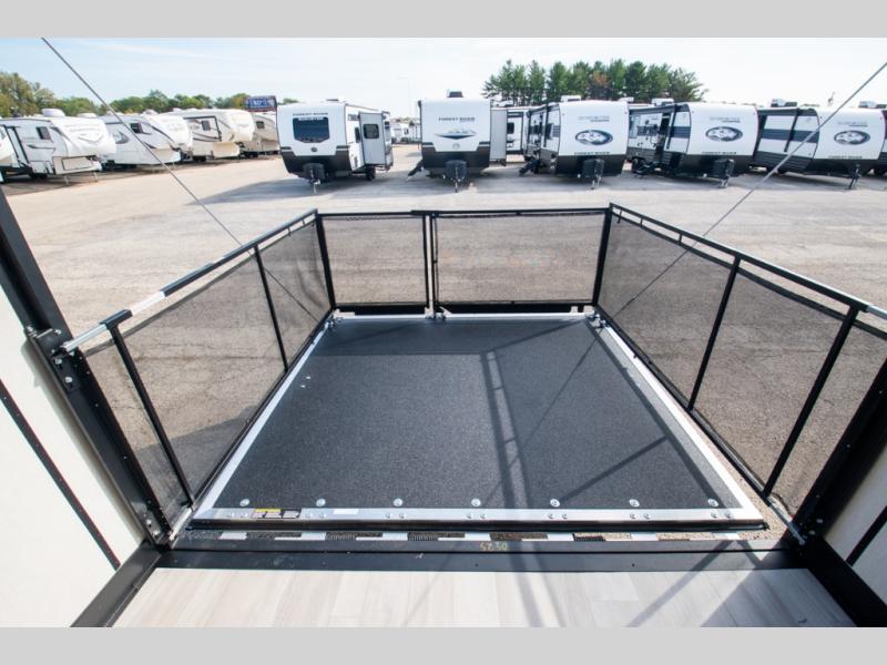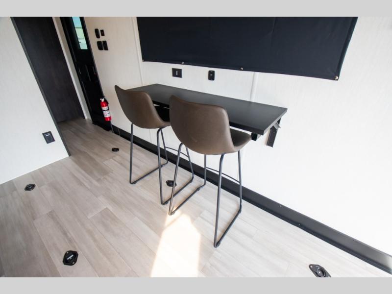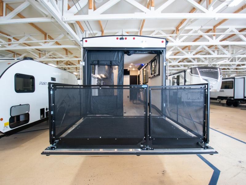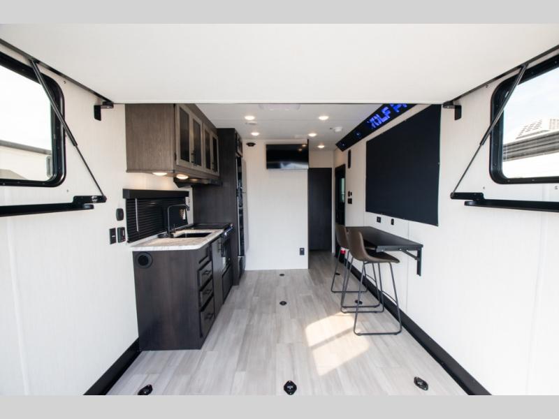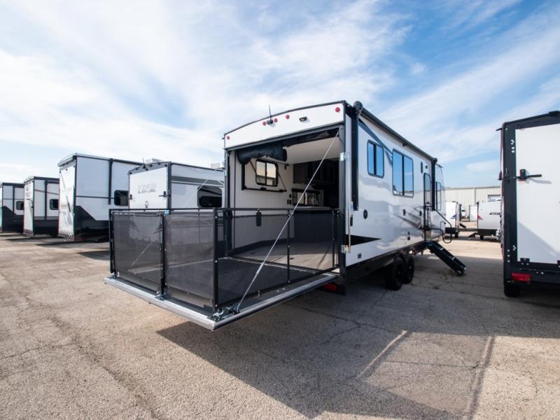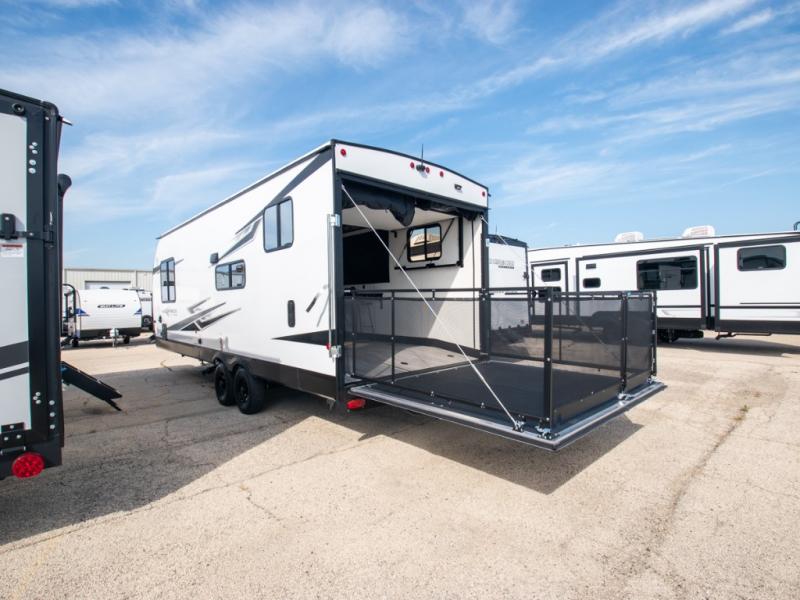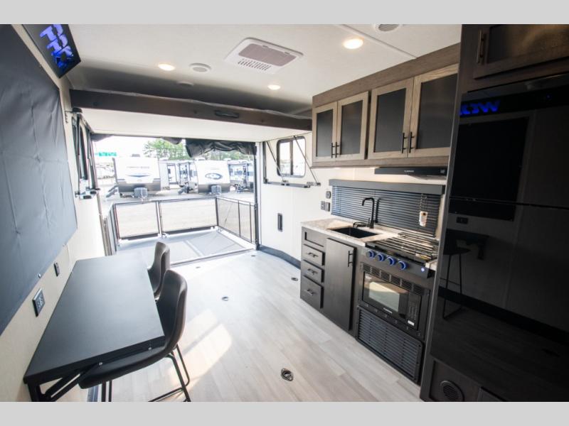 You can't go wrong when you have this toy hauler in tow! There is 14' 6" of cargo space for your toys, and an optional ramp door patio deck railing can be added if you want to turn the door into a patio. The three burner cooktop will allow you to make meals each day, and the flip-up counter with stools provides a place to dine at. You could also take your plate outdoors to eat under the 18' power awning with LED accent lighting. You'll sleep great each night on the RV king bed in the front bedroom, while your guests take the quick set bed system in the garage!