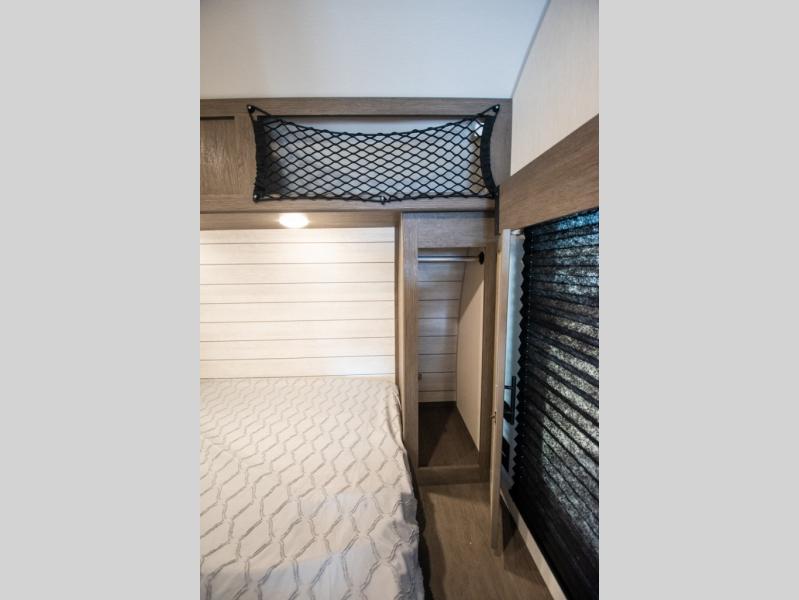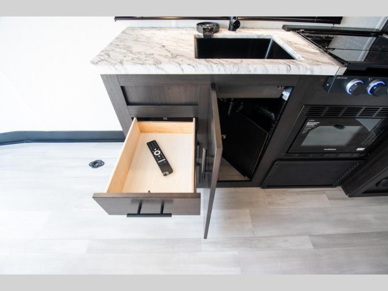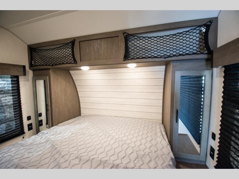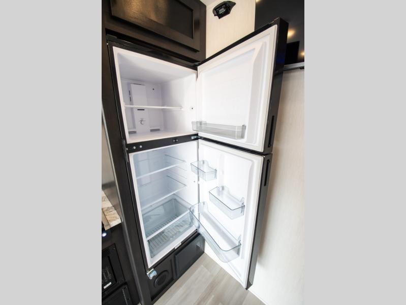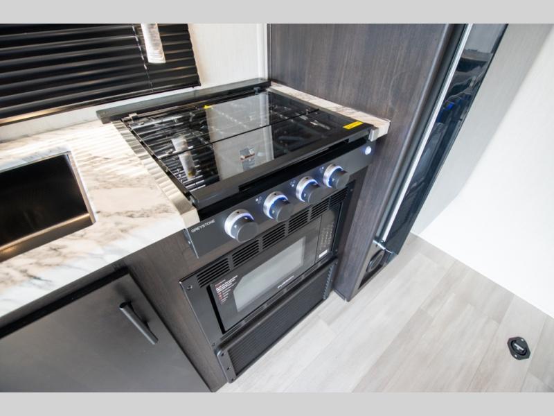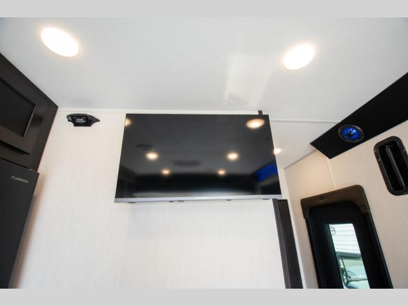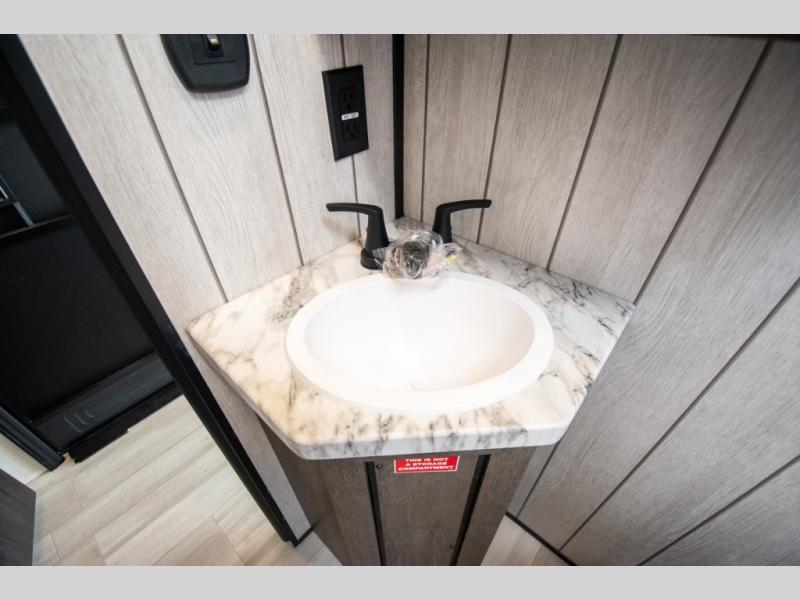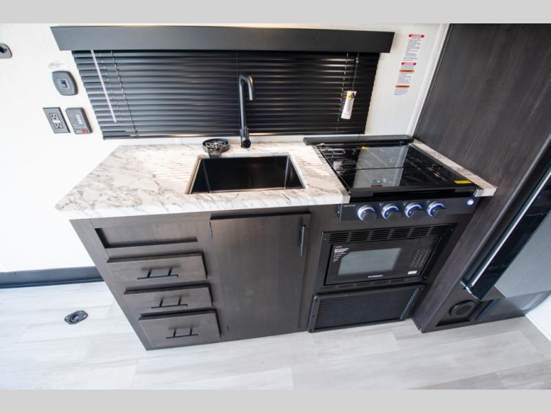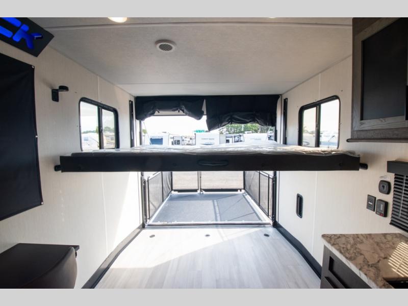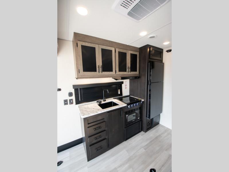 You can't go wrong when you have this toy hauler in tow! There is 14' 6" of cargo space for your toys, and an optional ramp door patio deck railing can be added if you want to turn the door into a patio. The three burner cooktop will allow you to make meals each day, and the flip-up counter with stools provides a place to dine at. You could also take your plate outdoors to eat under the 18' power awning with LED accent lighting. You'll sleep great each night on the RV king bed in the front bedroom, while your guests take the quick set bed system in the garage!