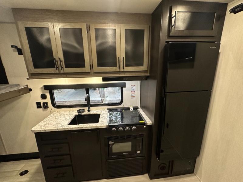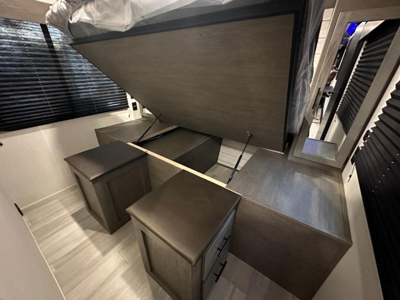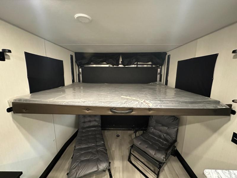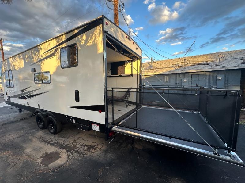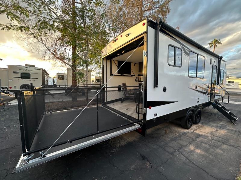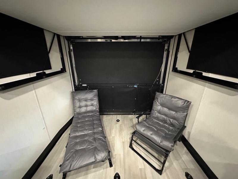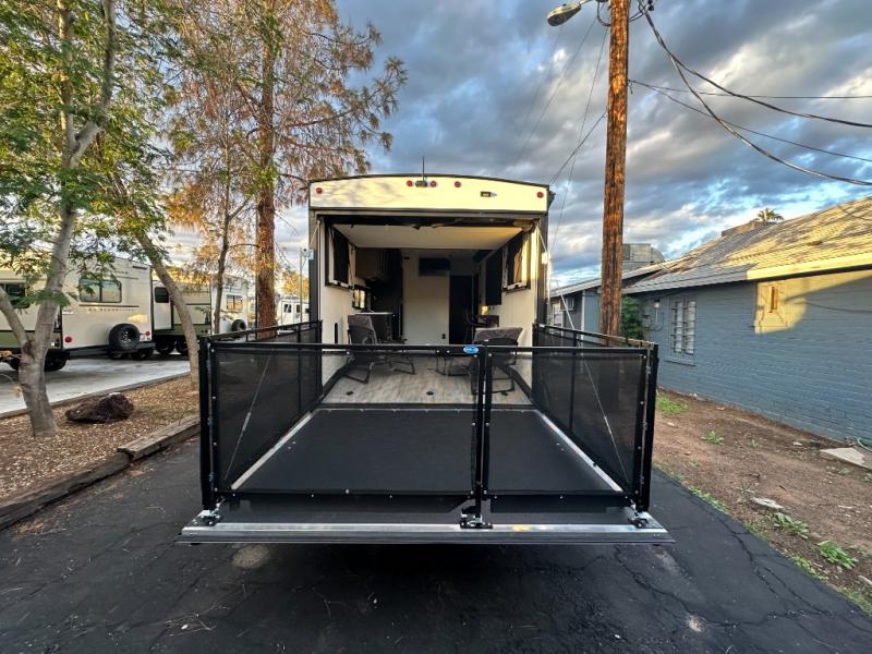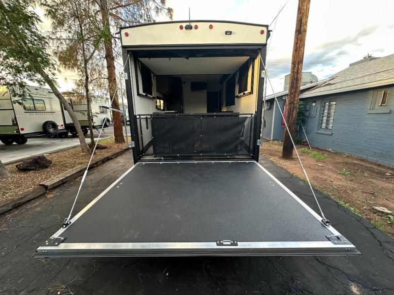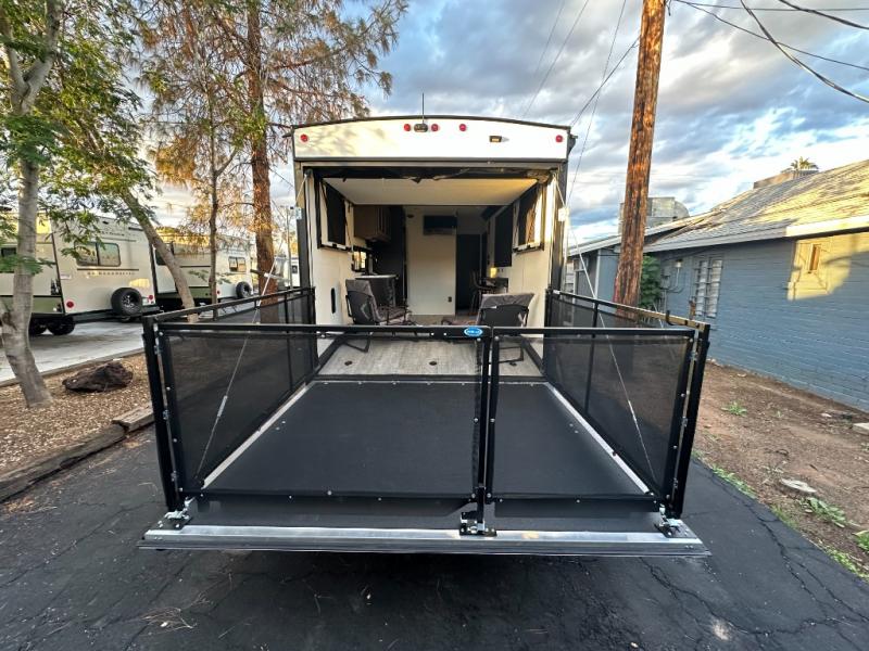 You can't go wrong when you have this toy hauler in tow! There is 14' 6" of cargo space for your toys, and an optional ramp door patio deck railing can be added if you want to turn the door into a patio. The three burner cooktop will allow you to make meals each day, and the flip-up counter with stools provides a place to dine at. You could also take your plate outdoors to eat under the 18' power awning with LED accent lighting. You'll sleep great each night on the RV king bed in the front bedroom, while your guests take the quick set bed system in the garage!
