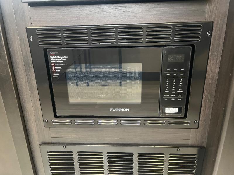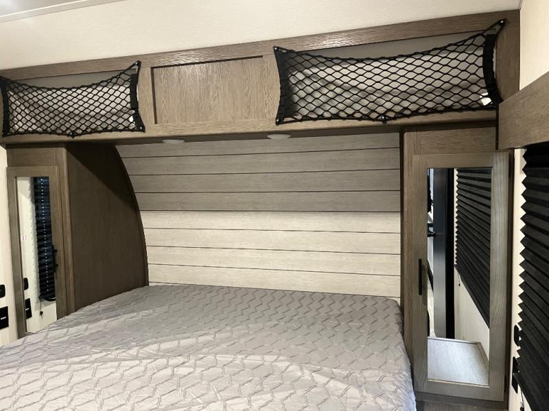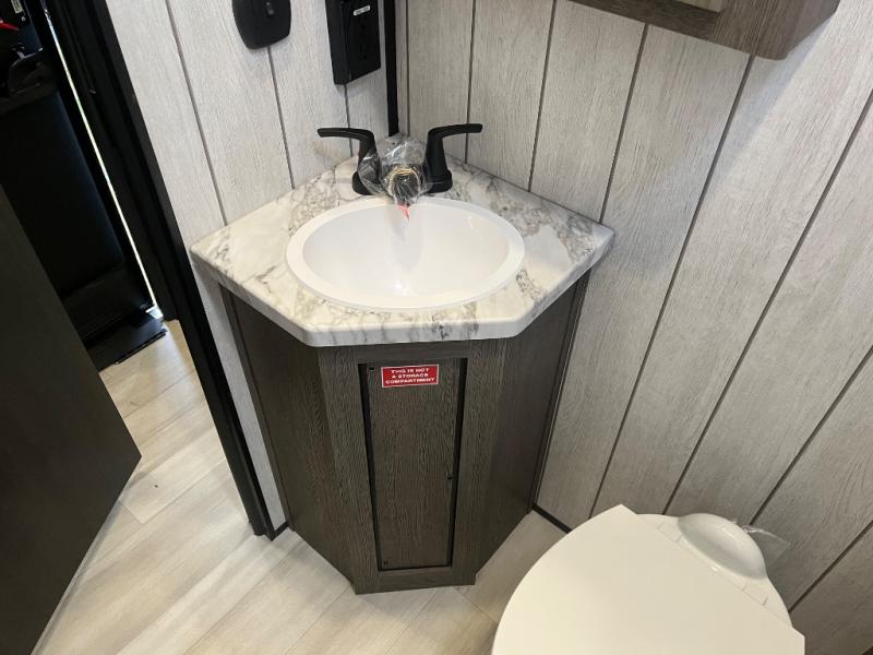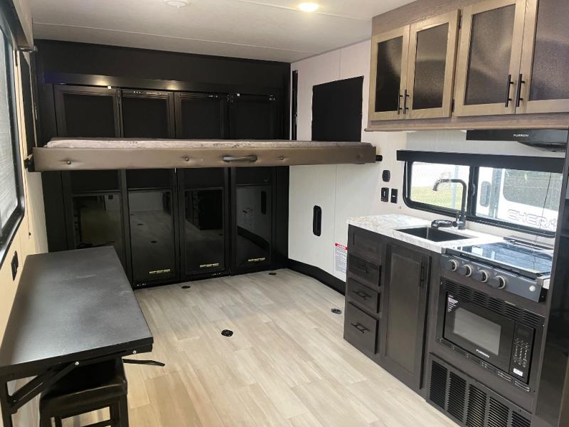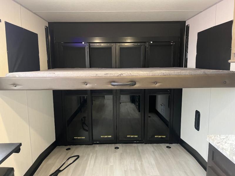 You can't go wrong when you have this toy hauler in tow! There is 14' 6" of cargo space for your toys, and an optional ramp door patio deck railing can be added if you want to turn the door into a patio. The three burner cooktop will allow you to make meals each day, and the flip-up counter with stools provides a place to dine at. You could also take your plate outdoors to eat under the 18' power awning with LED accent lighting. You'll sleep great each night on the RV king bed in the front bedroom, while your guests take the quick set bed system in the garage!