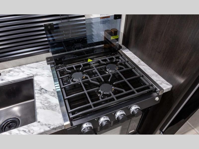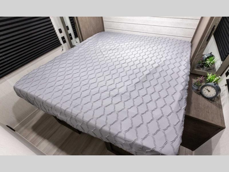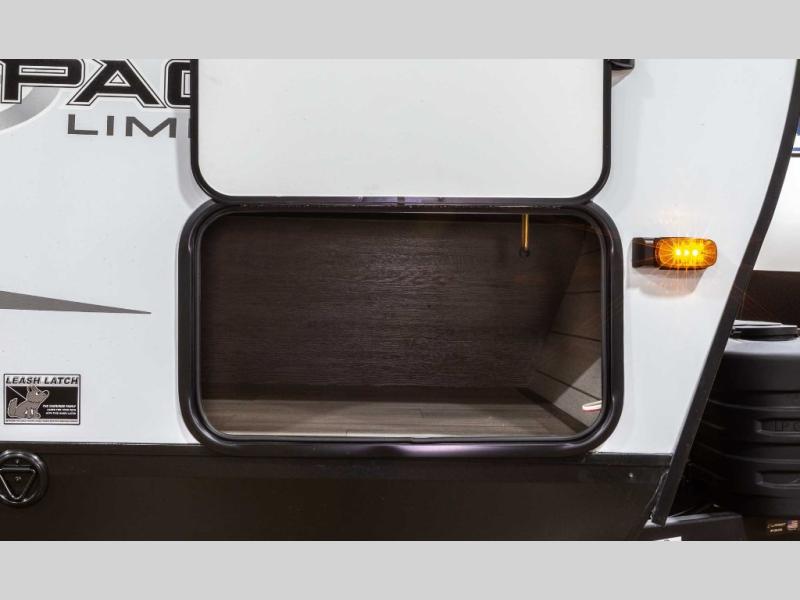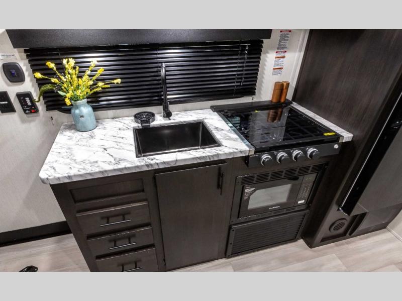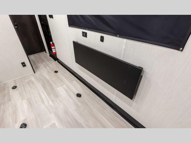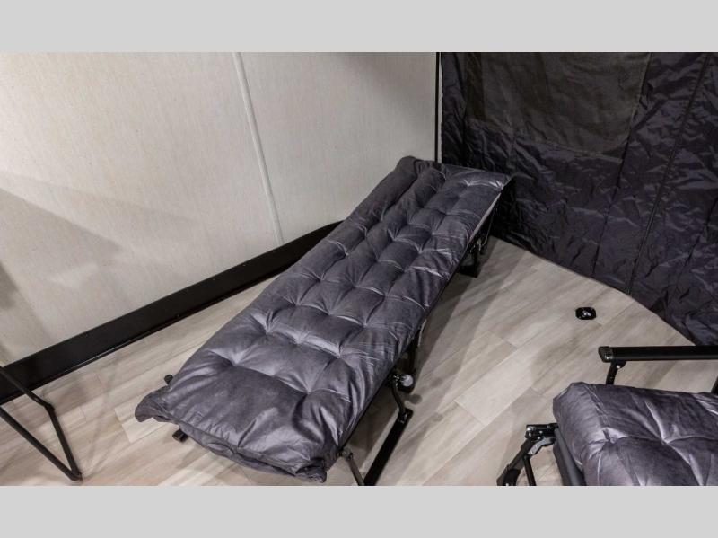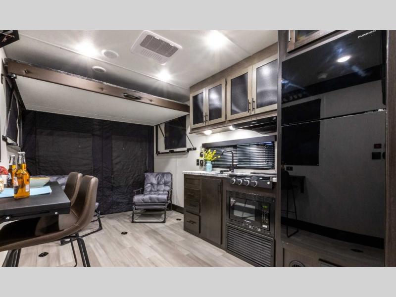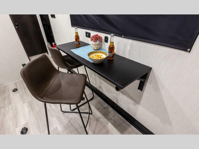 You can't go wrong when you have this toy hauler in tow! There is 14' 6" of cargo space for your toys, and an optional ramp door patio deck railing can be added if you want to turn the door into a patio. The three burner cooktop will allow you to make meals each day, and the flip-up counter with stools provides a place to dine at. You could also take your plate outdoors to eat under the 18' power awning with LED accent lighting. You'll sleep great each night on the RV king bed in the front bedroom, while your guests take the quick set bed system in the garage!