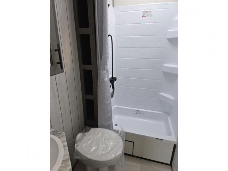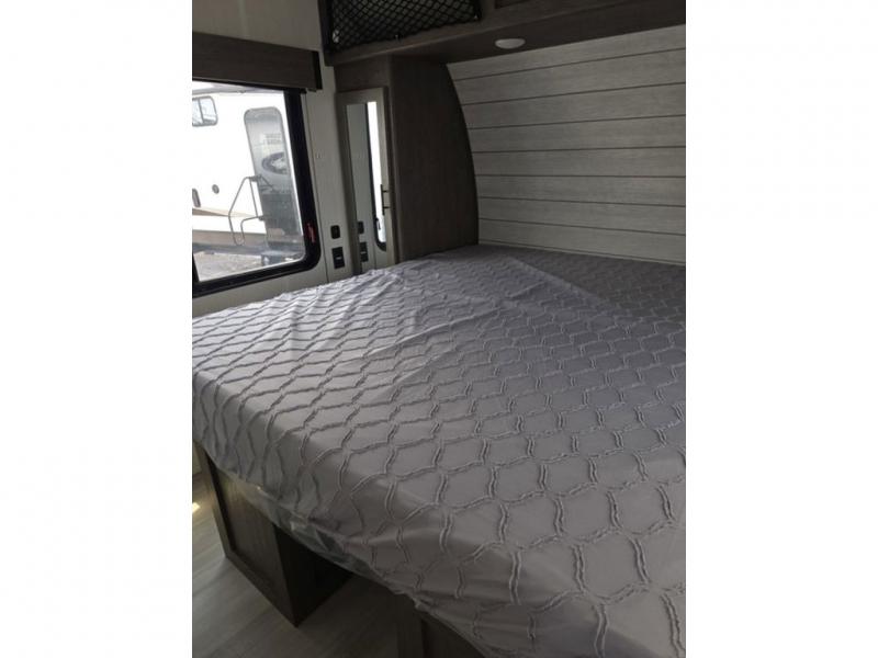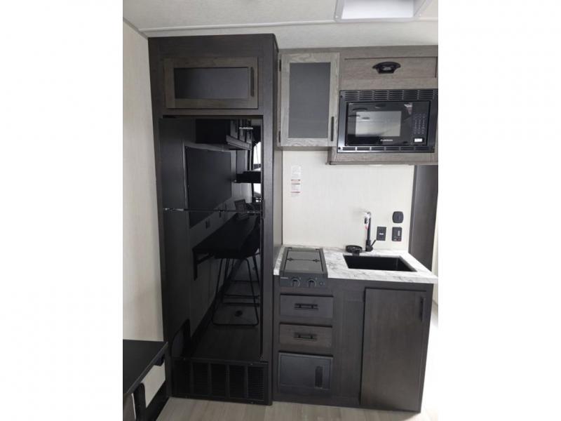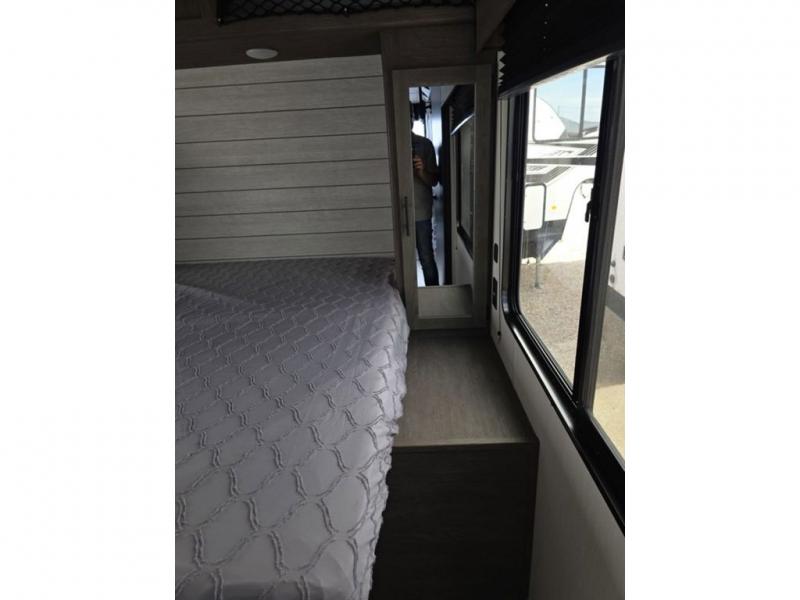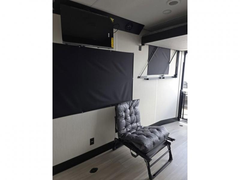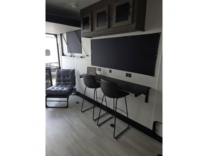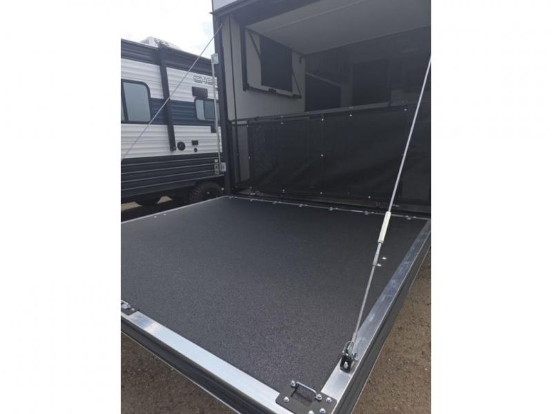 You'll love every minute spent in this spacious toy hauler! Since there is 14' of total garage space, you can plan to bring along kayaks, bikes, and hiking gear galore. This model includes a flip-up counter with stools and full kitchen amenities so you can whip up your best meals each day. The full bath will let you freshen up at night, and the RV king bed in the front bedroom is sure to bring comfort, while your guests take the quick set bed system in the garage!