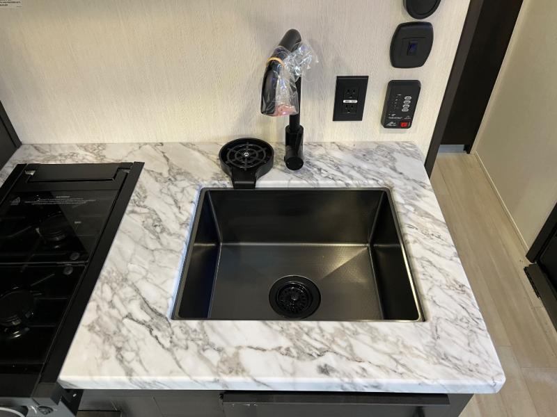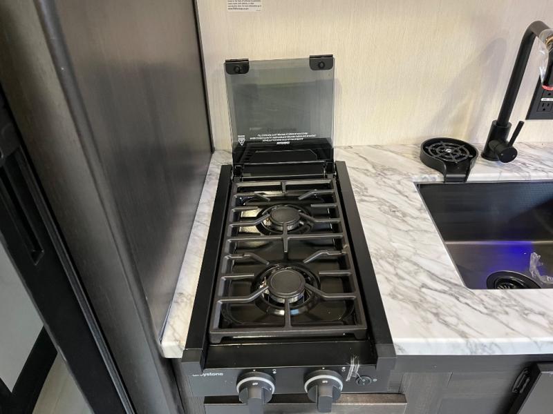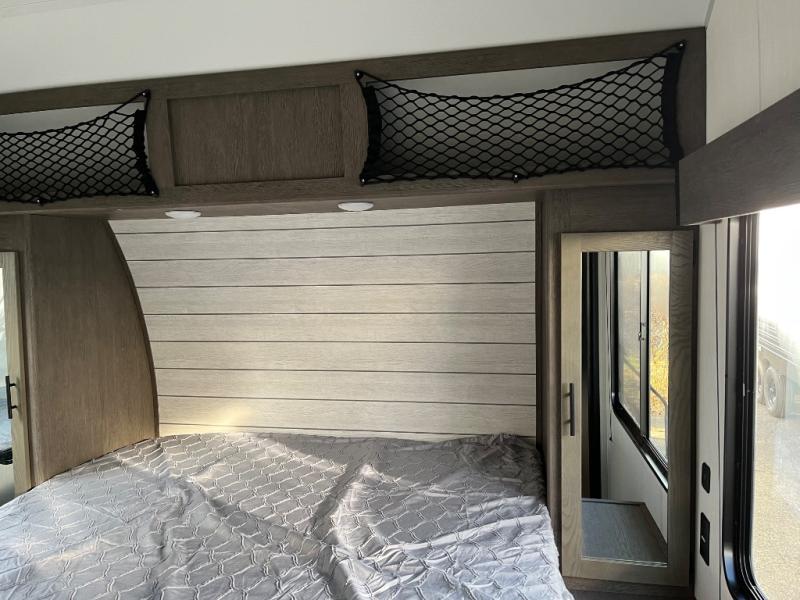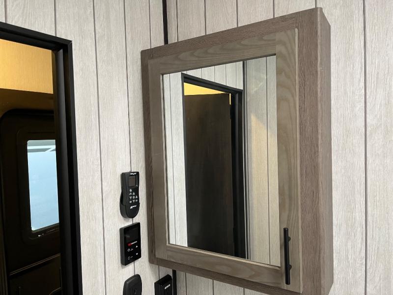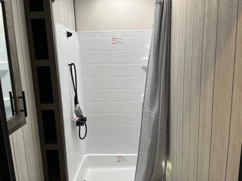 You'll love every minute spent in this spacious toy hauler! Since there is 14' of total garage space, you can plan to bring along kayaks, bikes, and hiking gear galore. This model includes a flip-up counter with stools and full kitchen amenities so you can whip up your best meals each day. The full bath will let you freshen up at night, and the RV king bed in the front bedroom is sure to bring comfort, while your guests take the quick set bed system in the garage!