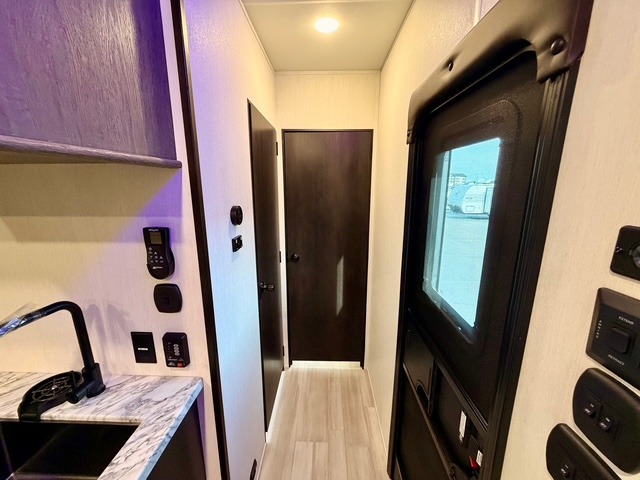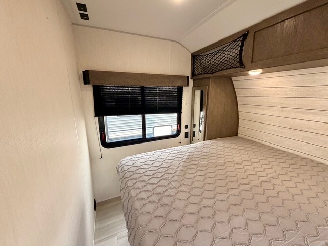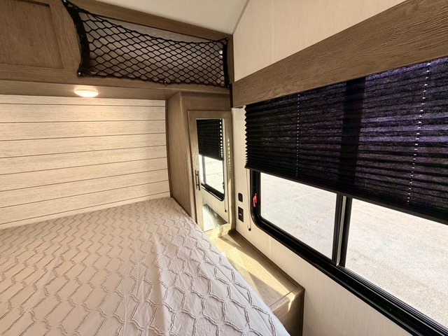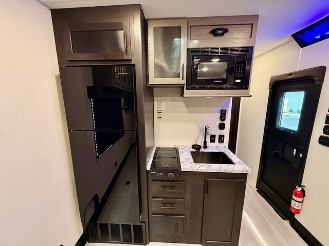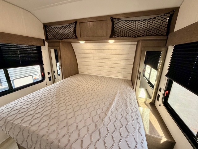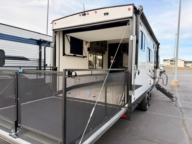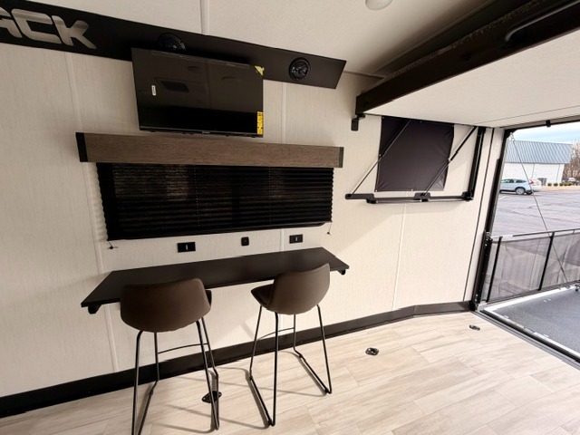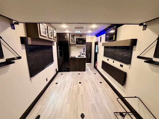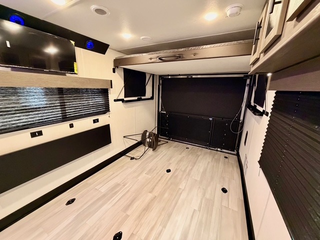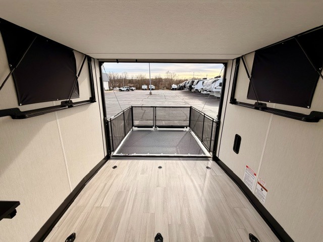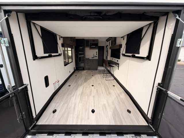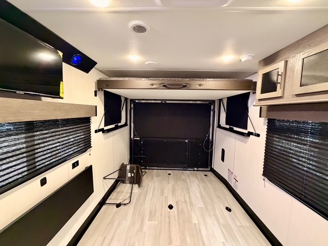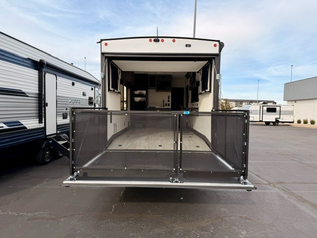 You'll love every minute spent in this spacious toy hauler! Since there is 14' of total garage space, you can plan to bring along kayaks, bikes, and hiking gear galore. This model includes a flip-up counter with stools and full kitchen amenities so you can whip up your best meals each day. The full bath will let you freshen up at night, and the RV king bed in the front bedroom is sure to bring comfort, while your guests take the quick set bed system in the garage!