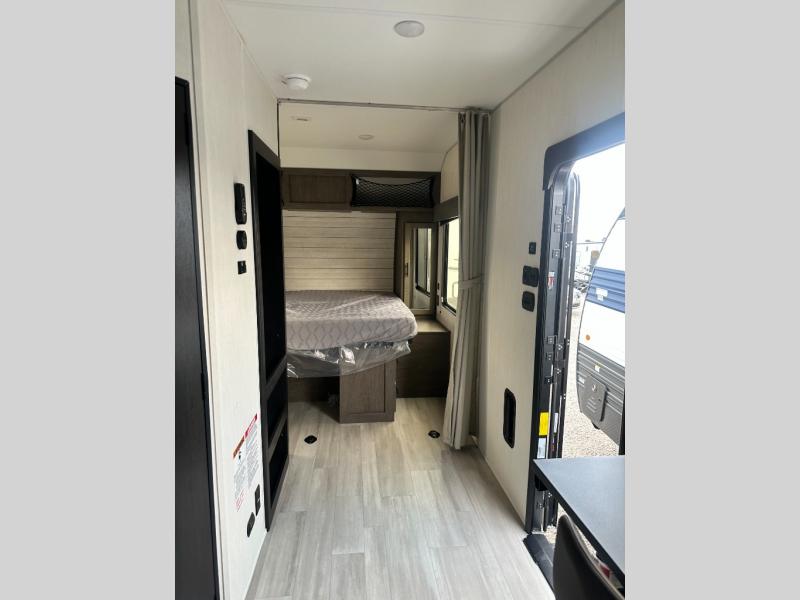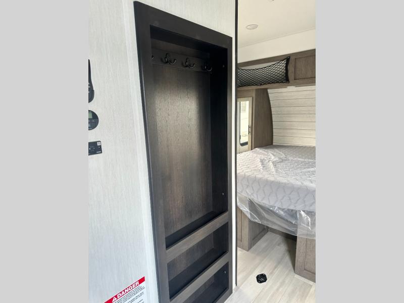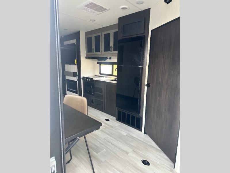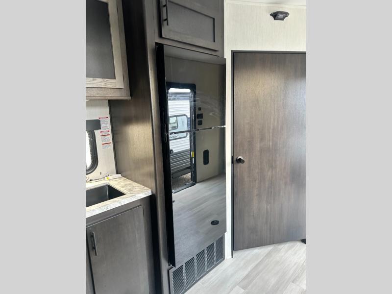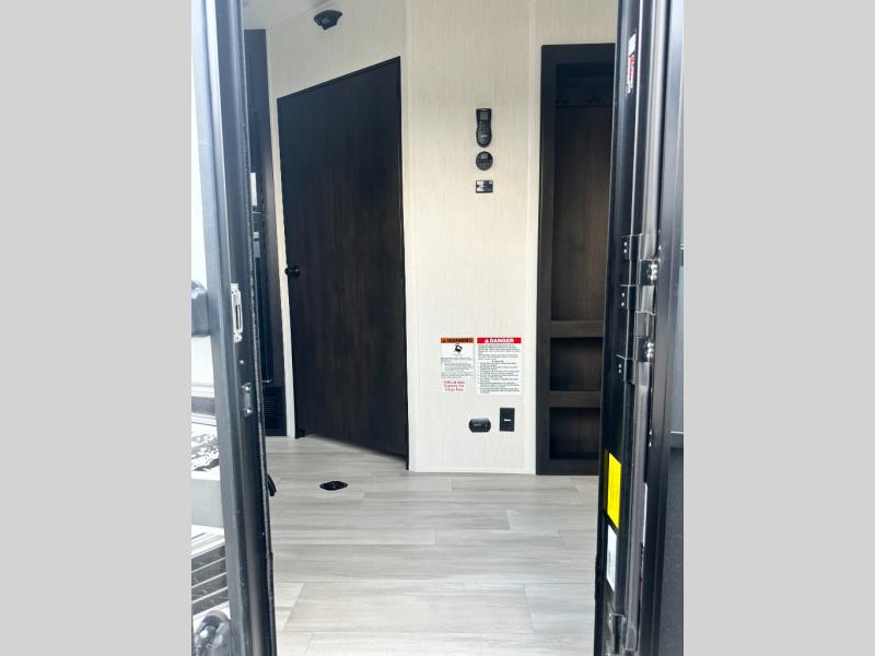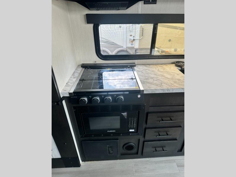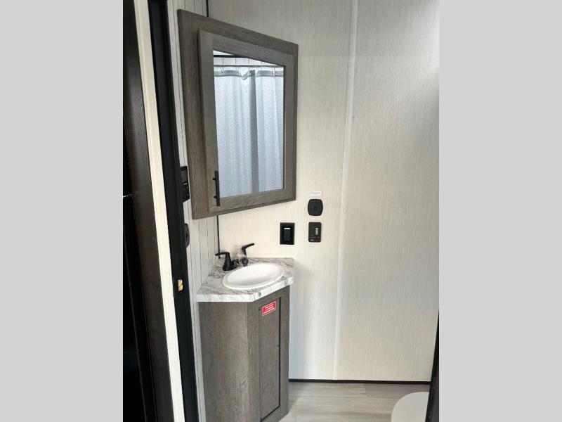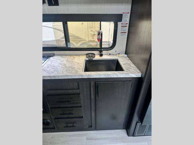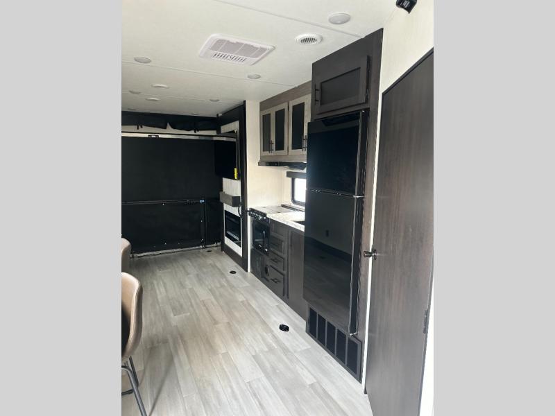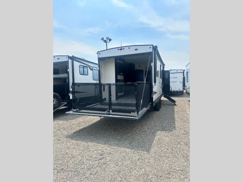 This toy hauler features 22' of total cargo space when you utilize the floor all the way up to the RV king bed. There is a flip-up counter with stools which will allow you to easily pack in gear when it's time to go home, and the ramp door makes for easy unloading. You can whip up meals each day with the full kitchen amenities, and the mid-coach full bath will let you freshen up after trail riding. This unit features ample storage space, including dual bedroom wardrobes, a hidden XL pantry behind the entertainment center, plus pass-through storage outside for fishing poles and more!