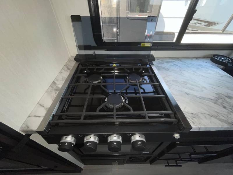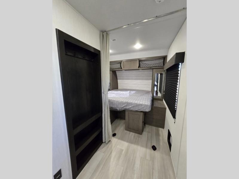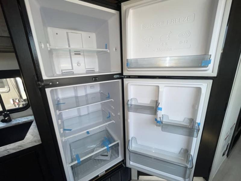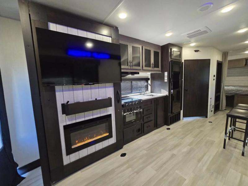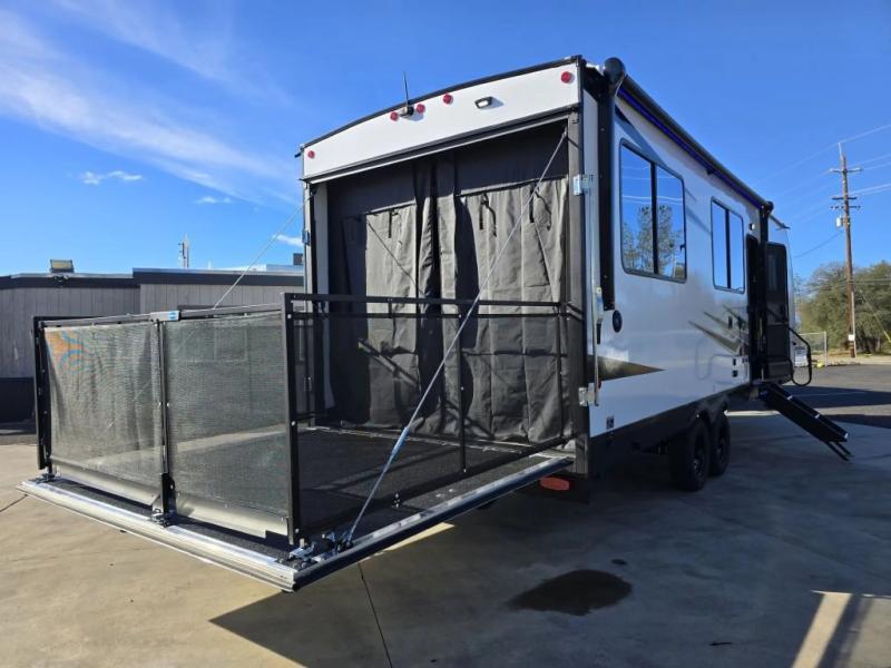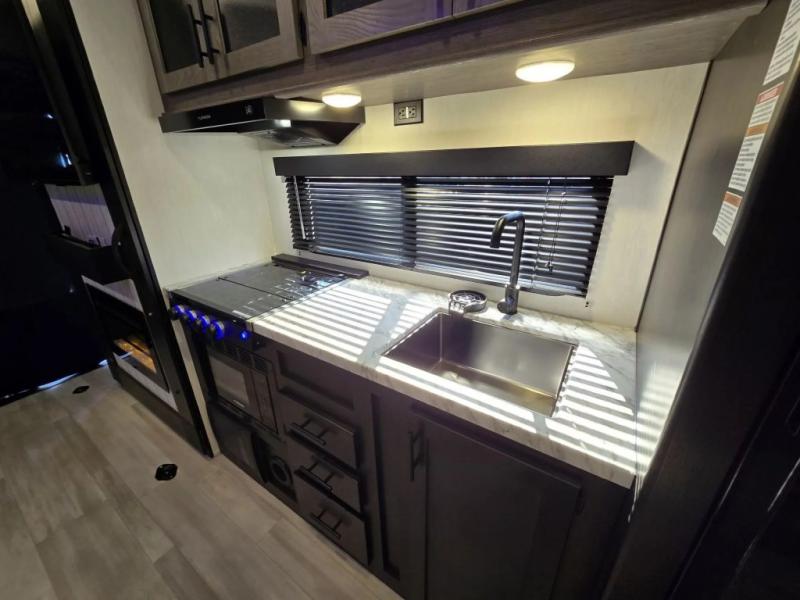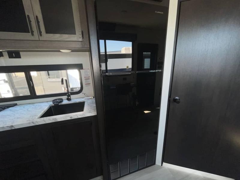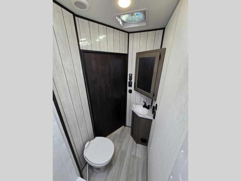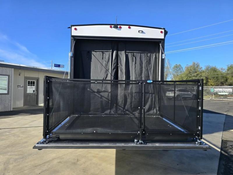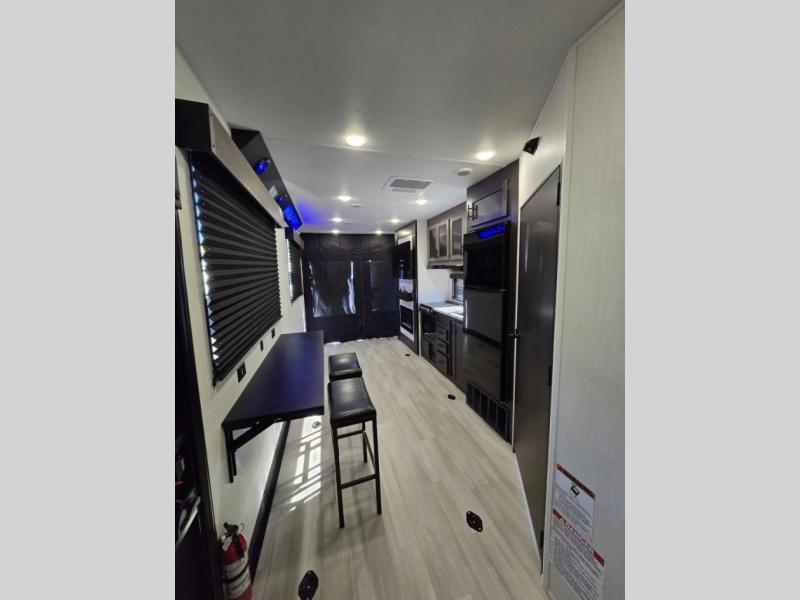 This toy hauler features 22' of total cargo space when you utilize the floor all the way up to the RV king bed. There is a flip-up counter with stools which will allow you to easily pack in gear when it's time to go home, and the ramp door makes for easy unloading. You can whip up meals each day with the full kitchen amenities, and the mid-coach full bath will let you freshen up after trail riding. This unit features ample storage space, including dual bedroom wardrobes, a hidden XL pantry behind the entertainment center, plus pass-through storage outside for fishing poles and more!