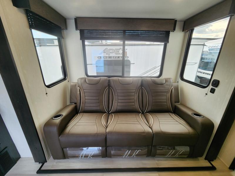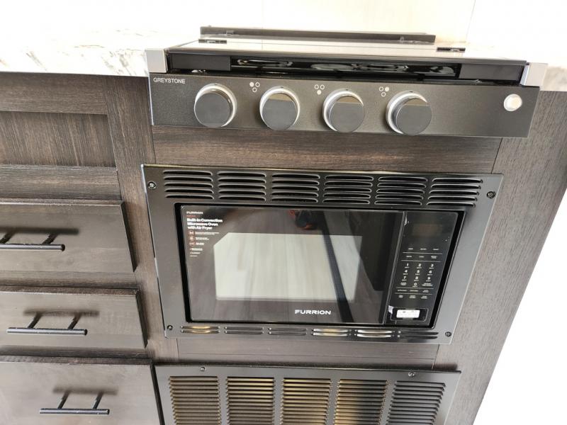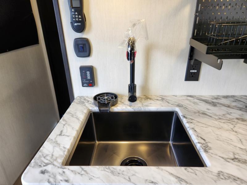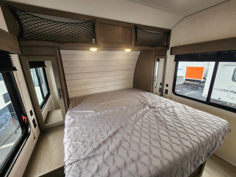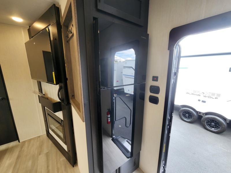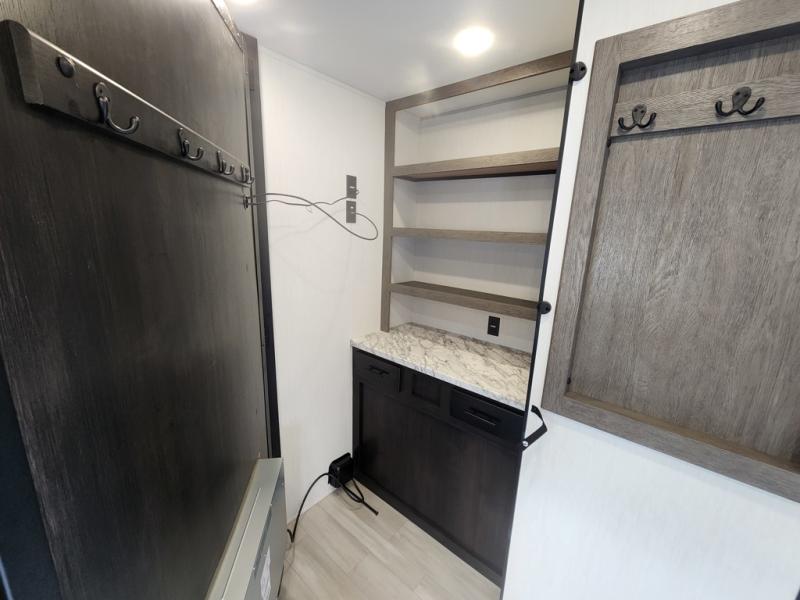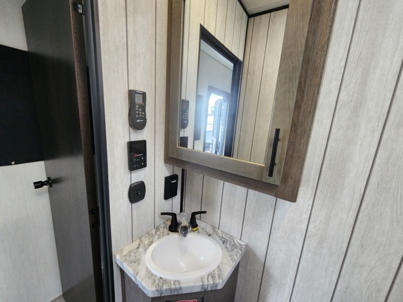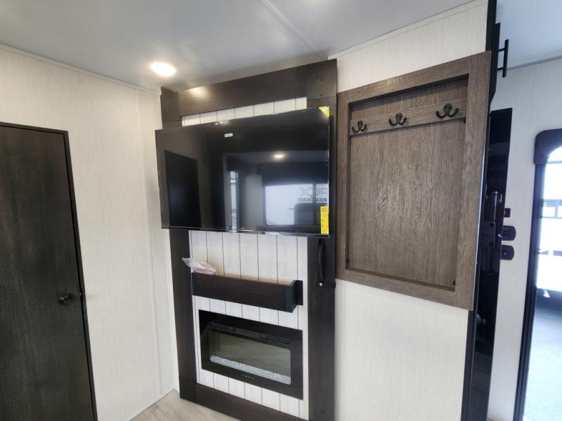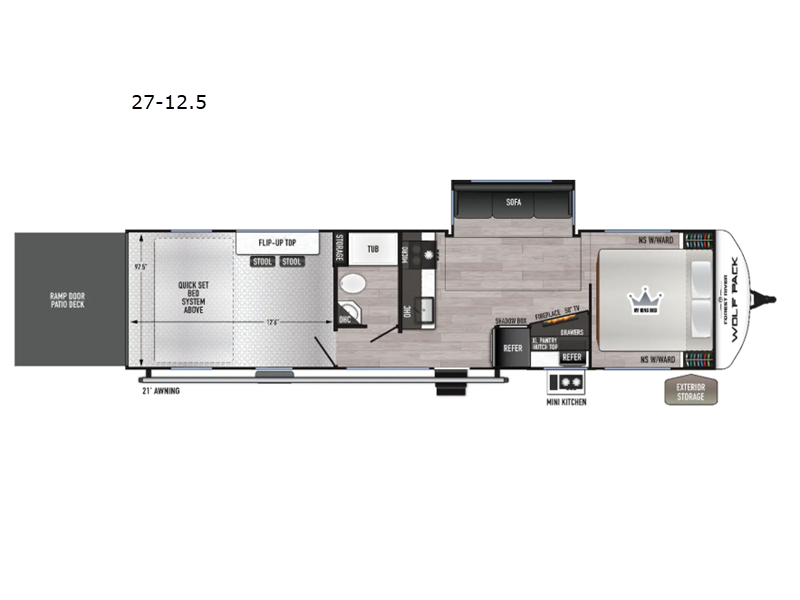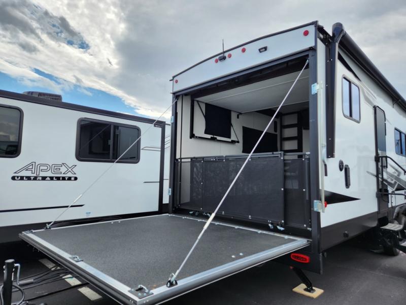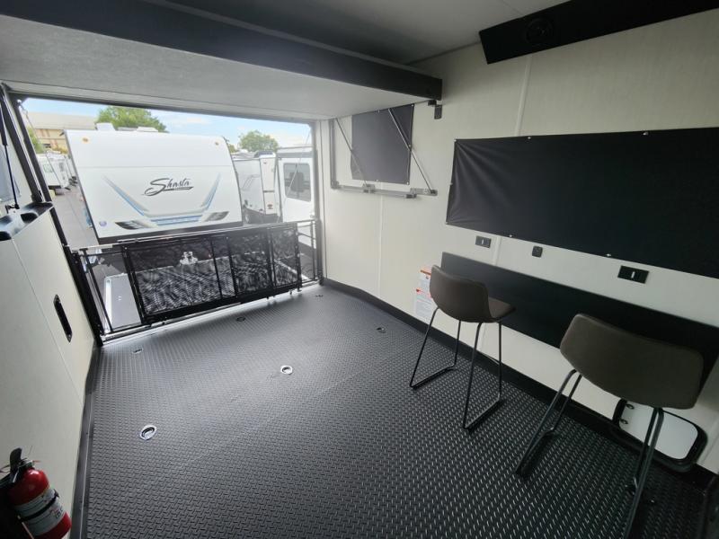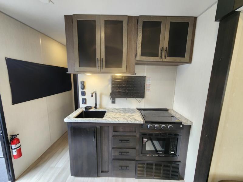 You can't go wrong in this spacious toy hauler with a 12' 6" garage! There is a flip-up counter with stools where you can eat each day, or you can take your plate outdoors to eat under the 21' power awning. A quick set bed system is also found in the garage to give guests a place to sleep! The combined kitchen and living area includes a sofa slide out, appliances to make meals each day, and an entertainment center with a fireplace. There is also an XL pantry and drawers hidden behind the TV for smart storage spaces. The RV king bed is sure to provide a great night's rest, and there are dual nightstands and dual wardrobes to keep your things tidy.