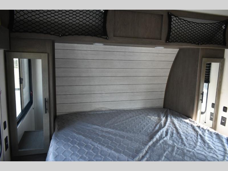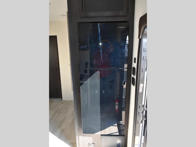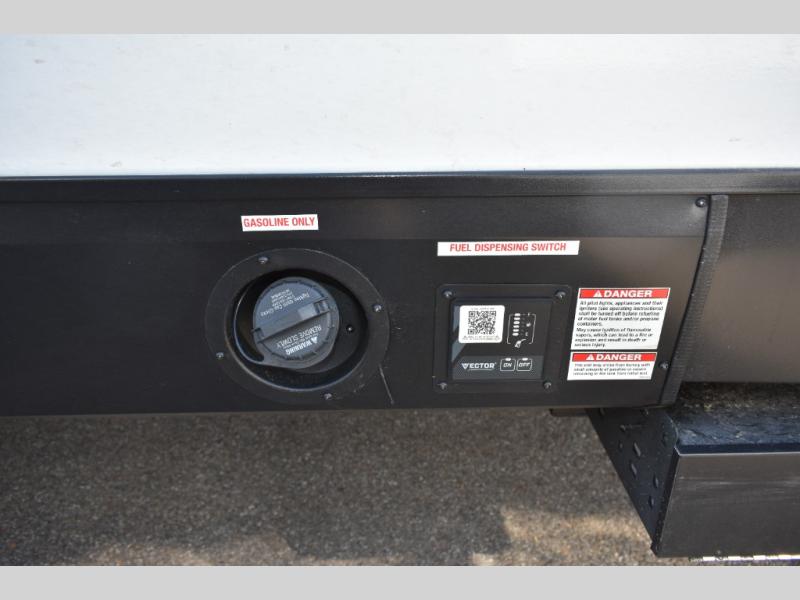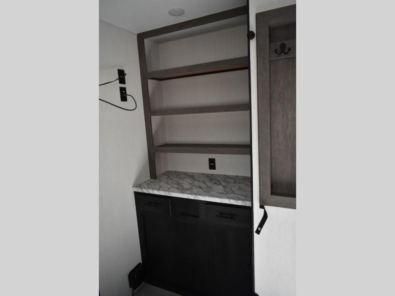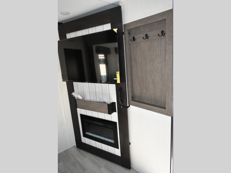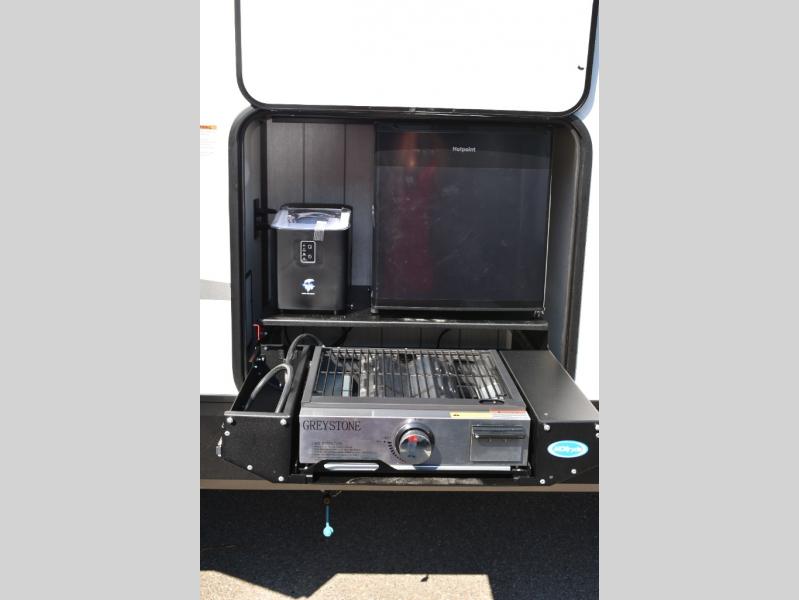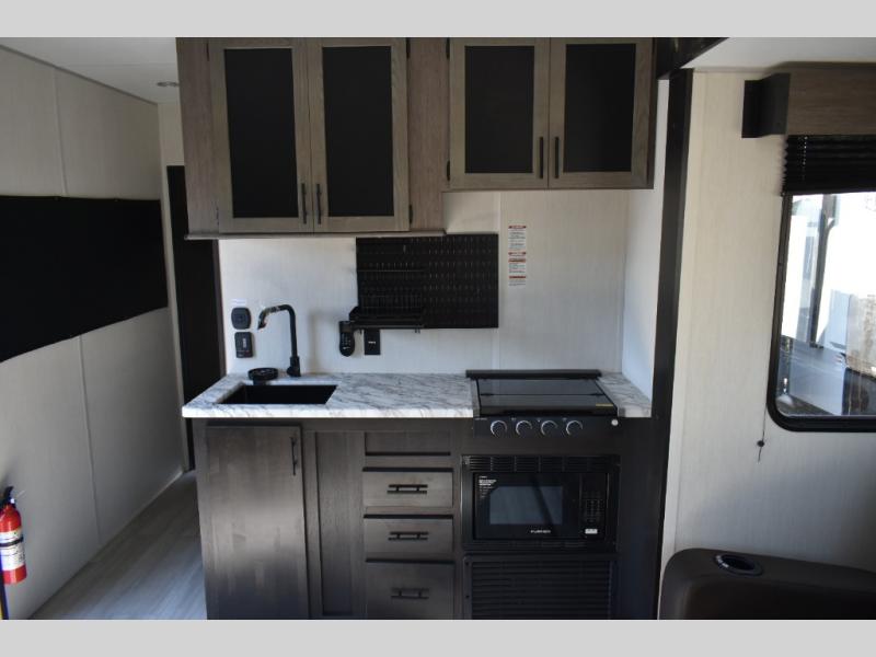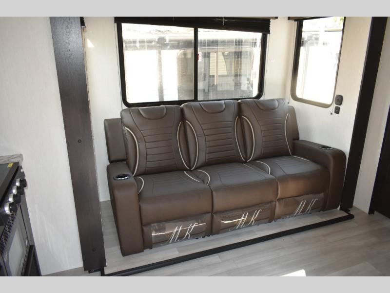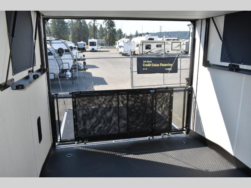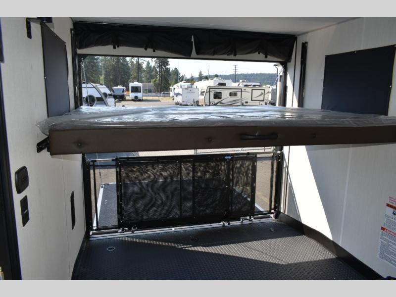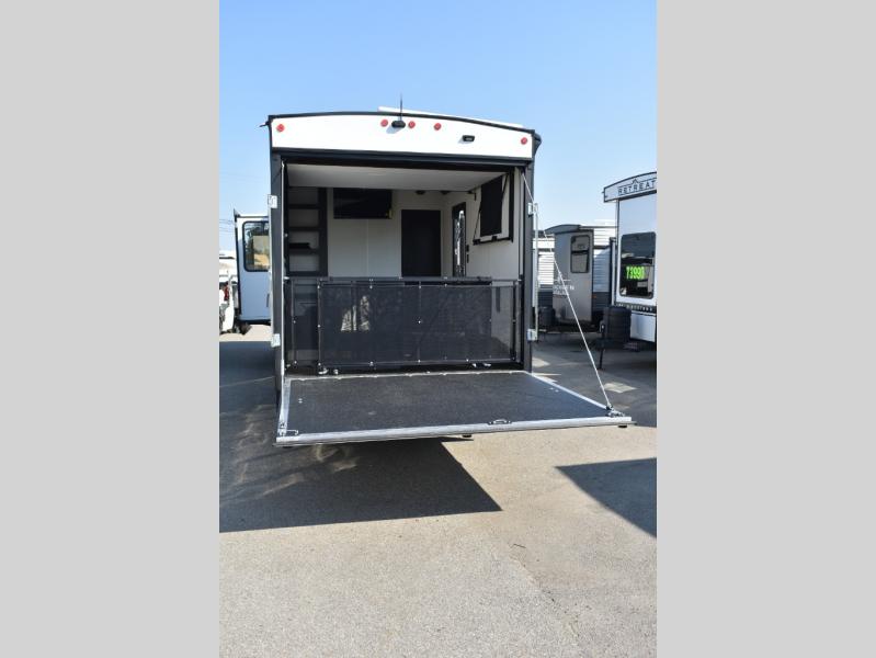 You can't go wrong in this spacious toy hauler with a 12' 6" garage! There is a flip-up counter with stools where you can eat each day, or you can take your plate outdoors to eat under the 21' power awning. A quick set bed system is also found in the garage to give guests a place to sleep! The combined kitchen and living area includes a sofa slide out, appliances to make meals each day, and an entertainment center with a fireplace. There is also an XL pantry and drawers hidden behind the TV for smart storage spaces. The RV king bed is sure to provide a great night's rest, and there are dual nightstands and dual wardrobes to keep your things tidy.