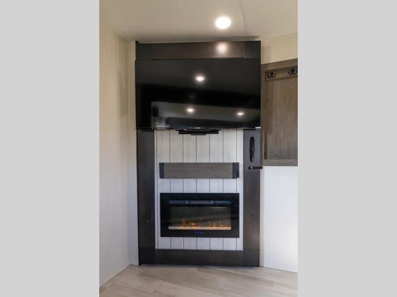 You can't go wrong in this spacious toy hauler with a 12' 6" garage! There is a flip-up counter with stools where you can eat each day, or you can take your plate outdoors to eat under the 21' power awning. A quick set bed system is also found in the garage to give guests a place to sleep! The combined kitchen and living area includes a sofa slide out, appliances to make meals each day, and an entertainment center with a fireplace. There is also an XL pantry and drawers hidden behind the TV for smart storage spaces. The RV king bed is sure to provide a great night's rest, and there are dual nightstands and dual wardrobes to keep your things tidy.