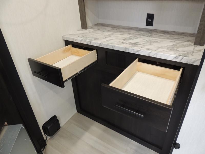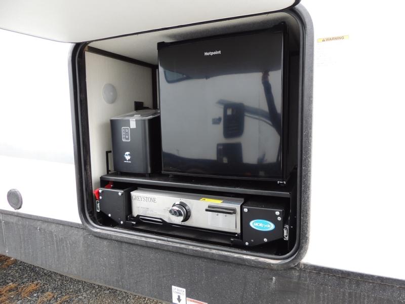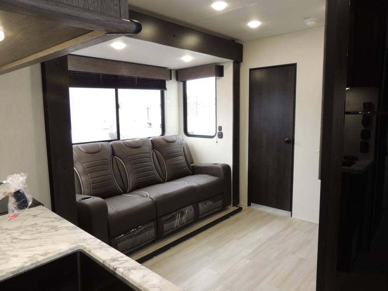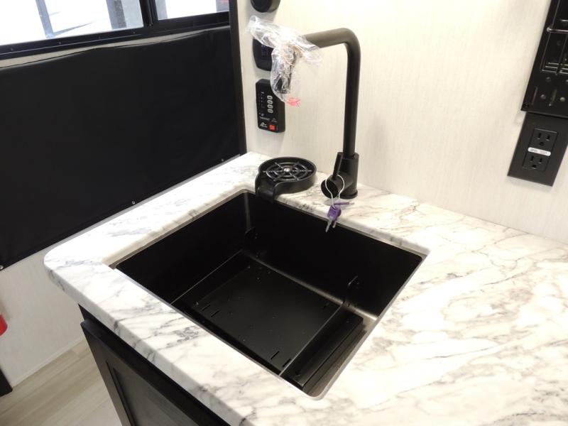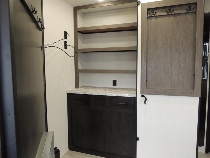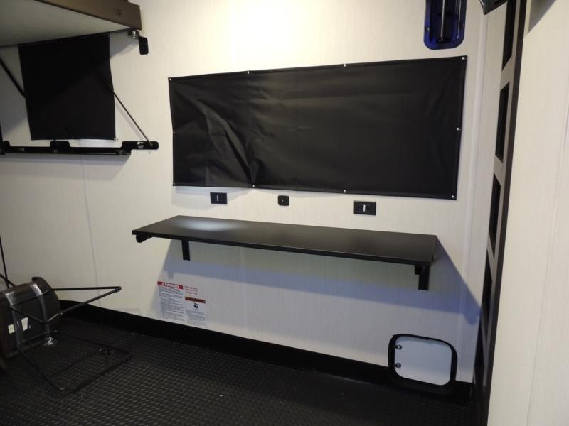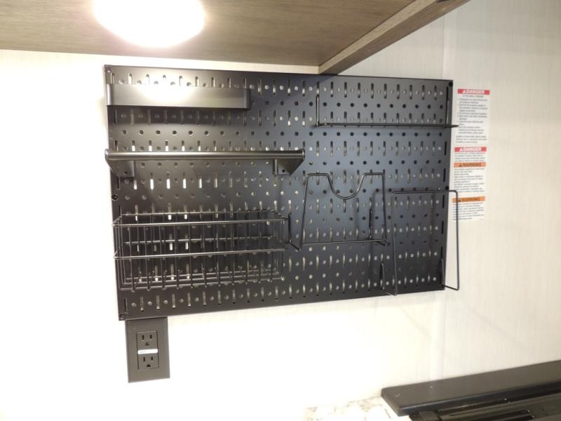 You can't go wrong in this spacious toy hauler with a 12' 6" garage! There is a flip-up counter with stools where you can eat each day, or you can take your plate outdoors to eat under the 21' power awning. A quick set bed system is also found in the garage to give guests a place to sleep! The combined kitchen and living area includes a sofa slide out, appliances to make meals each day, and an entertainment center with a fireplace. There is also an XL pantry and drawers hidden behind the TV for smart storage spaces. The RV king bed is sure to provide a great night's rest, and there are dual nightstands and dual wardrobes to keep your things tidy.