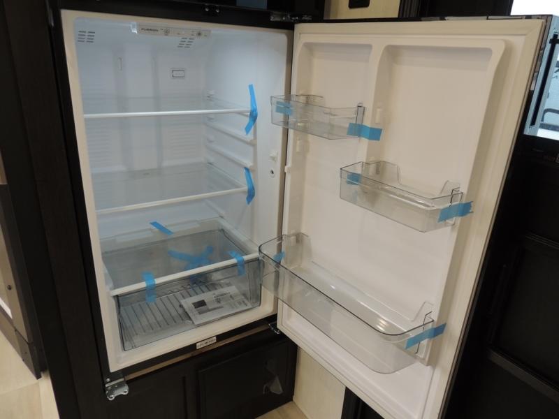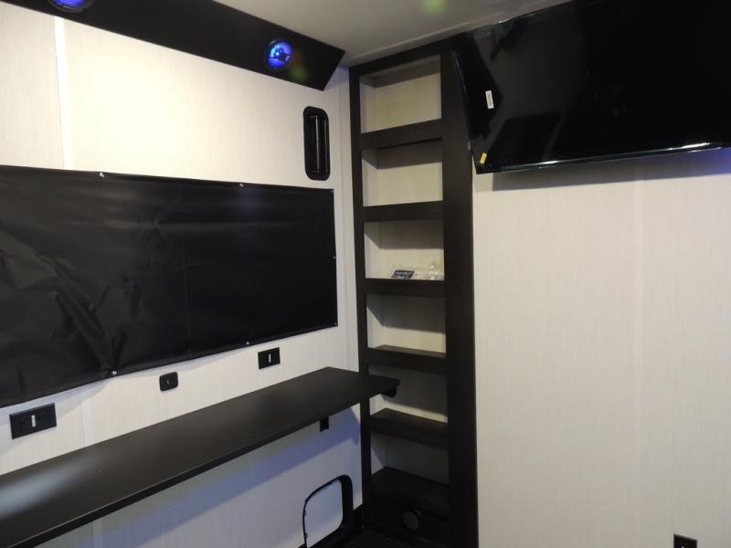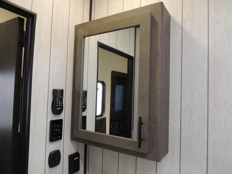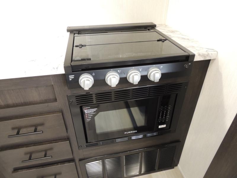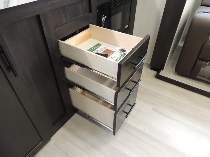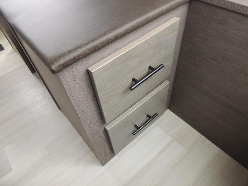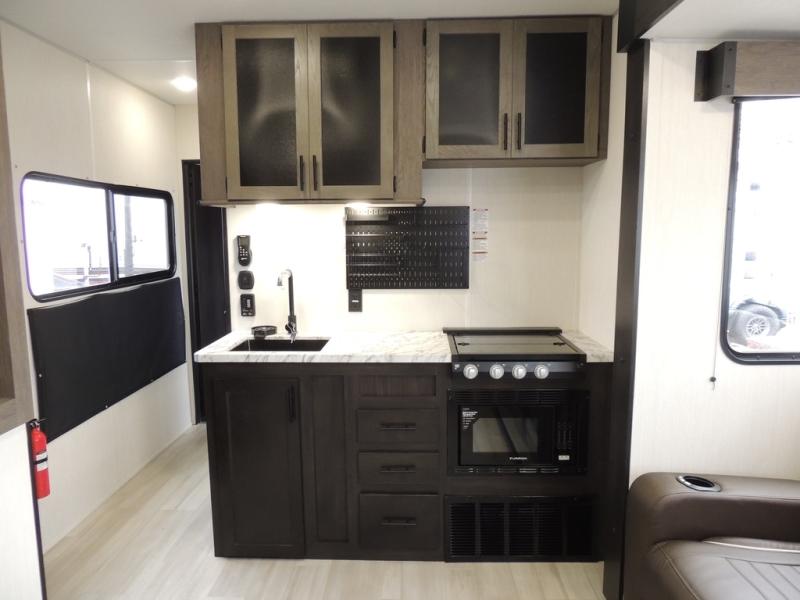 You can't go wrong in this spacious toy hauler with a 12' 6" garage! There is a flip-up counter with stools where you can eat each day, or you can take your plate outdoors to eat under the 21' power awning. A quick set bed system is also found in the garage to give guests a place to sleep! The combined kitchen and living area includes a sofa slide out, appliances to make meals each day, and an entertainment center with a fireplace. There is also an XL pantry and drawers hidden behind the TV for smart storage spaces. The RV king bed is sure to provide a great night's rest, and there are dual nightstands and dual wardrobes to keep your things tidy.