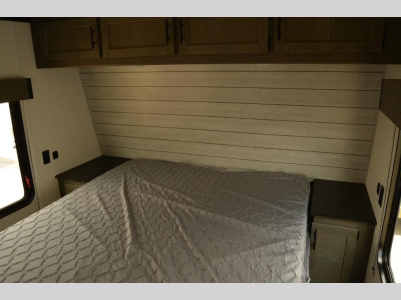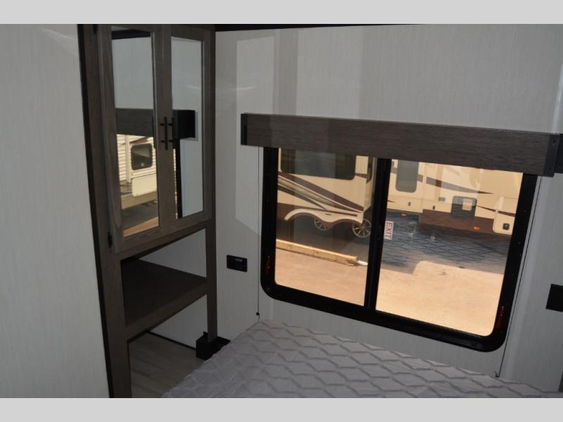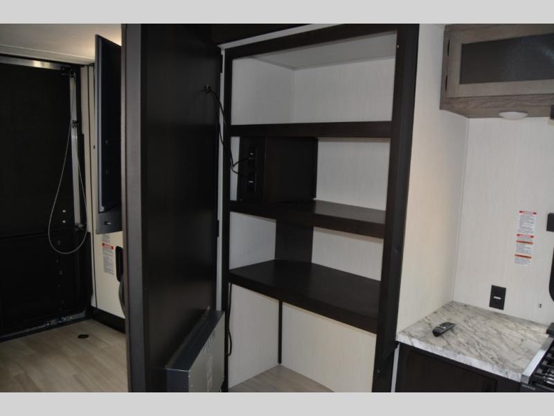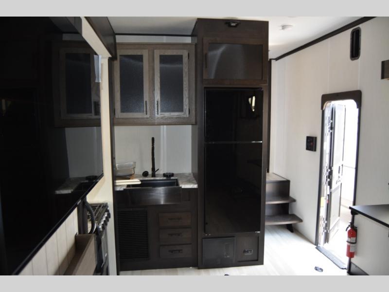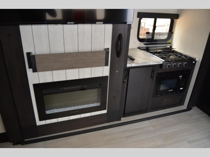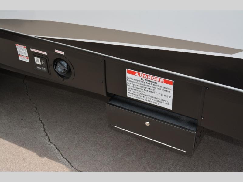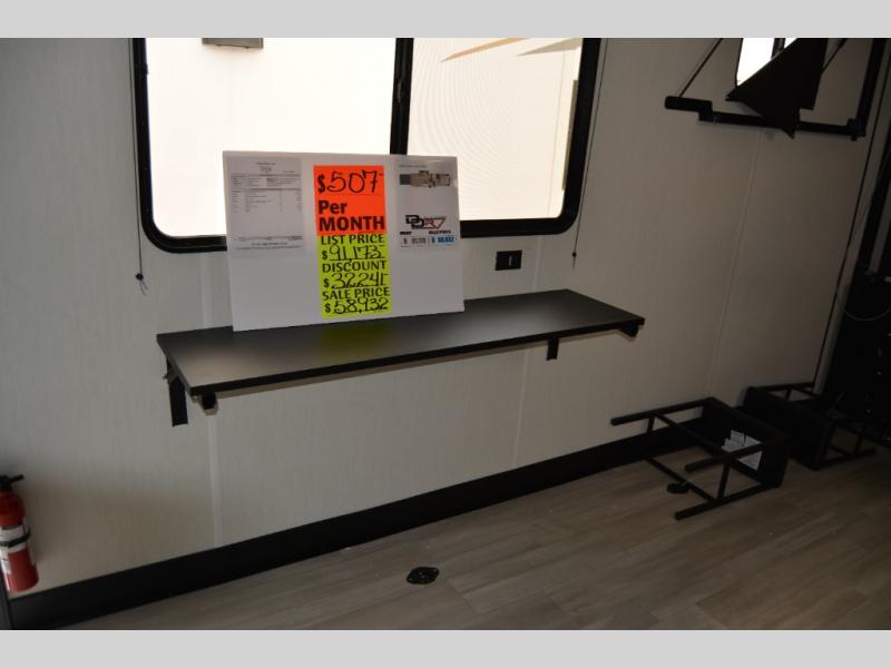 This toy hauler has everything you and your partner need to have a fantastic experience on the road! Unwind in the front bedroom, fitted with a large king bed, overhead cabinets, and wardrobes on each side of the bed, perfect for keeping all your clothes organized. A full bathroom is at your disposal boasting a washer and dryer prep ideal for keeping your best outfits nice and clean. In the kitchen area, you will find a 12V refrigerator, overhead cabinets, a pantry, a microwave, a TV with a fireplace, and a flip-up top within stools, best for having breakfast each morning.
