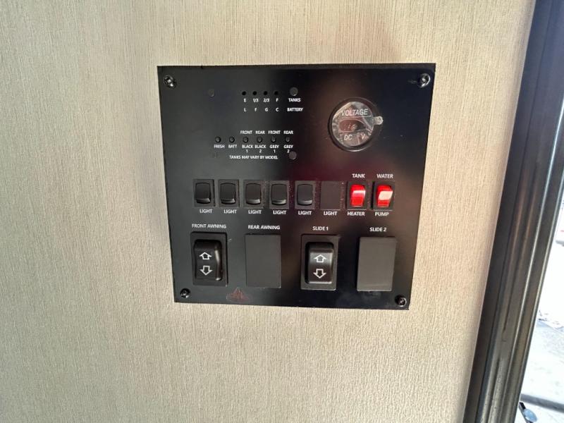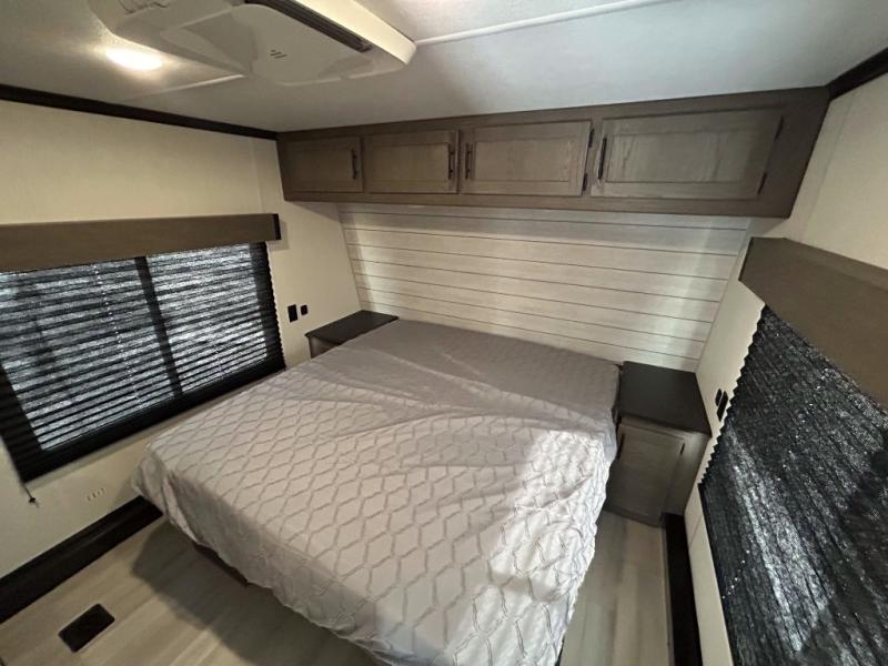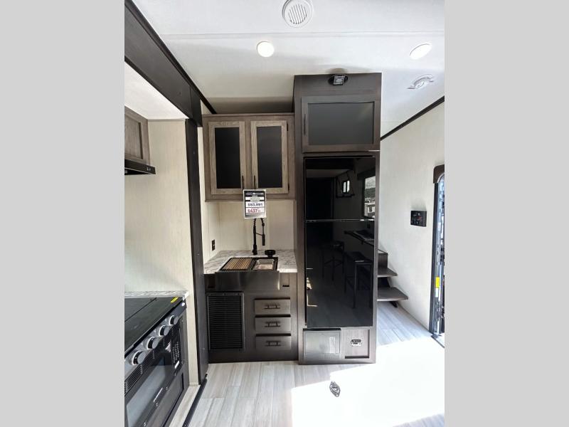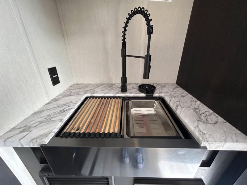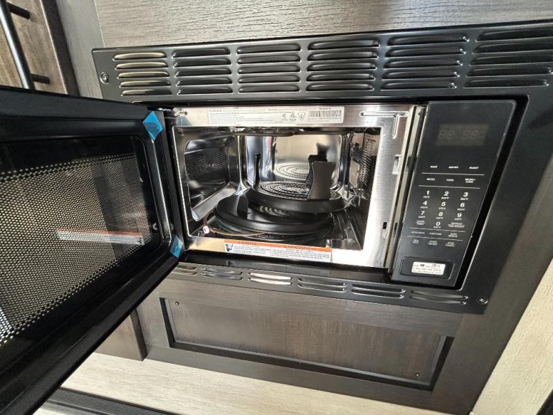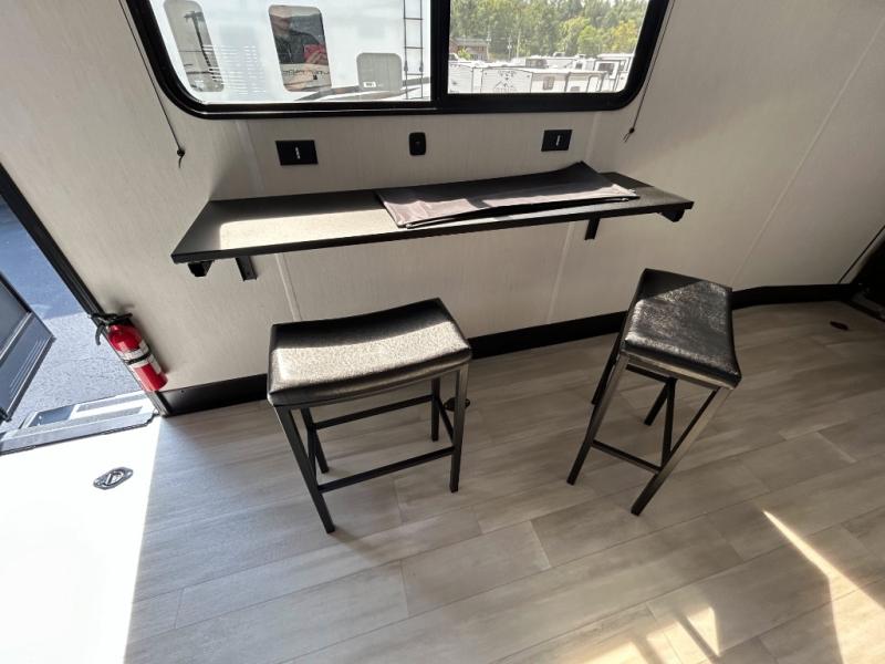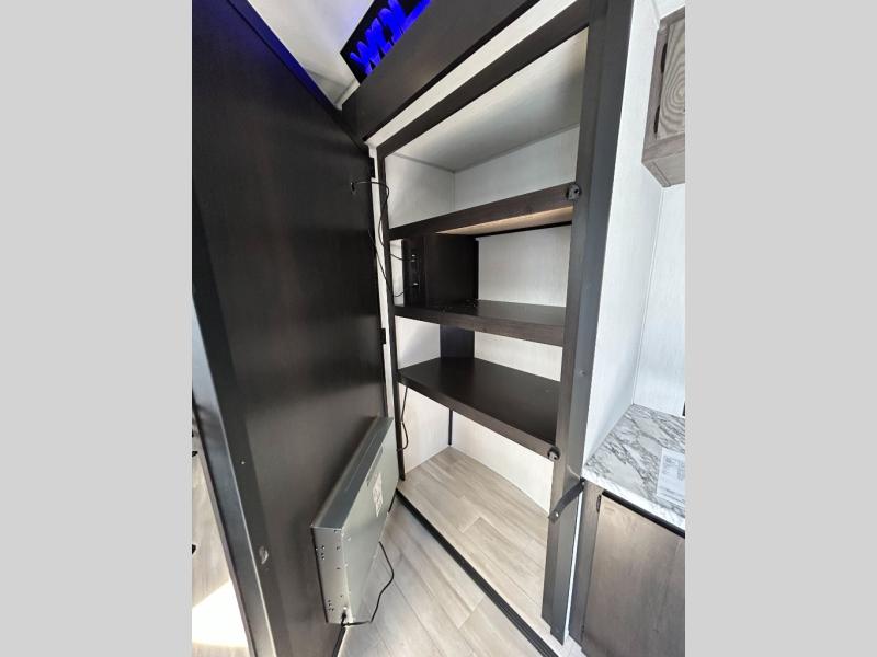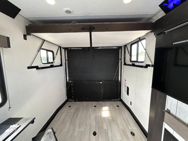 This toy hauler has everything you and your partner need to have a fantastic experience on the road! Unwind in the front bedroom, fitted with a large RV king bed, overhead cabinets, and nightstands on each side of the bed, perfect for keeping all your clothes organized. There is also a wardrobe with washer and dryer prep if you choose to add these appliances. In the kitchen area, you will find a 12V refrigerator, overhead cabinets, an XL pantry, a microwave, and a swinging entertainment center with a fireplace. There is also a flip-up table with stools where you can dine together. And your guests can sleep on the quick set bed system in the garage!