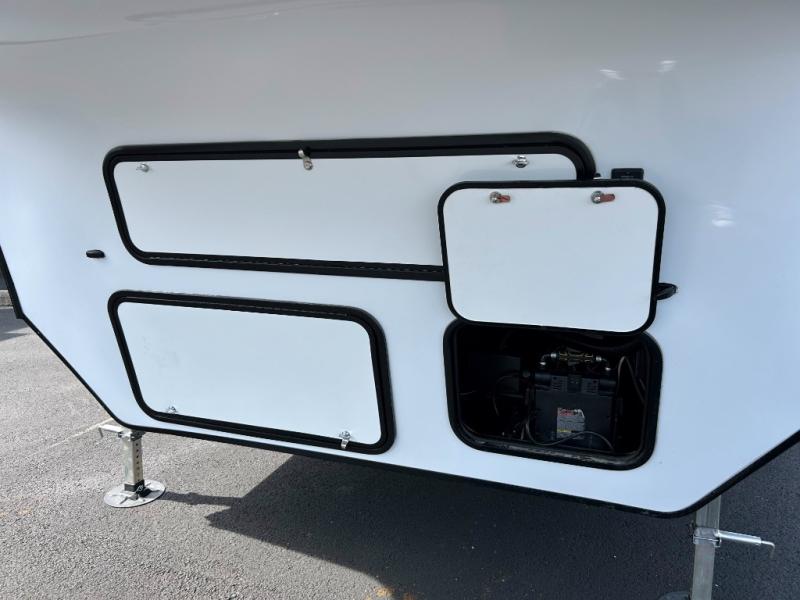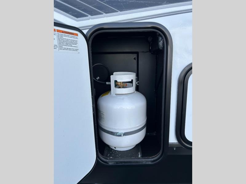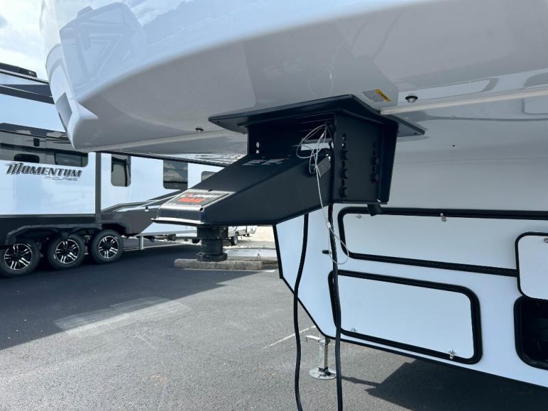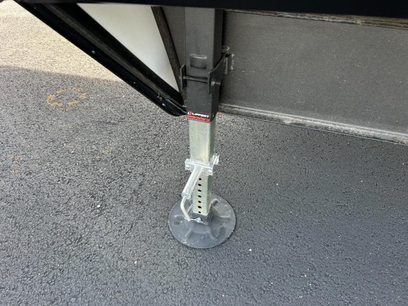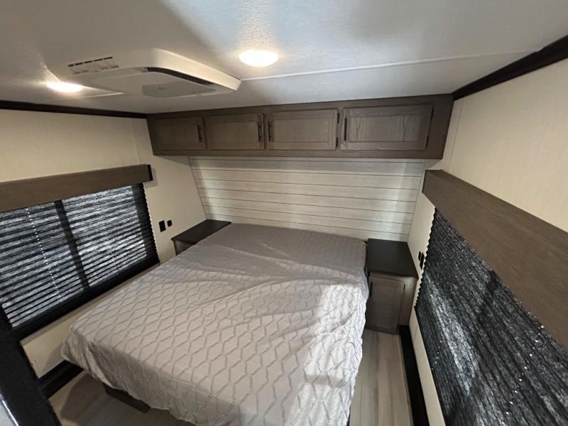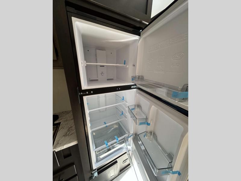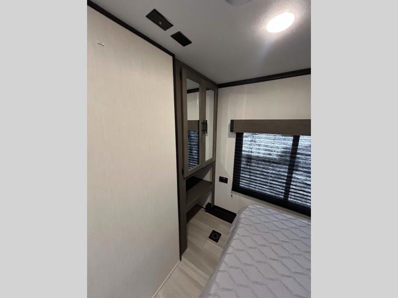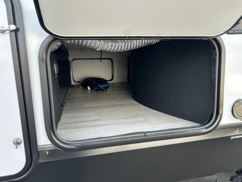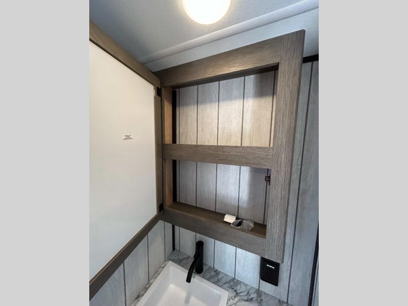 This toy hauler has everything you and your partner need to have a fantastic experience on the road! Unwind in the front bedroom, fitted with a large RV king bed, overhead cabinets, and nightstands on each side of the bed, perfect for keeping all your clothes organized. There is also a wardrobe with washer and dryer prep if you choose to add these appliances. In the kitchen area, you will find a 12V refrigerator, overhead cabinets, an XL pantry, a microwave, and a swinging entertainment center with a fireplace. There is also a flip-up table with stools where you can dine together. And your guests can sleep on the quick set bed system in the garage!