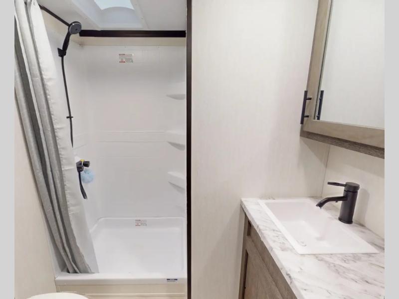 With any Cherokee Wolf Pack toy hauler by Forest River, you will enjoy never-ending adventures. You'll appreciate the 8' 6" wide body design so you can bring along toys and gear, and there is a high-output LED loading light for added convenience when you're getting back to camp late. There is real wood cabinet doors and drawers inside and LED lights to keep your space well lit. These toy haulers are built with tongue and groove plywood main floors and a forced air heated underbelly and enclosed holding tanks that will help you extend your camping season.